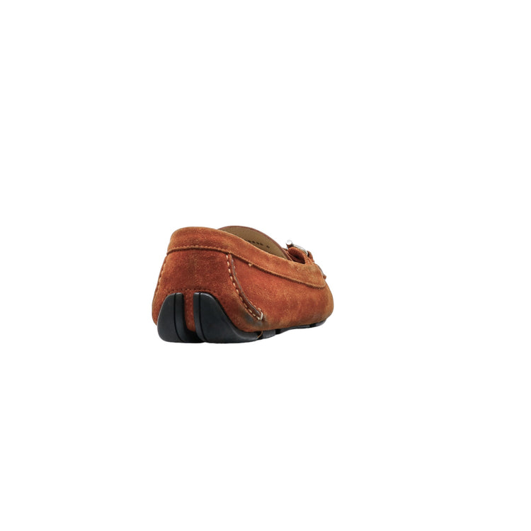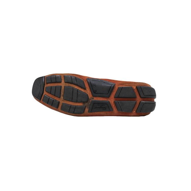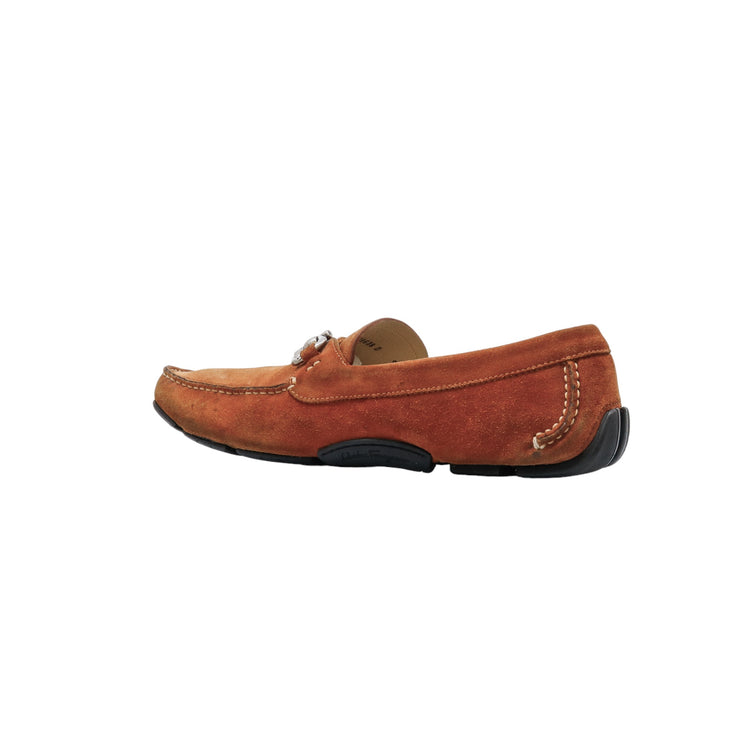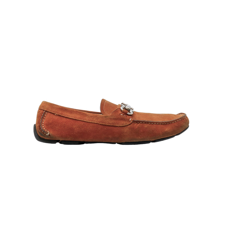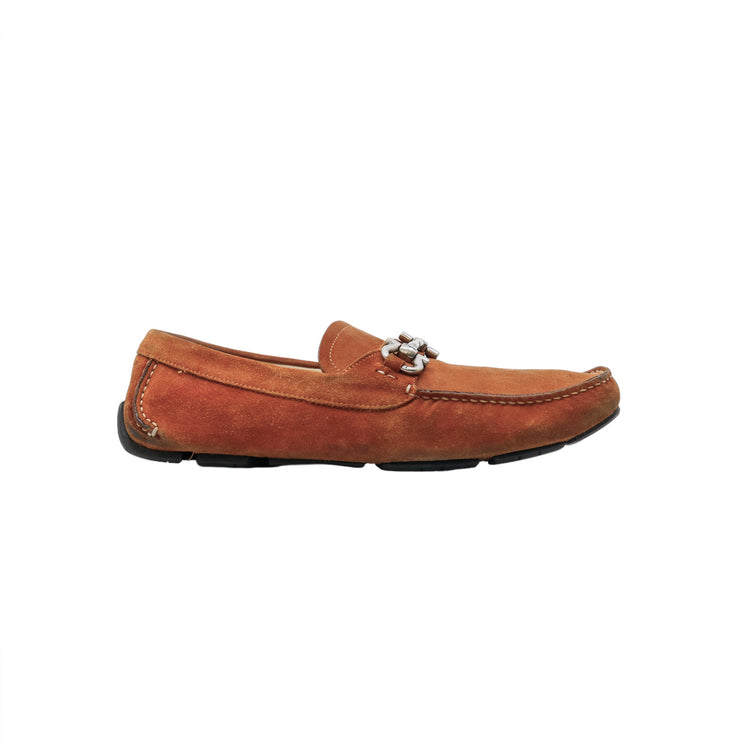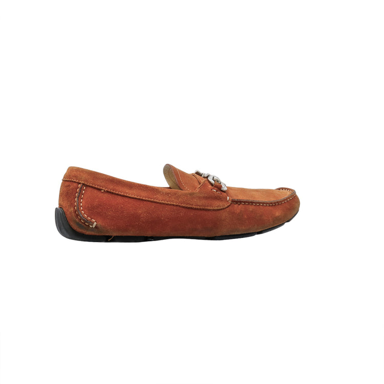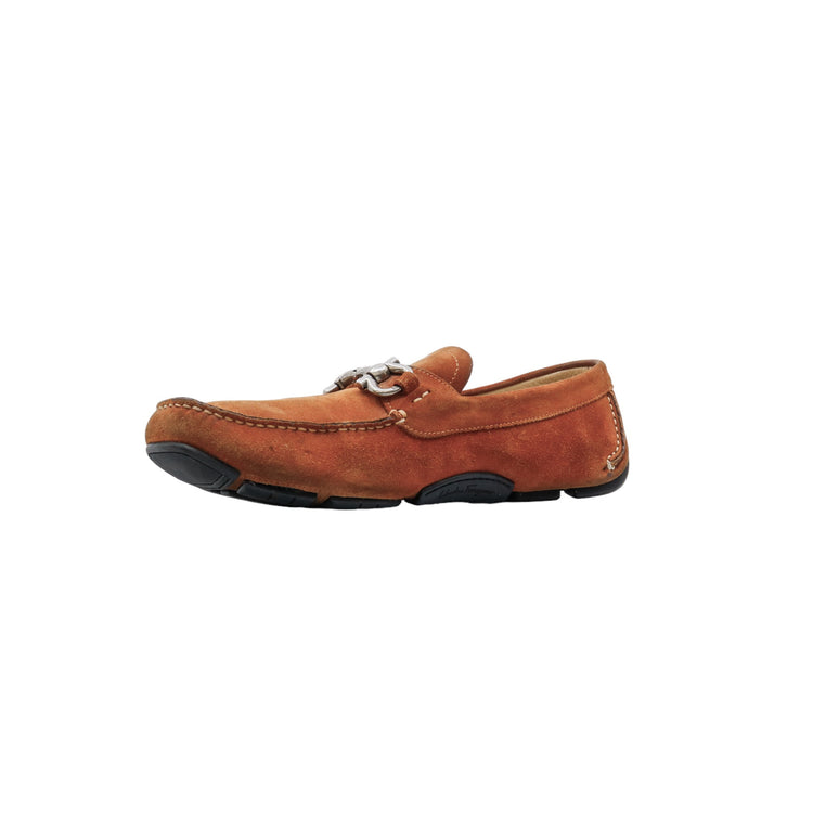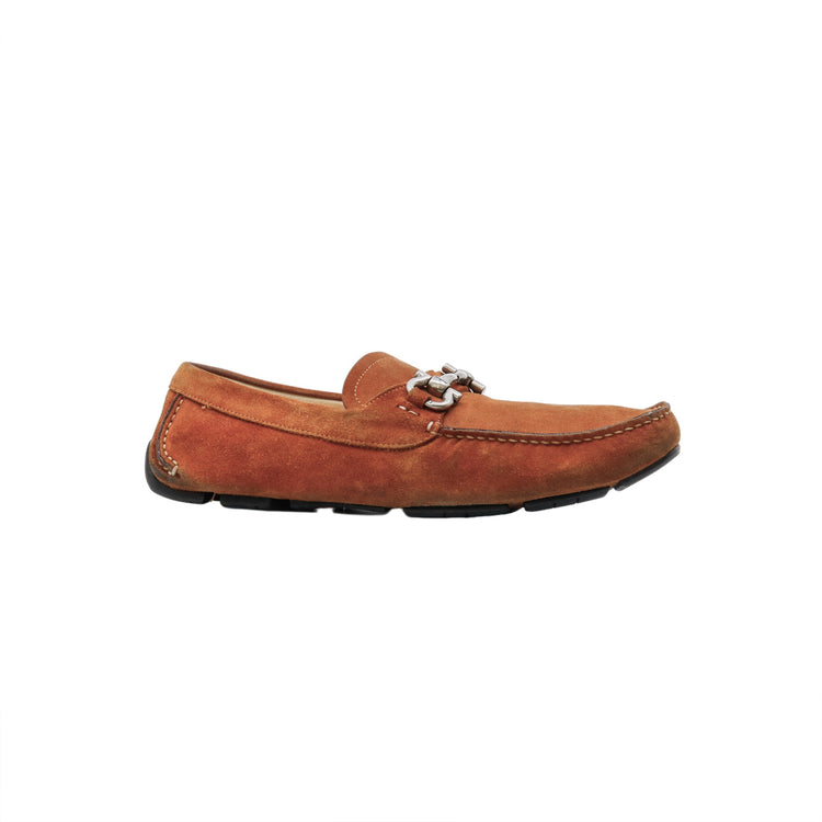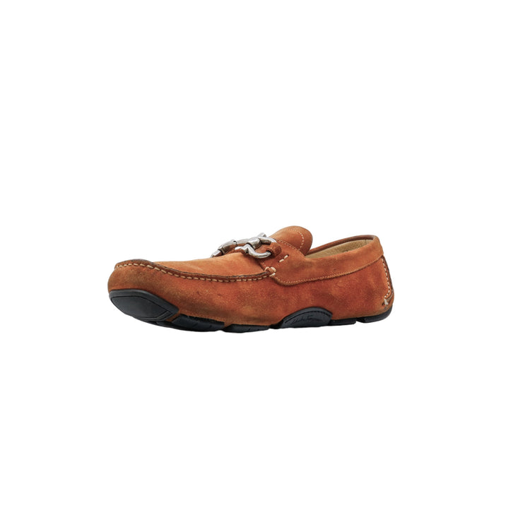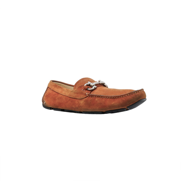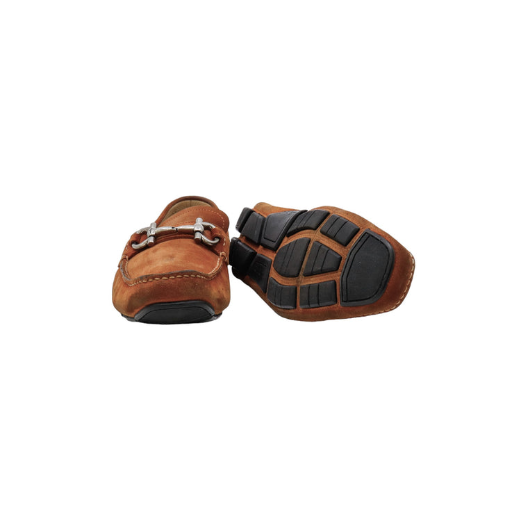 Mocasines Salvatore Ferragamo elaborados en gamuza color café, suela de goma, rematado con herraje logo Gancini en color plata, manchas leves, desgaste por uso regular.