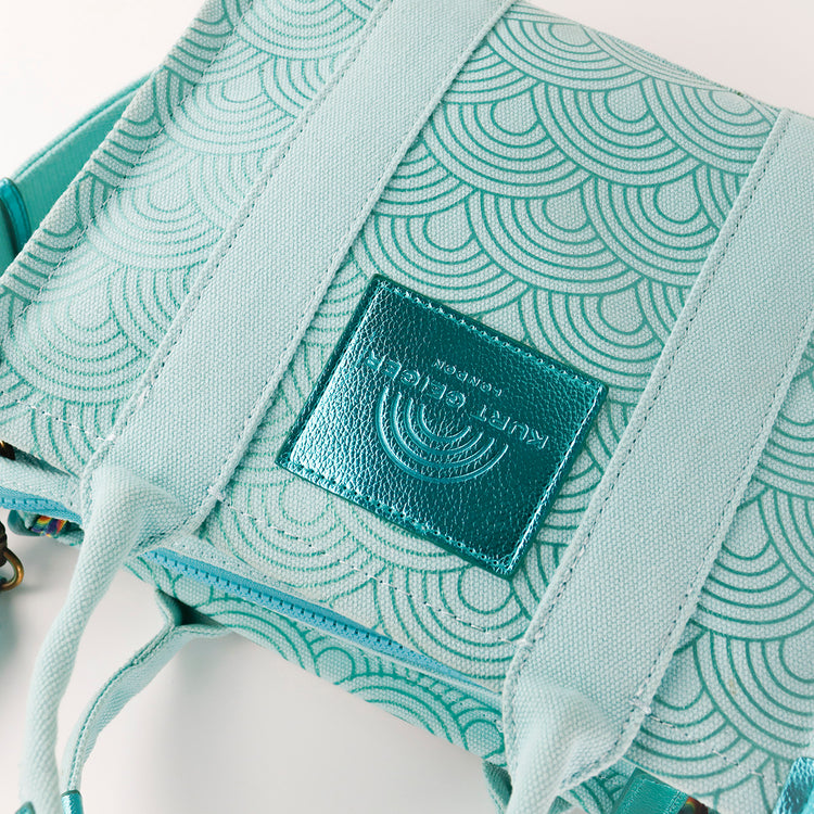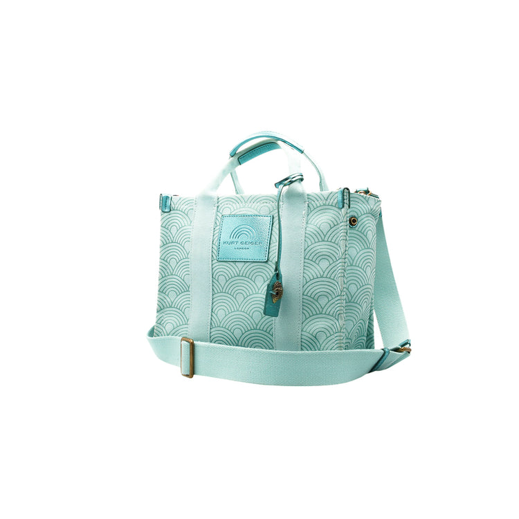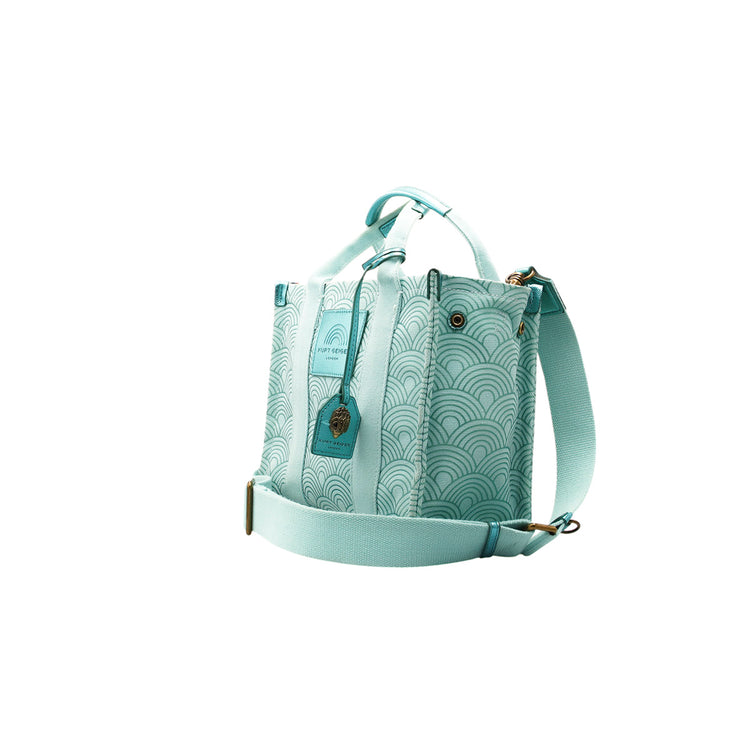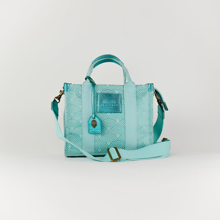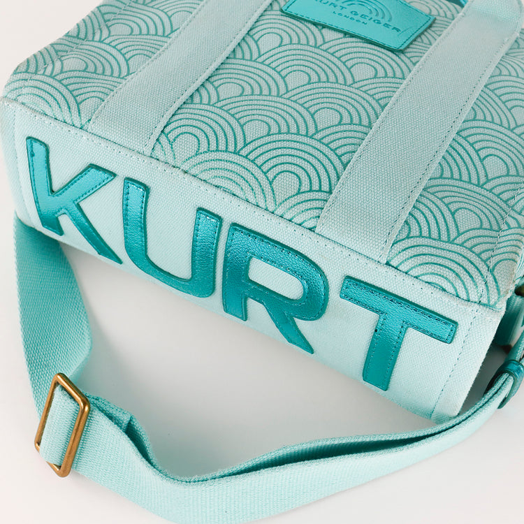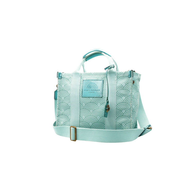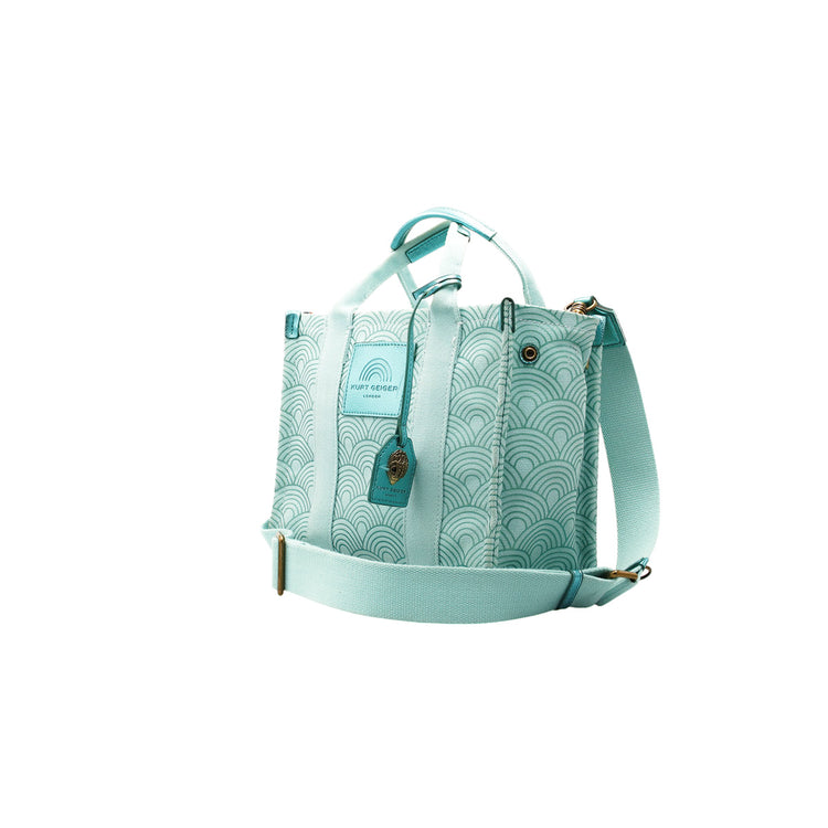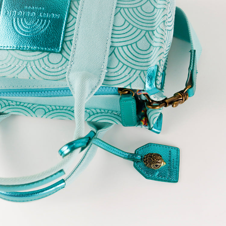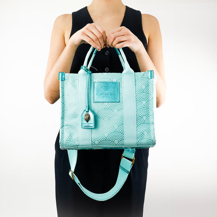Bolso tipo tote marca Kurt Geiger de la colección Southbank Arcoiris, confeccionado lona color verde aqua, con ribetes y detalles de asas en piel color metálico, herrajes y cabeza de águila en color bronce, sucia por dentro, cremallera de plástico.