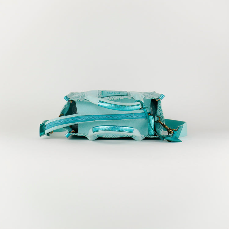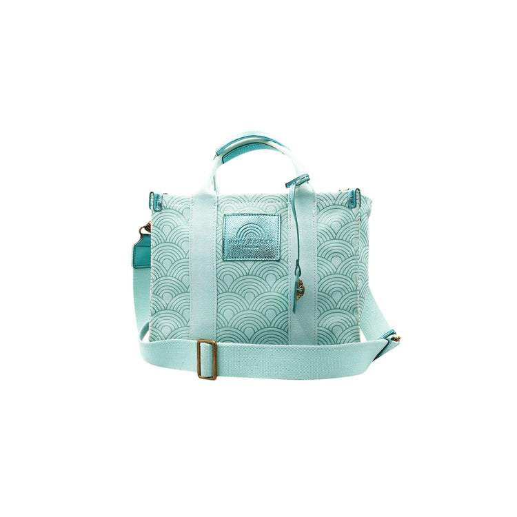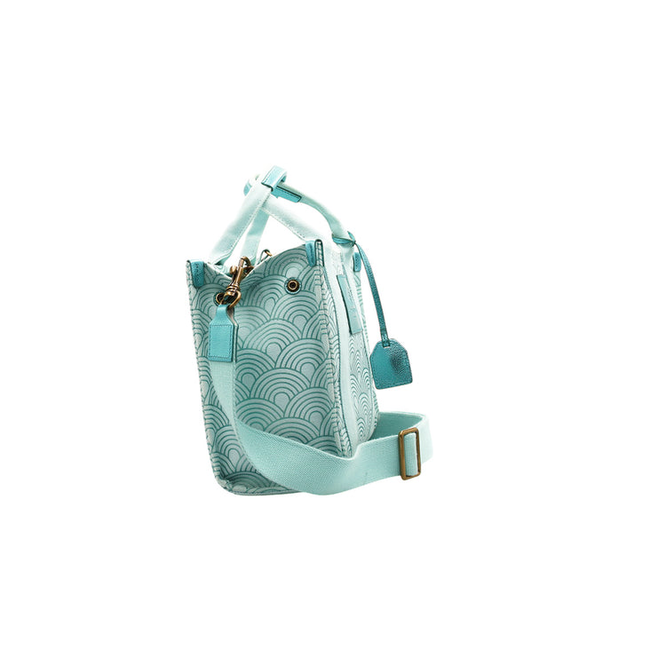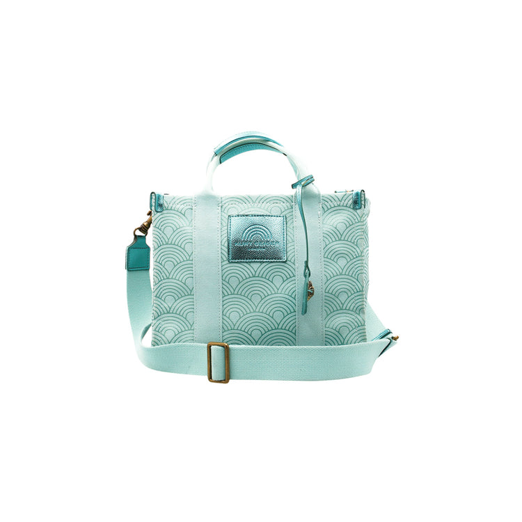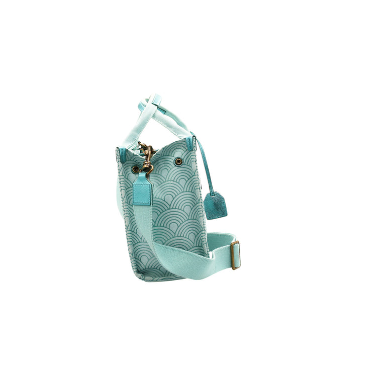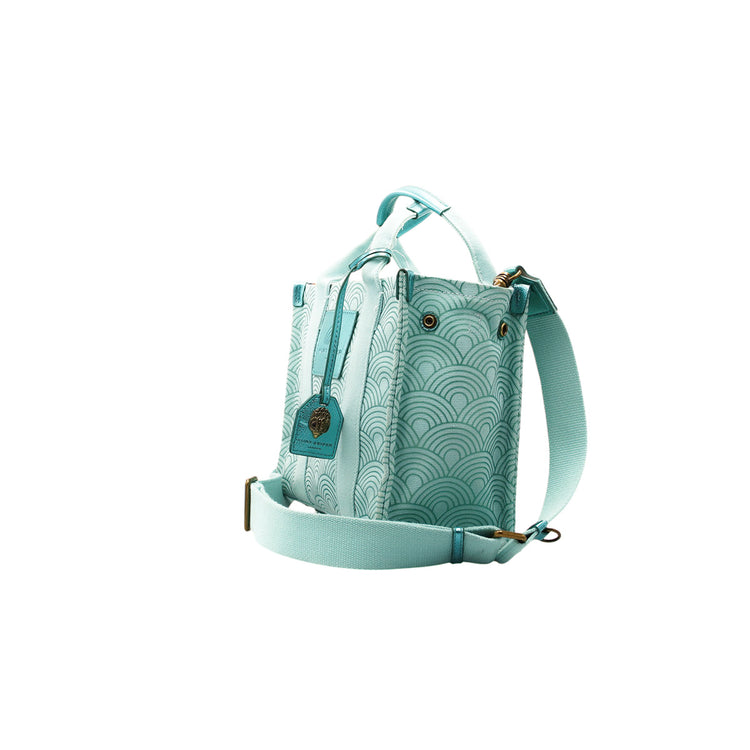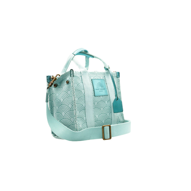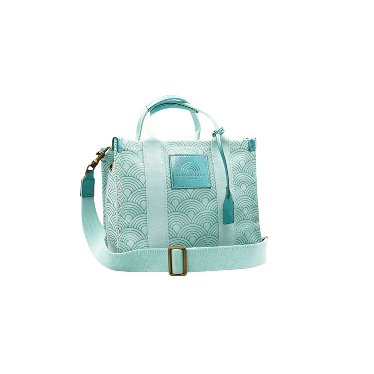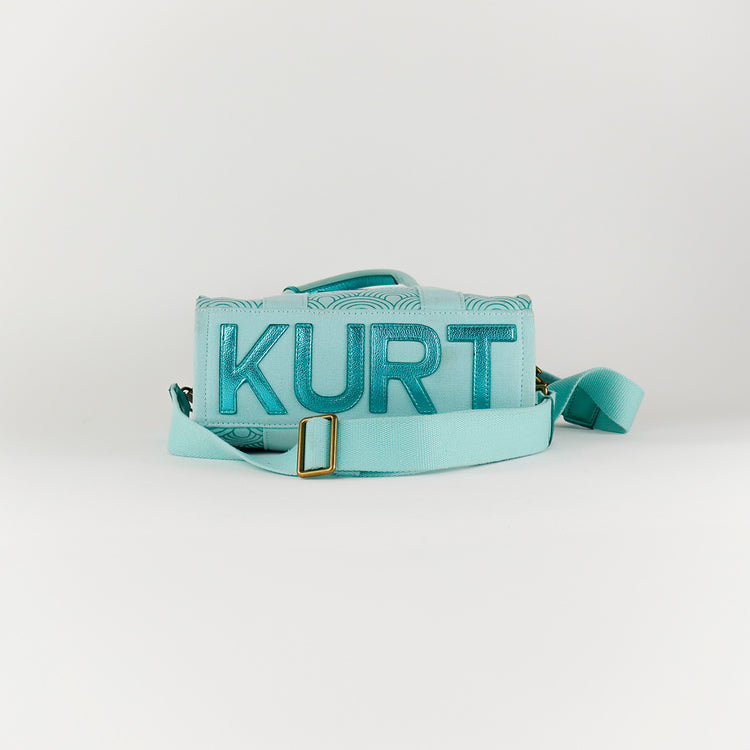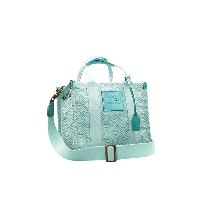 Bolso tipo tote marca Kurt Geiger de la colección Southbank Arcoiris, confeccionado lona color verde aqua, con ribetes y detalles de asas en piel color metálico, herrajes y cabeza de águila en color bronce, sucia por dentro, cremallera de plástico.