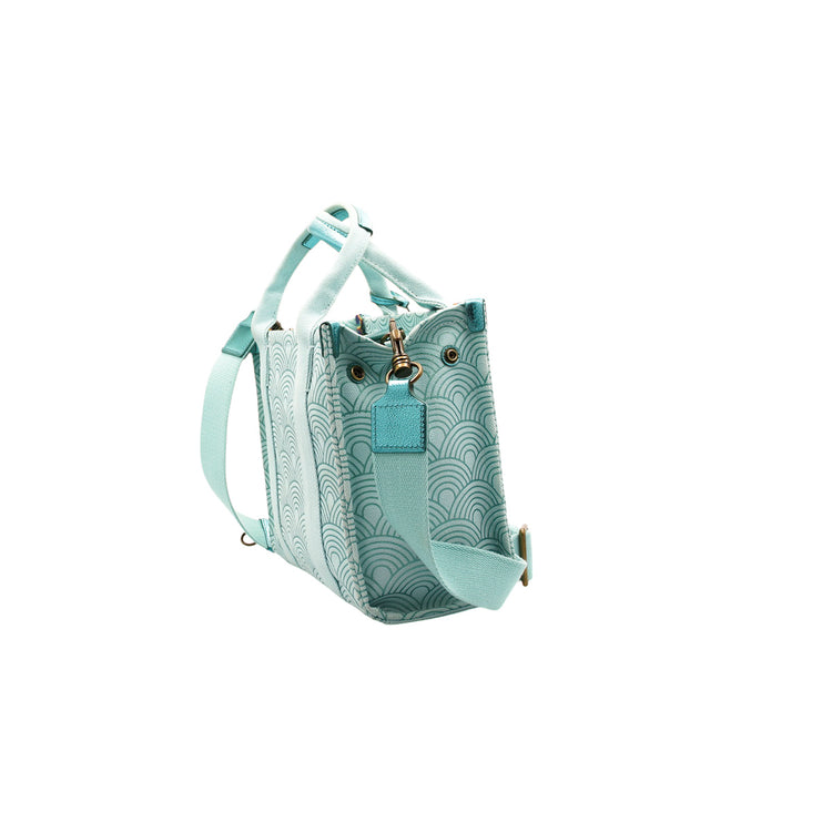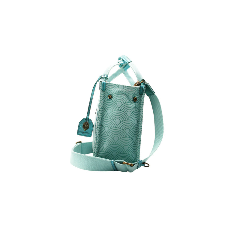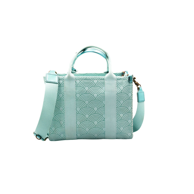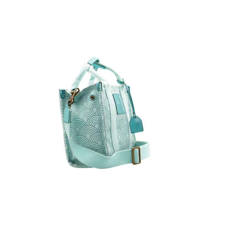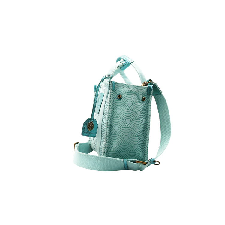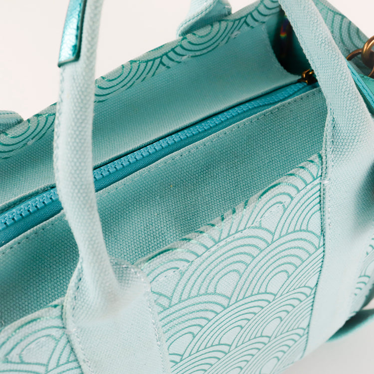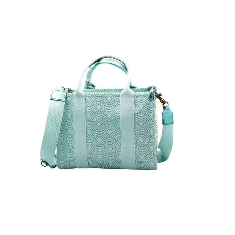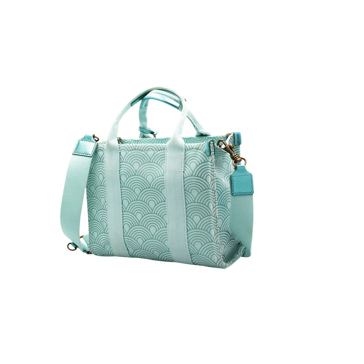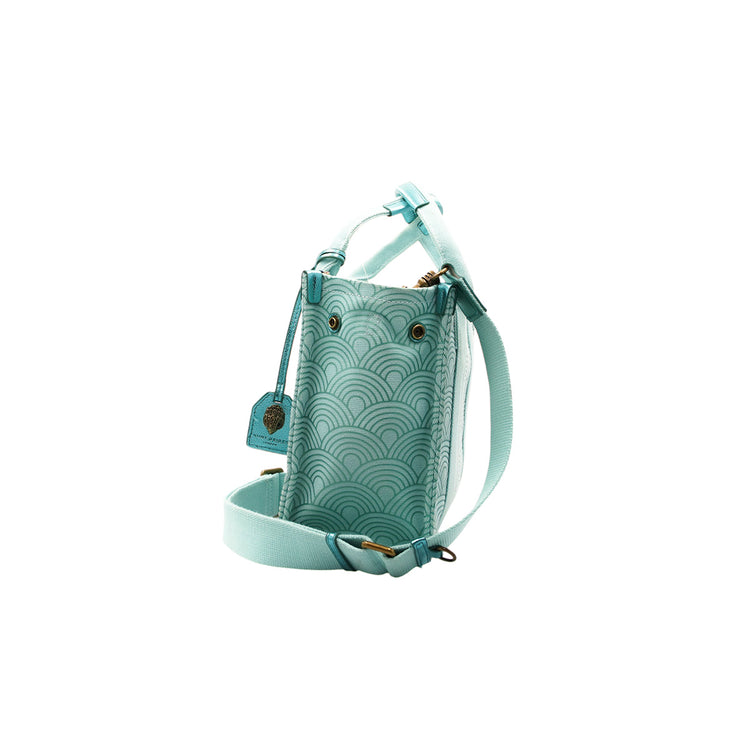 Bolso tipo tote marca Kurt Geiger de la colección Southbank Arcoiris, confeccionado lona color verde aqua, con ribetes y detalles de asas en piel color metálico, herrajes y cabeza de águila en color bronce, sucia por dentro, cremallera de plástico.