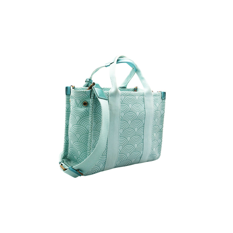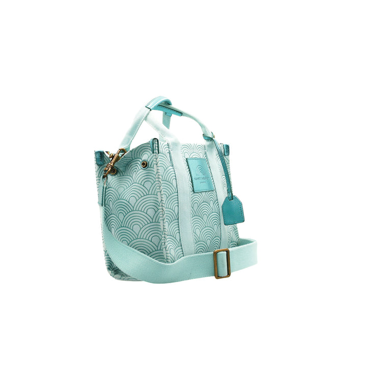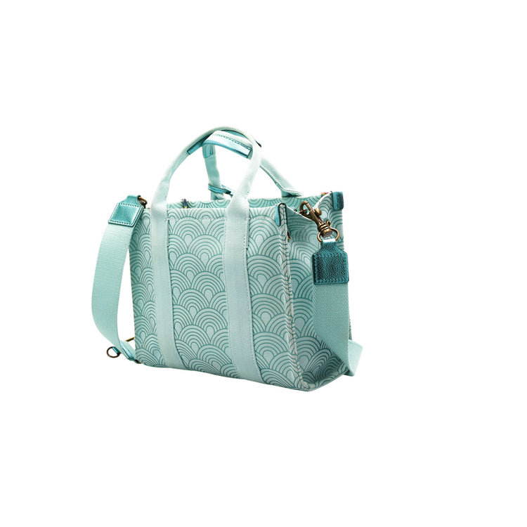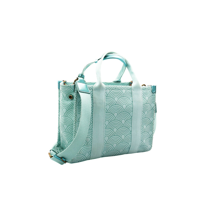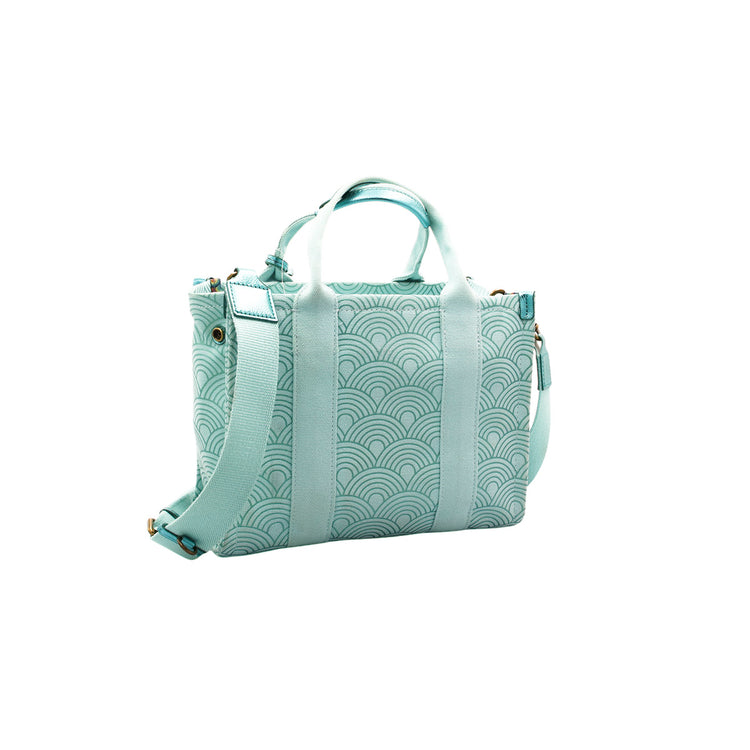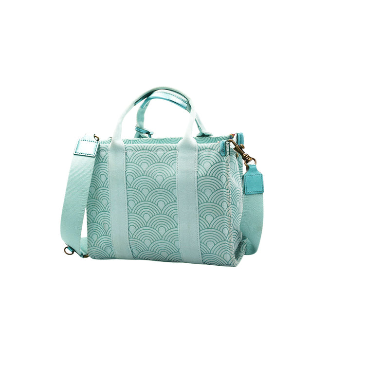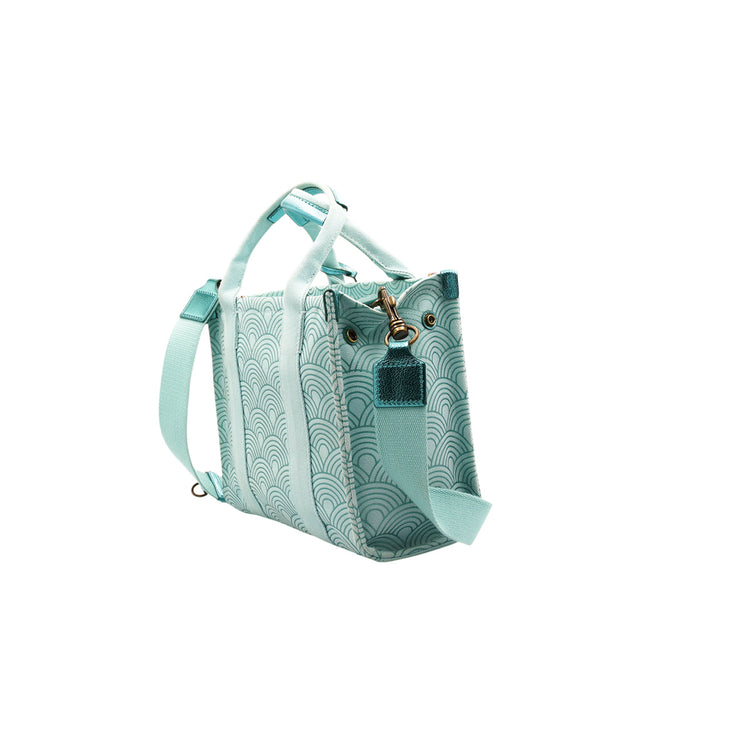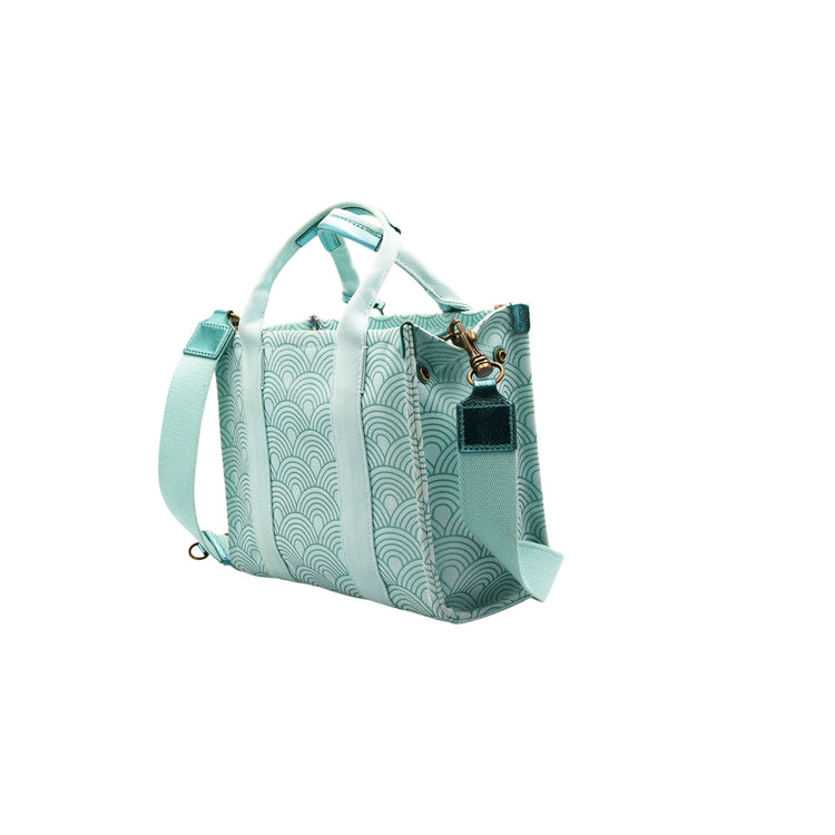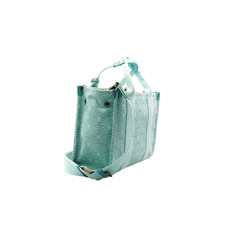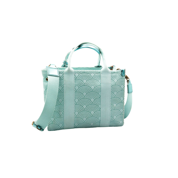 Bolso tipo tote marca Kurt Geiger de la colección Southbank Arcoiris, confeccionado lona color verde aqua, con ribetes y detalles de asas en piel color metálico, herrajes y cabeza de águila en color bronce, sucia por dentro, cremallera de plástico.