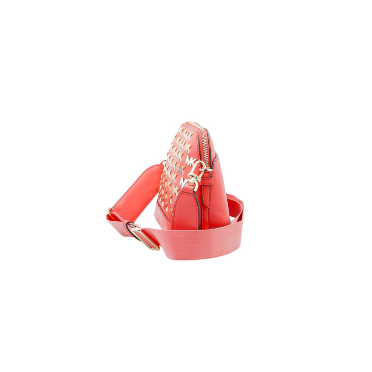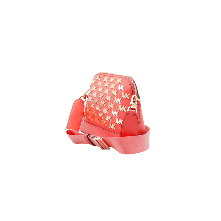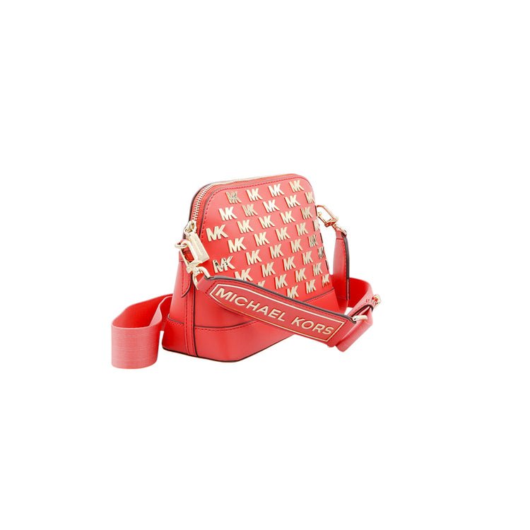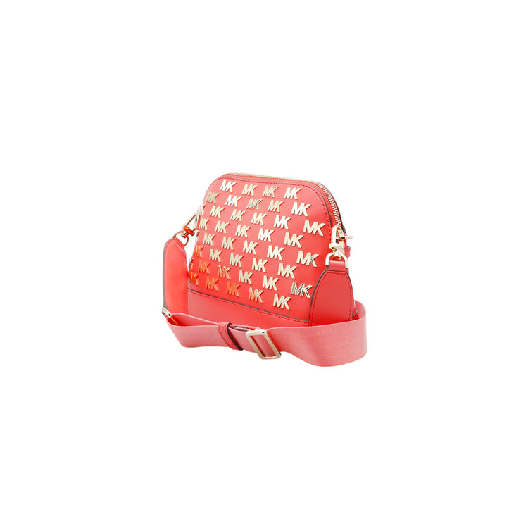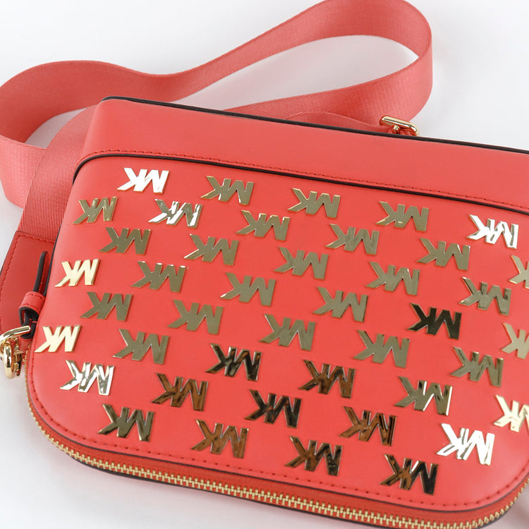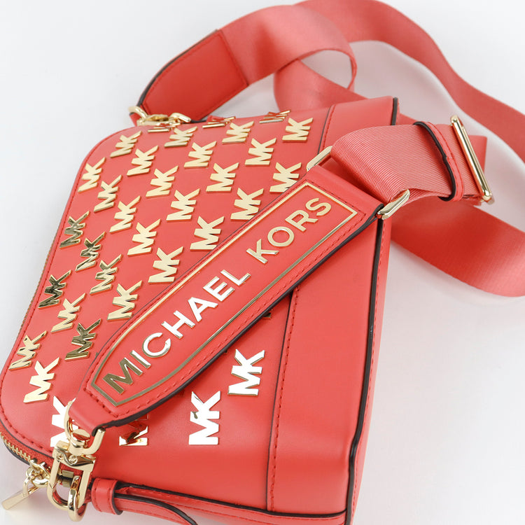 Bolso tipo bandolera de la marca Michael Kors línea Jet Set, confeccionado en piel color coral, con el monograma en herraje dorado sobre la superficie, con correa de tela.
