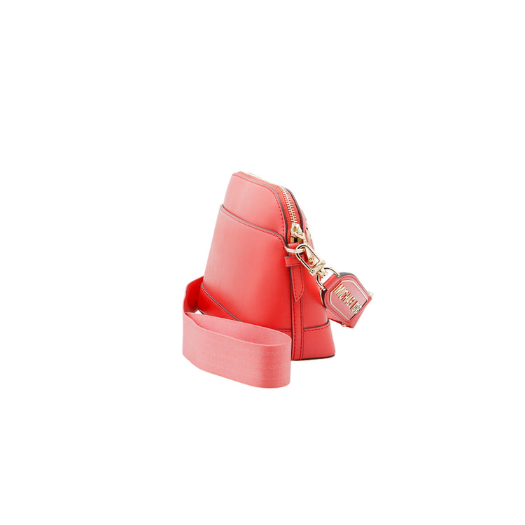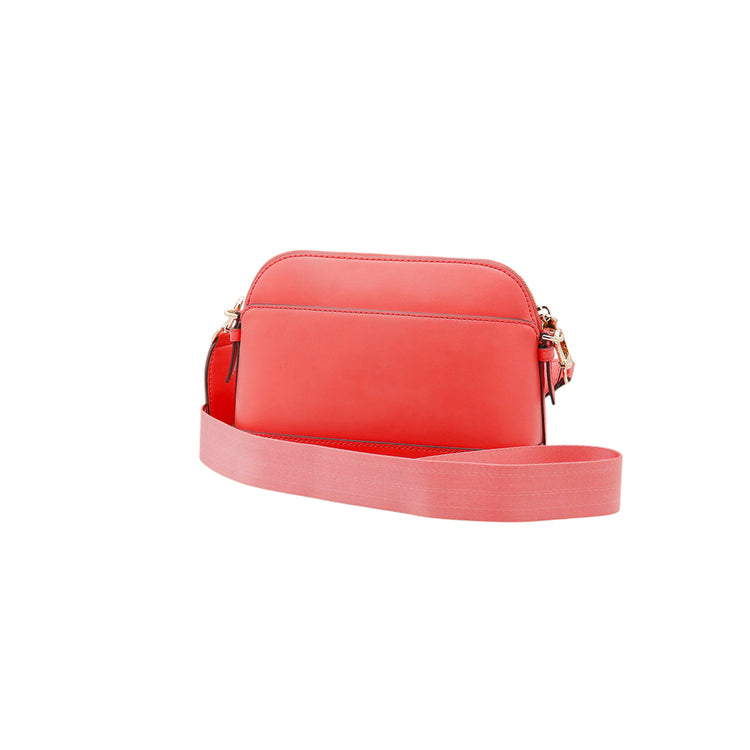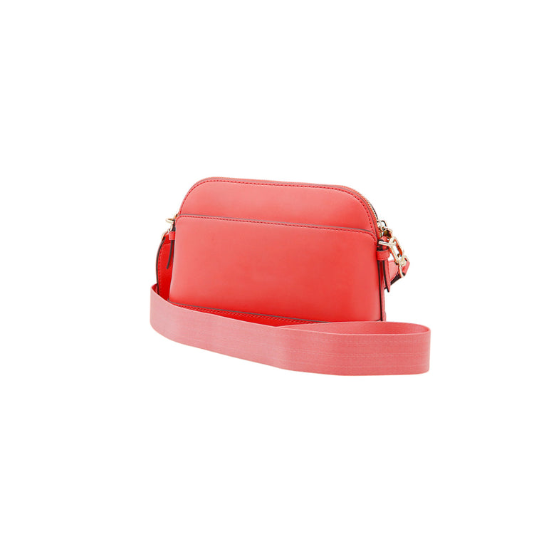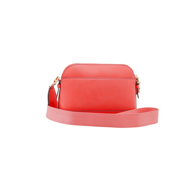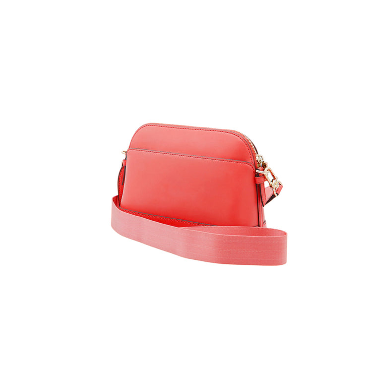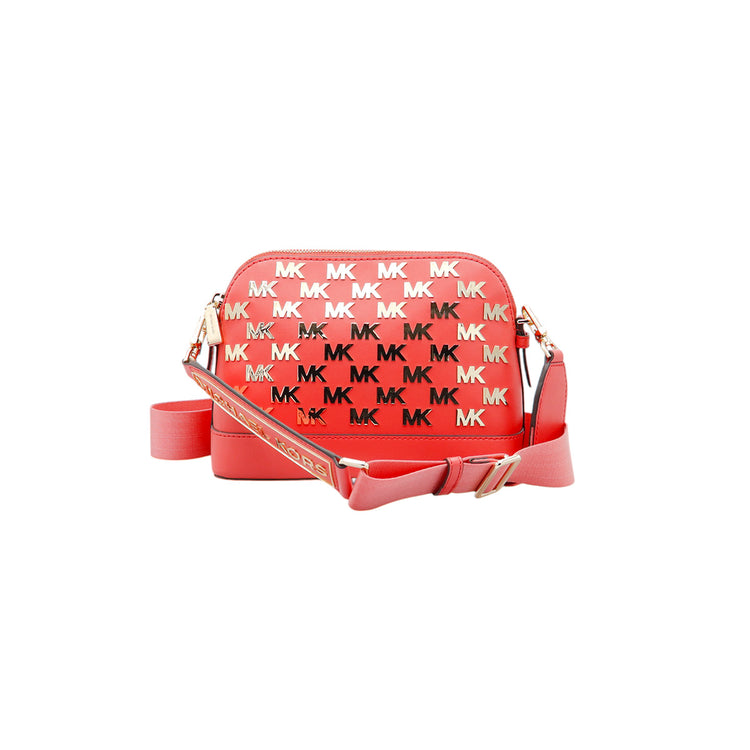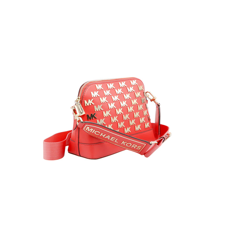 Bolso tipo bandolera de la marca Michael Kors línea Jet Set, confeccionado en piel color coral, con el monograma en herraje dorado sobre la superficie, con correa de tela.