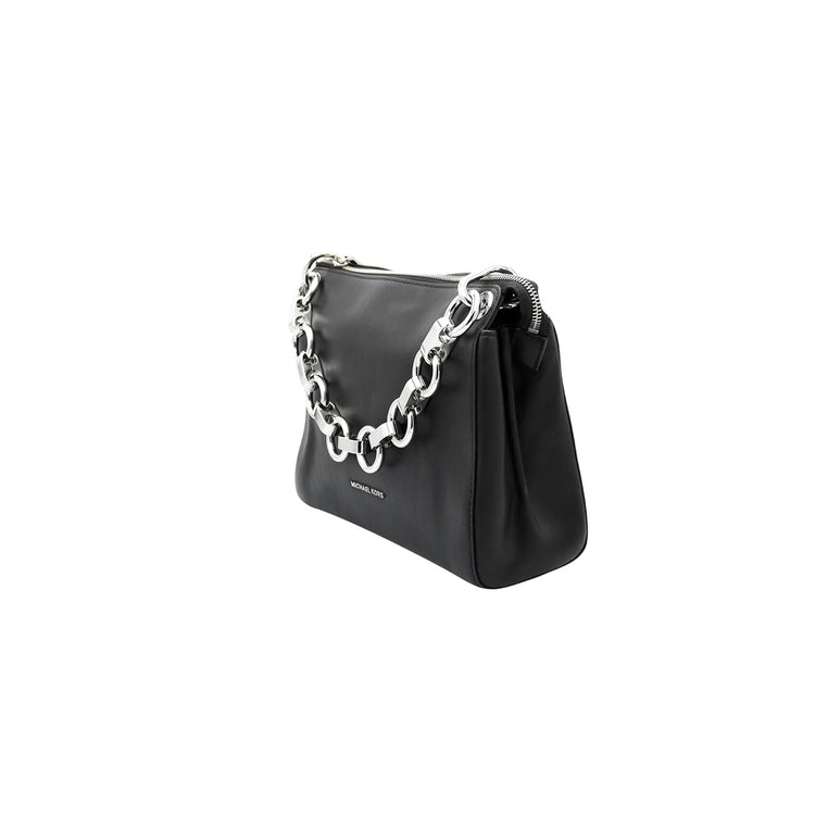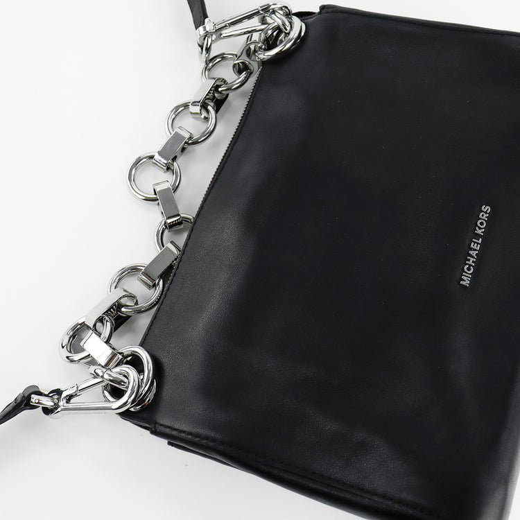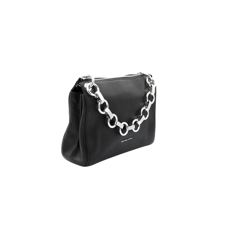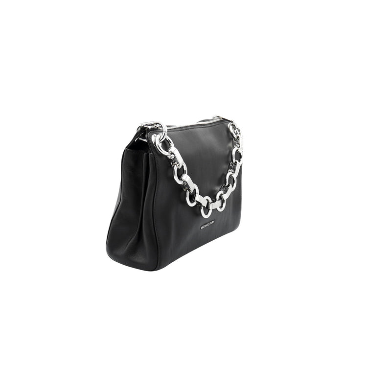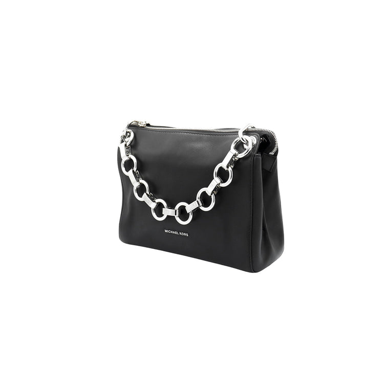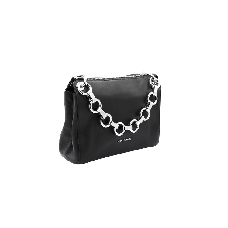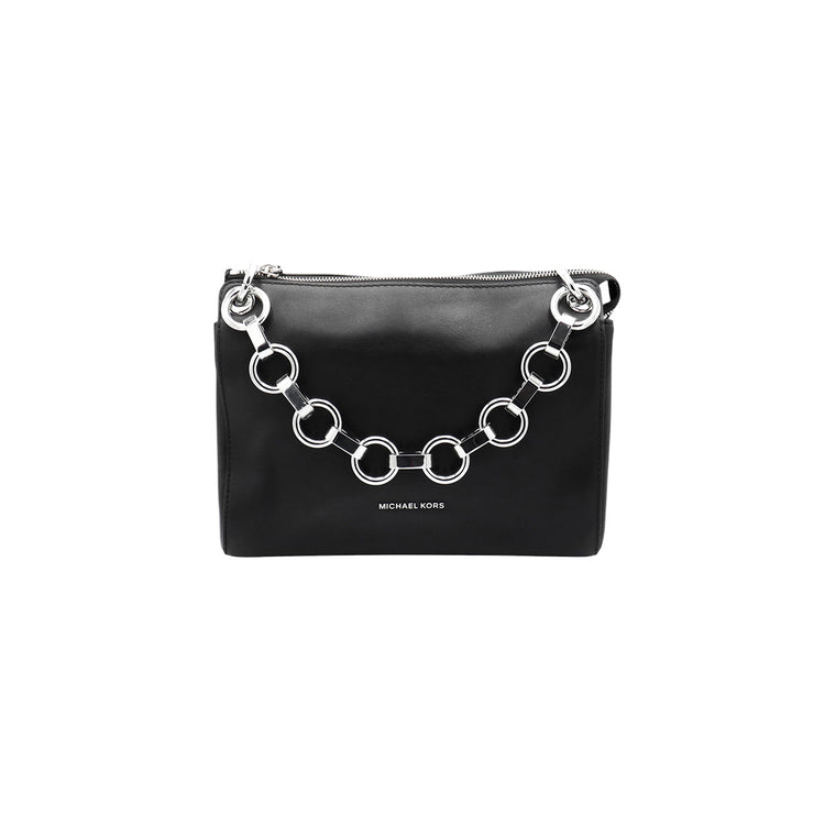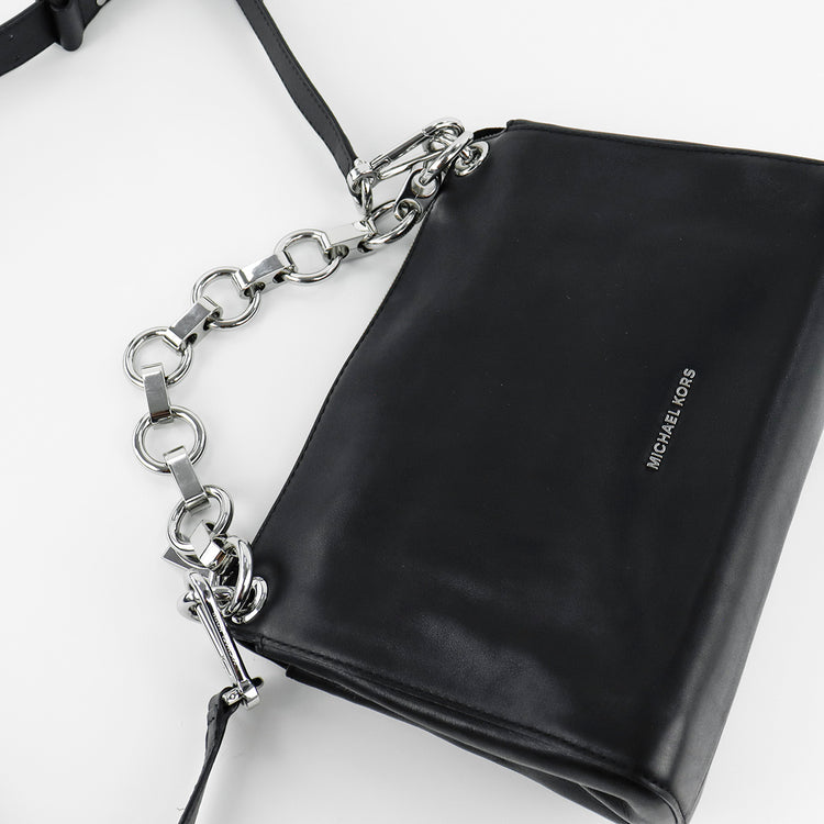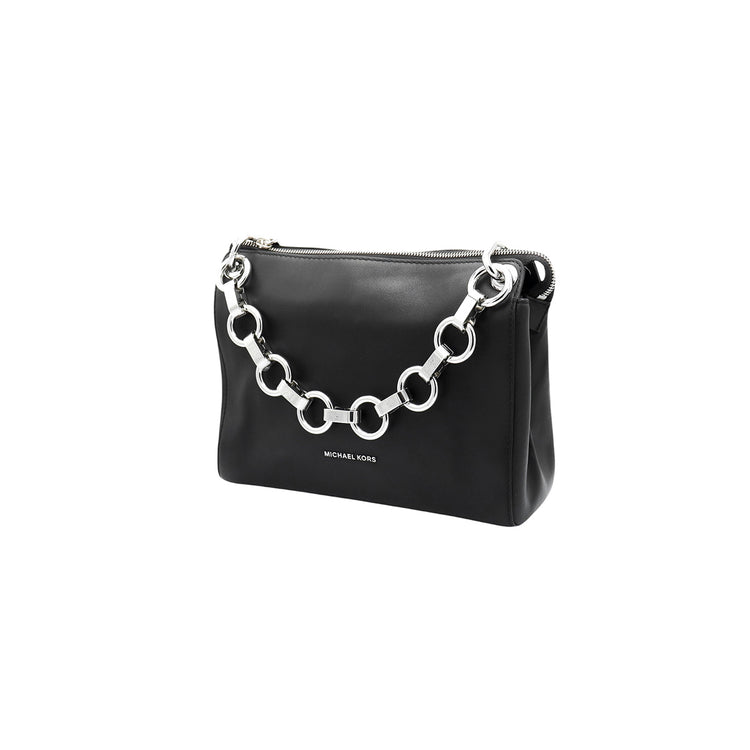 Bolso Michael Kors de la línea Gianna, confeccionado en piel color negro con forro interno en textil del mismo tono, con asa tipo cadena y bandolera de cuero, herrajes en color plateado.