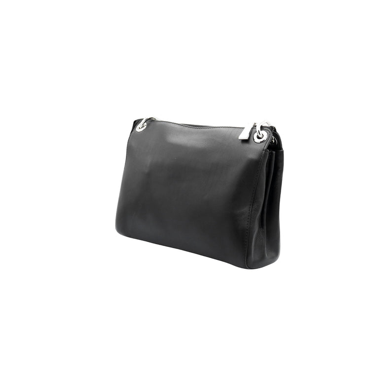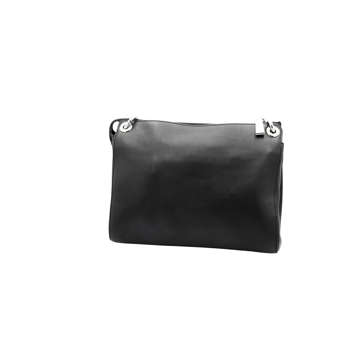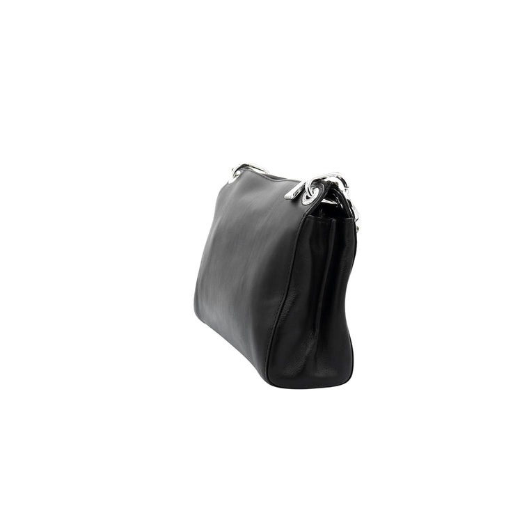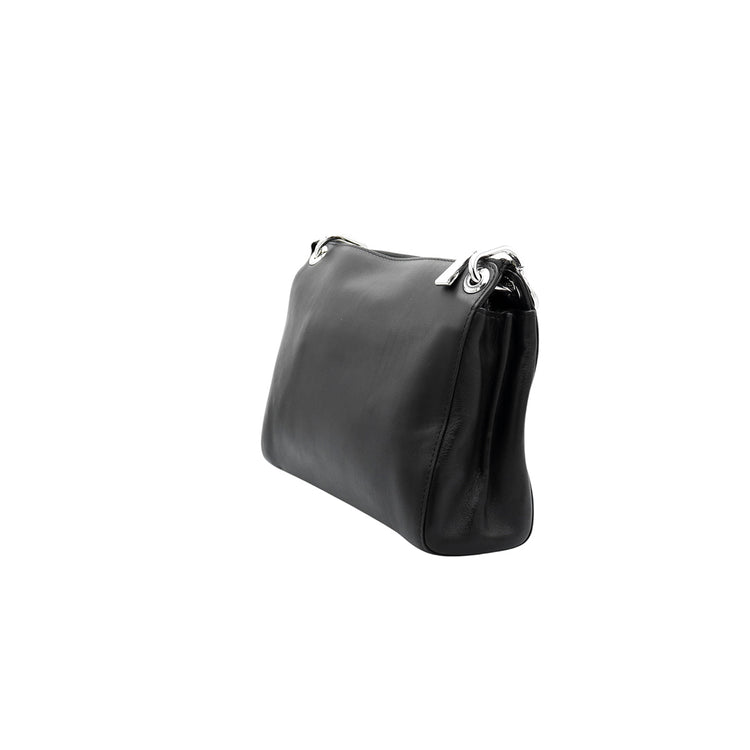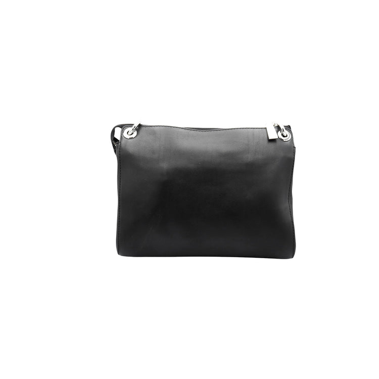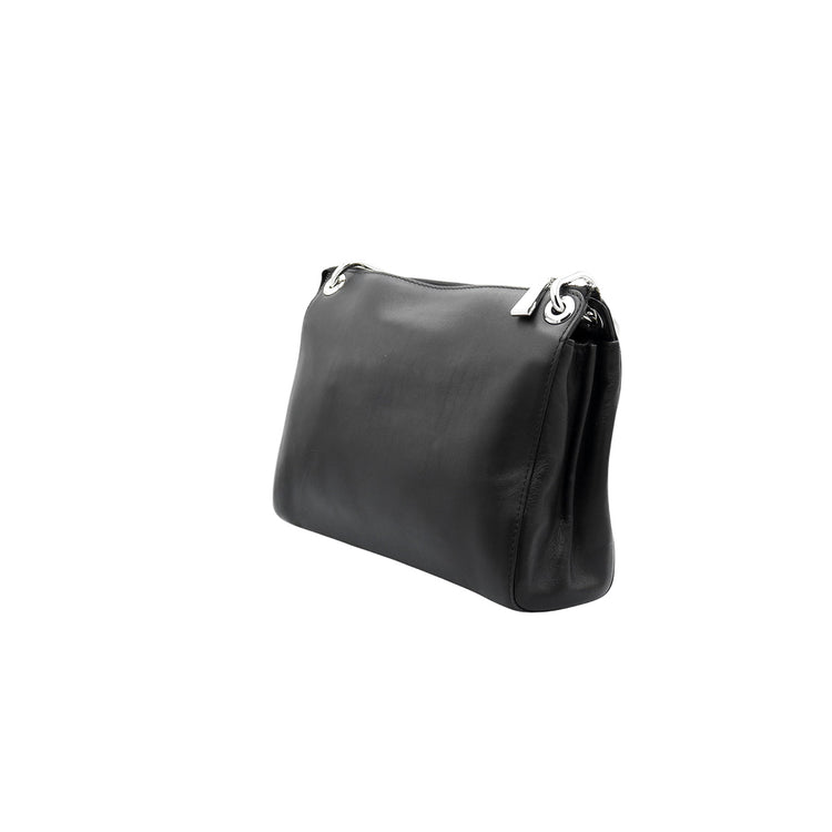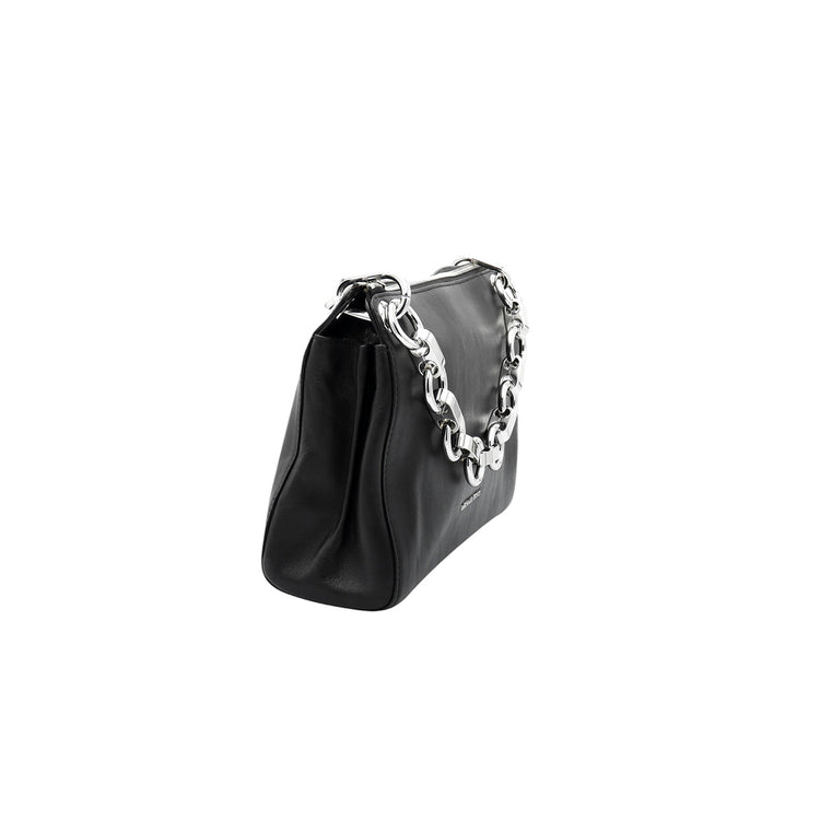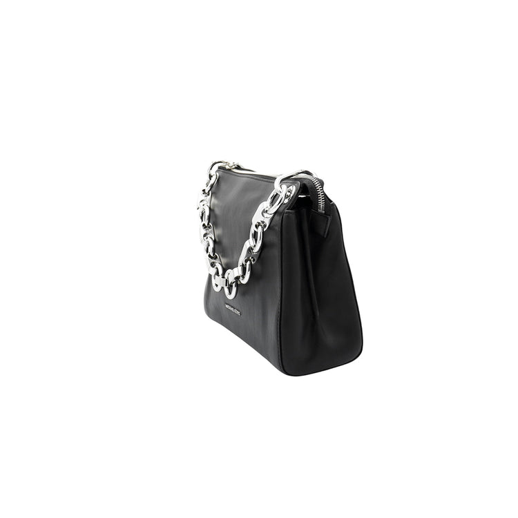 Bolso Michael Kors de la línea Gianna, confeccionado en piel color negro con forro interno en textil del mismo tono, con asa tipo cadena y bandolera de cuero, herrajes en color plateado.