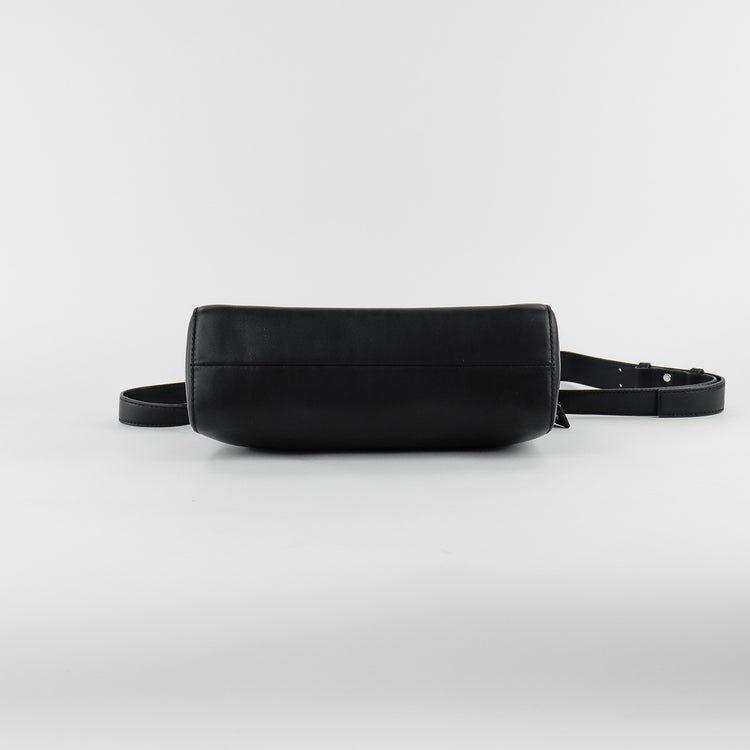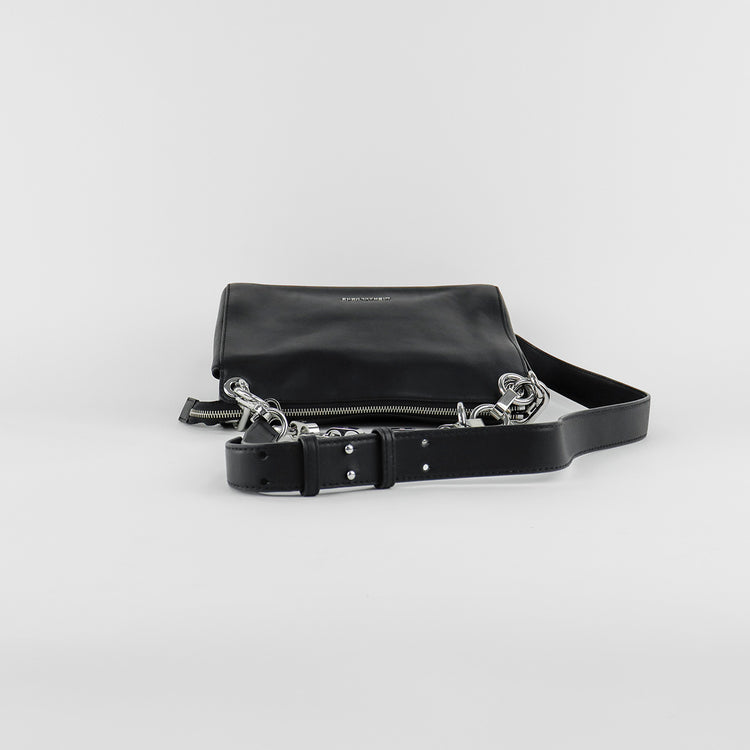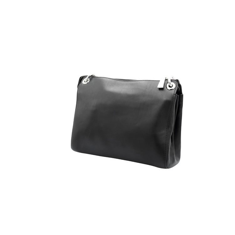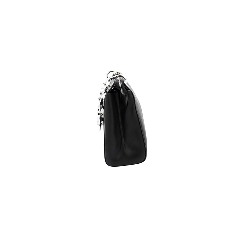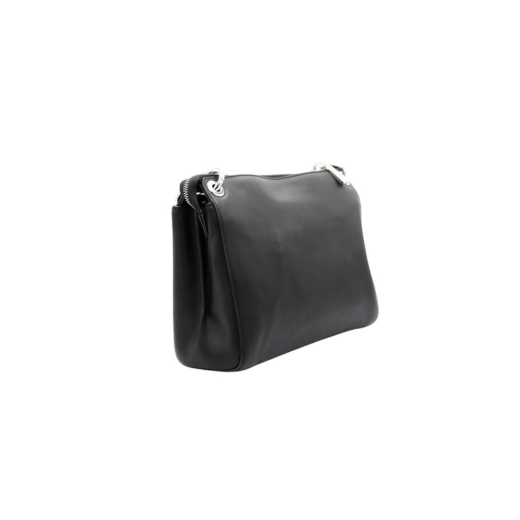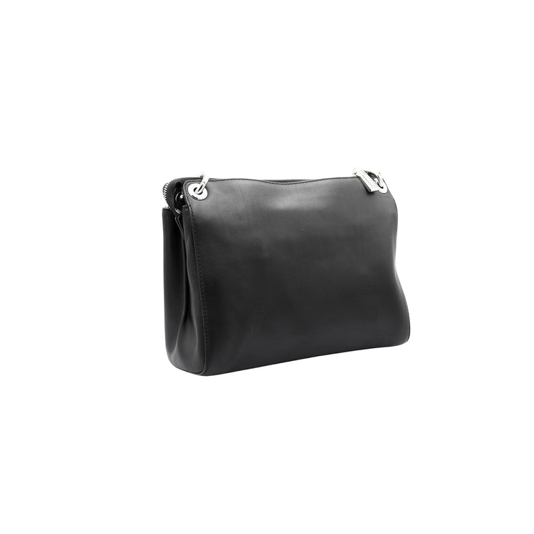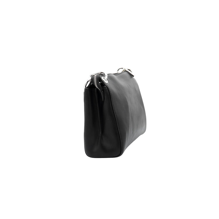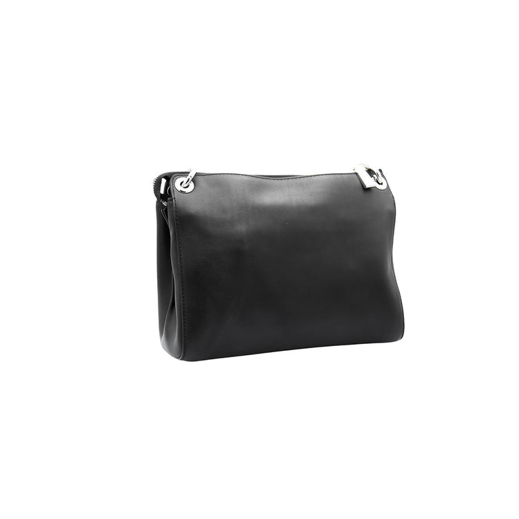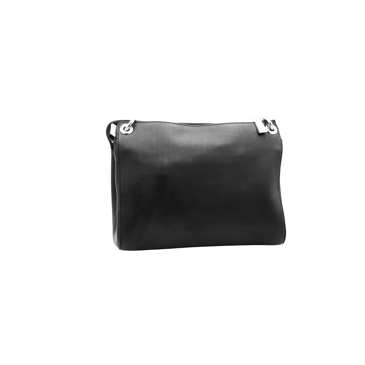 Bolso Michael Kors de la línea Gianna, confeccionado en piel color negro con forro interno en textil del mismo tono, con asa tipo cadena y bandolera de cuero, herrajes en color plateado.