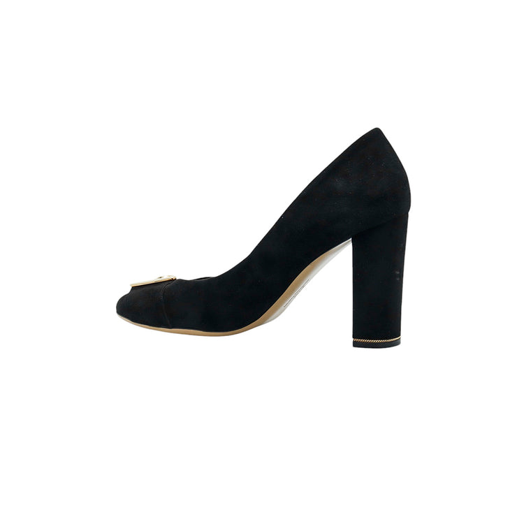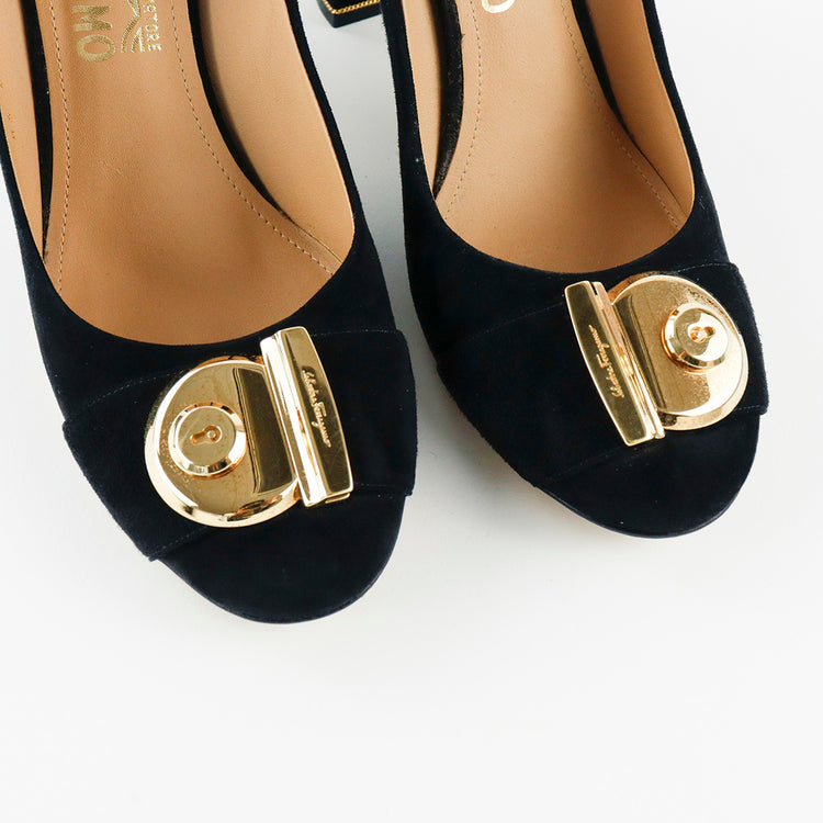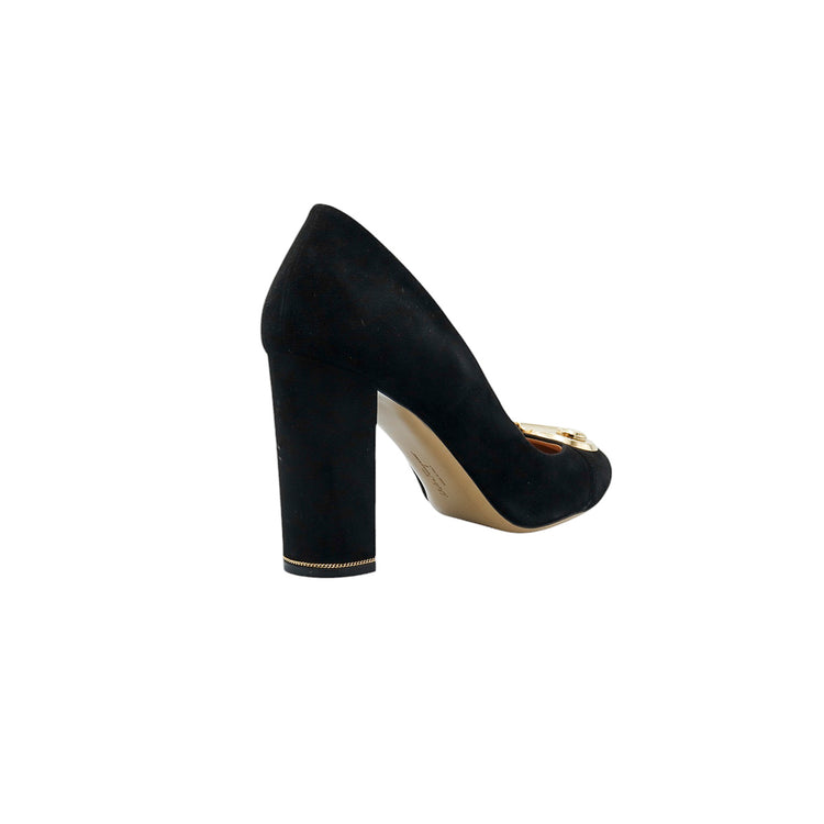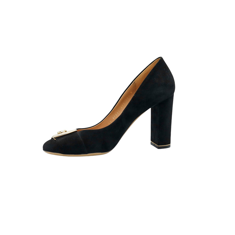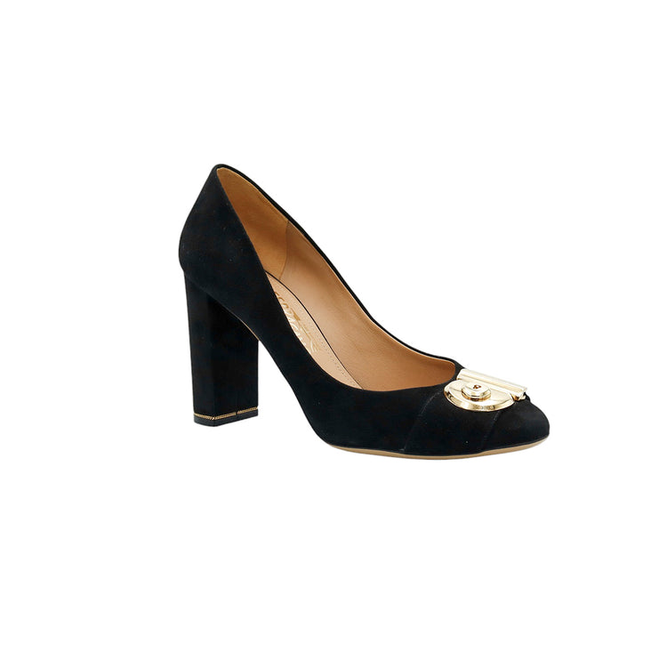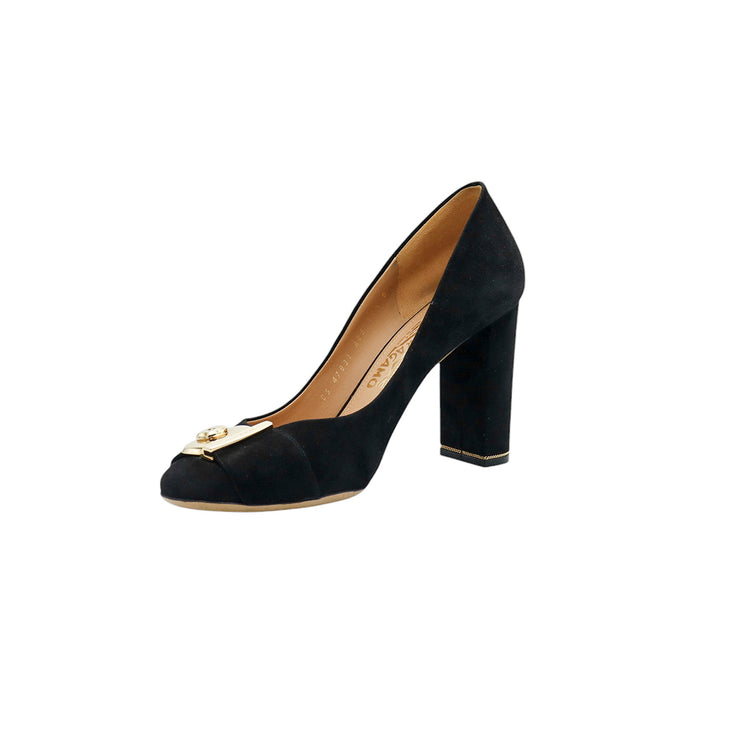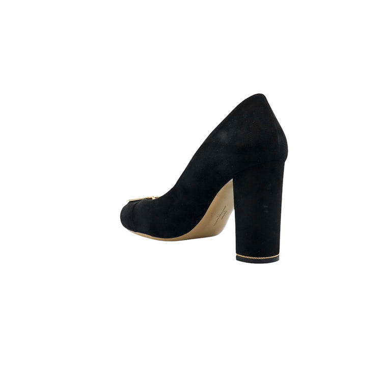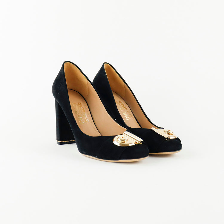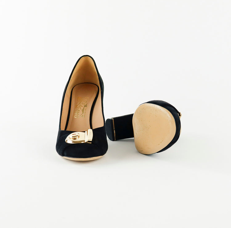 Zapatos de tacón Salvatore Ferragamo, de la colección Fiamma Keyhole, confeccionados en ante color negro, herrajes en color dorado, suela con leves detalles por poco uso.