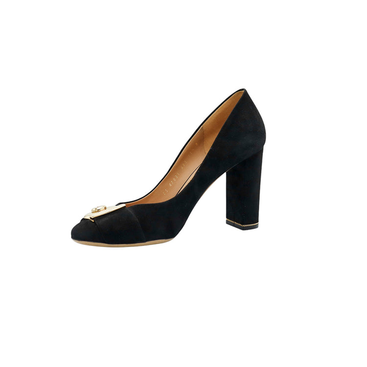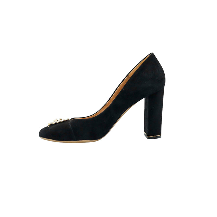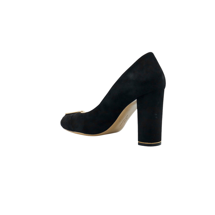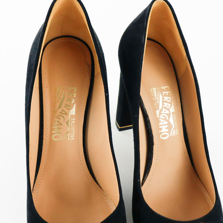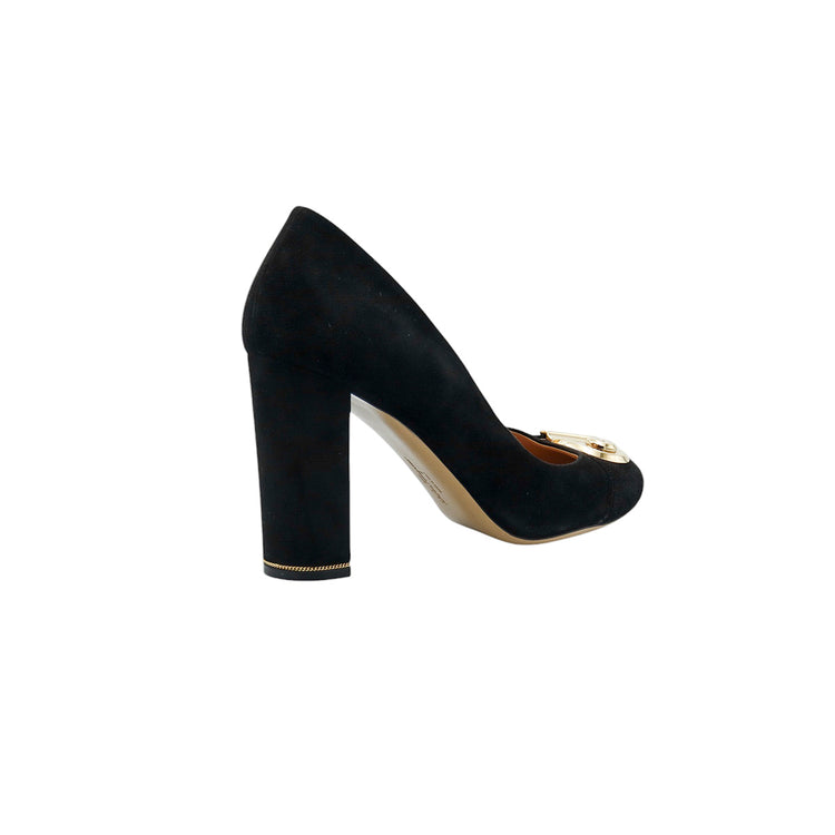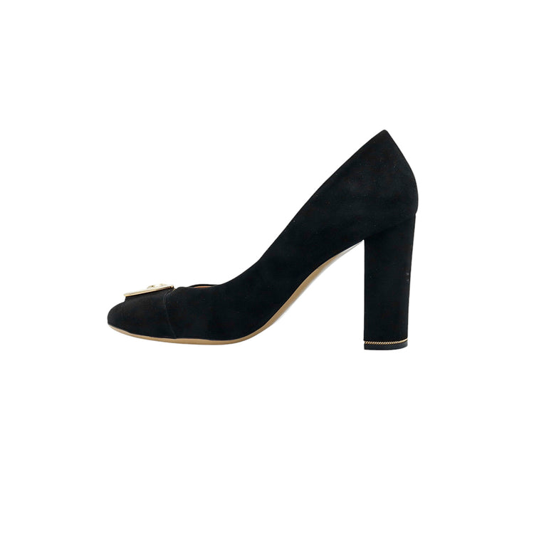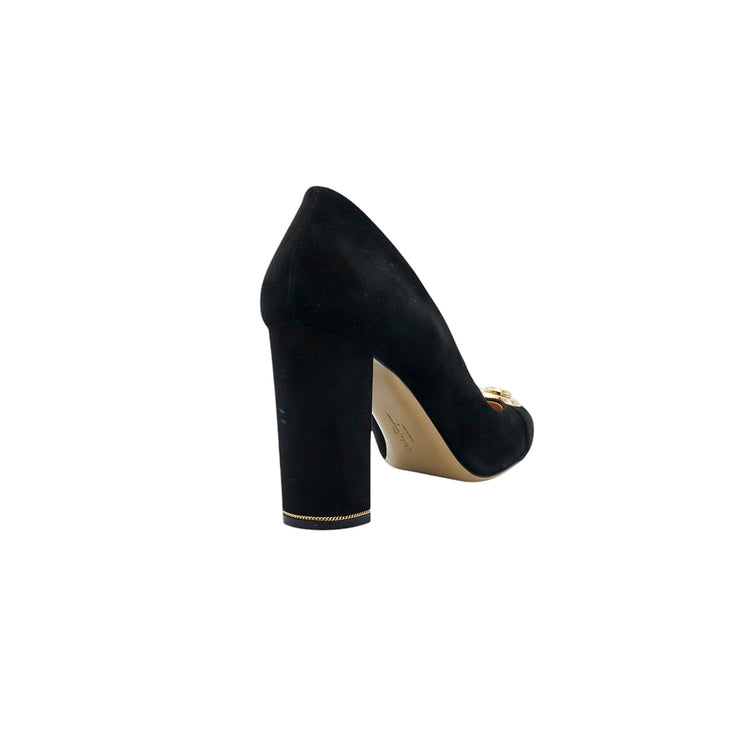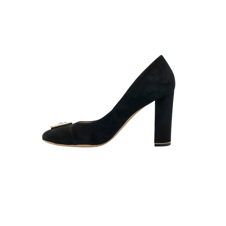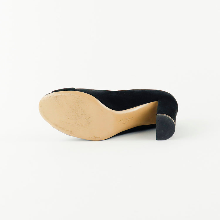 Zapatos de tacón Salvatore Ferragamo, de la colección Fiamma Keyhole, confeccionados en ante color negro, herrajes en color dorado, suela con leves detalles por poco uso.