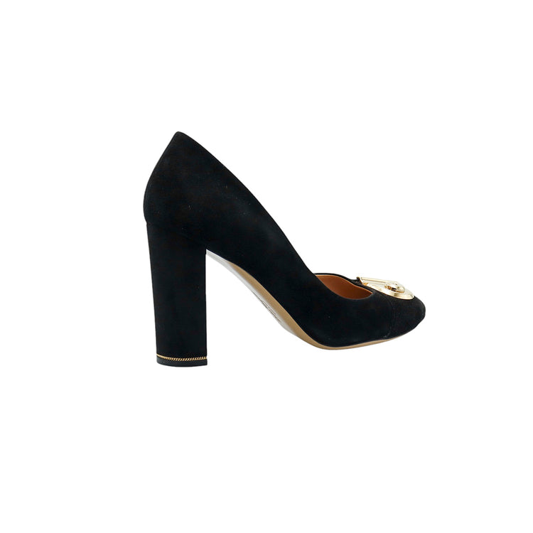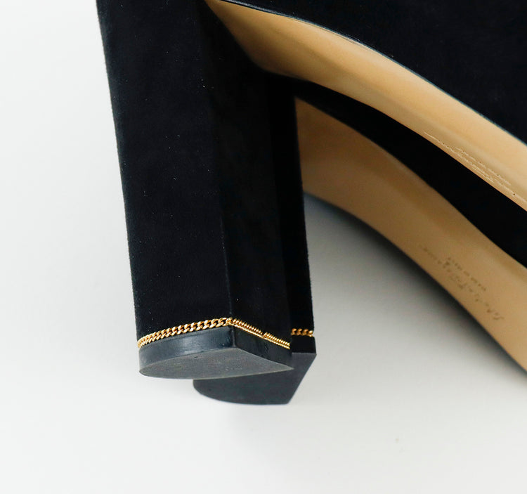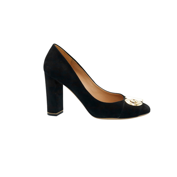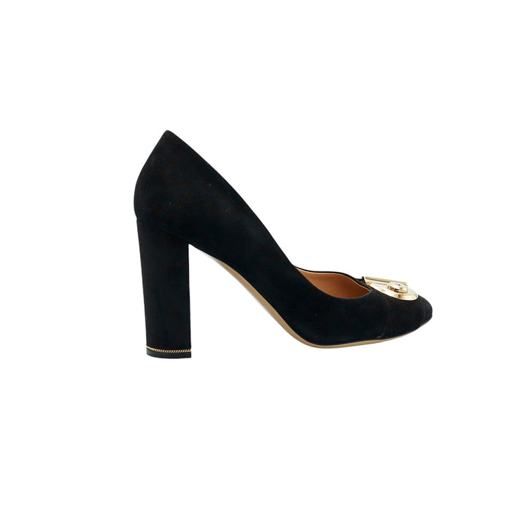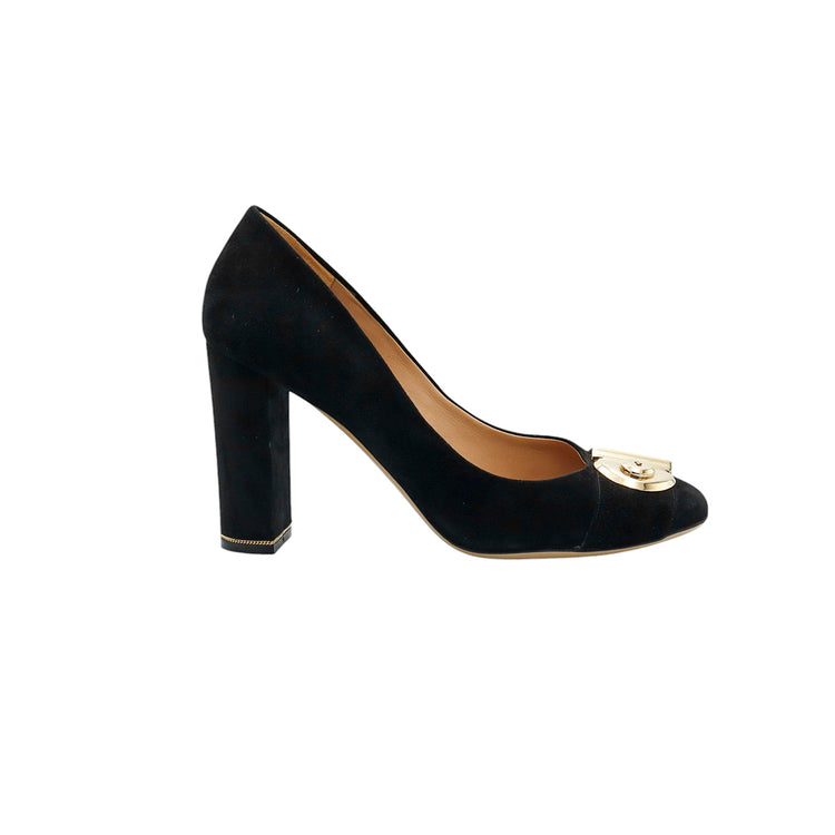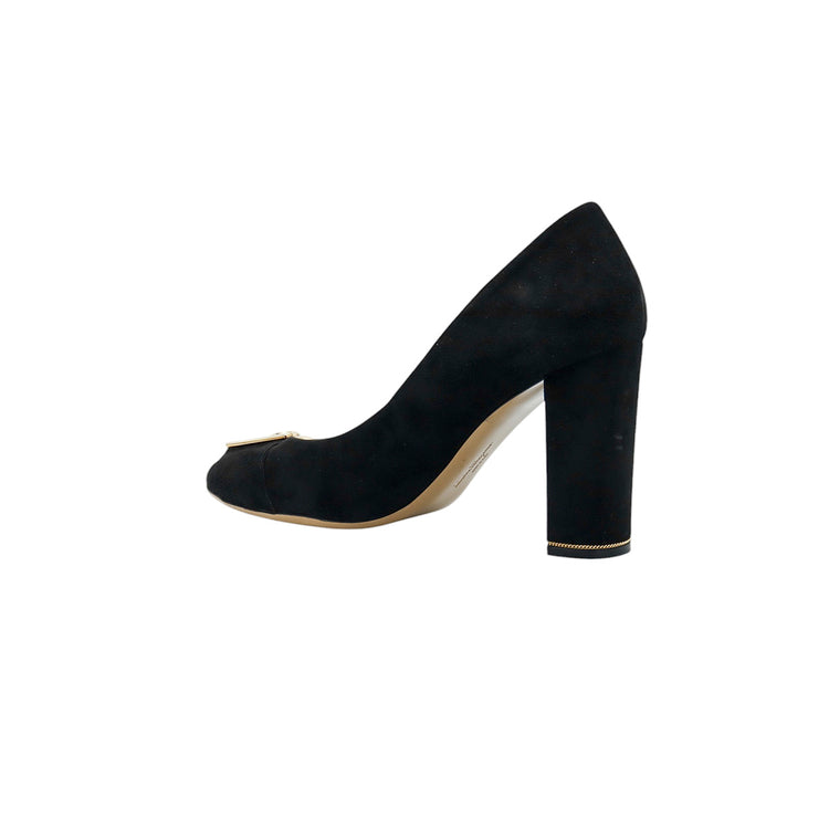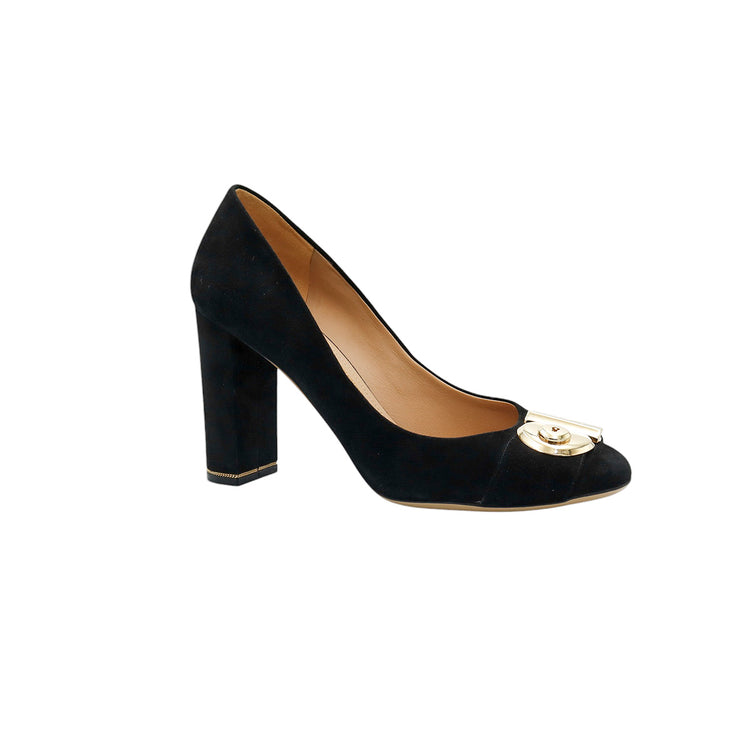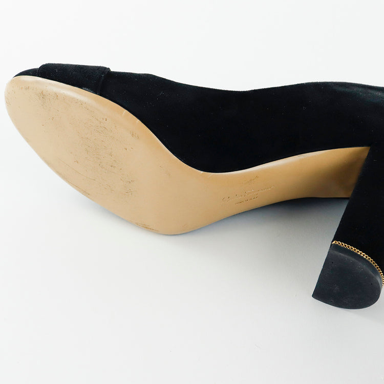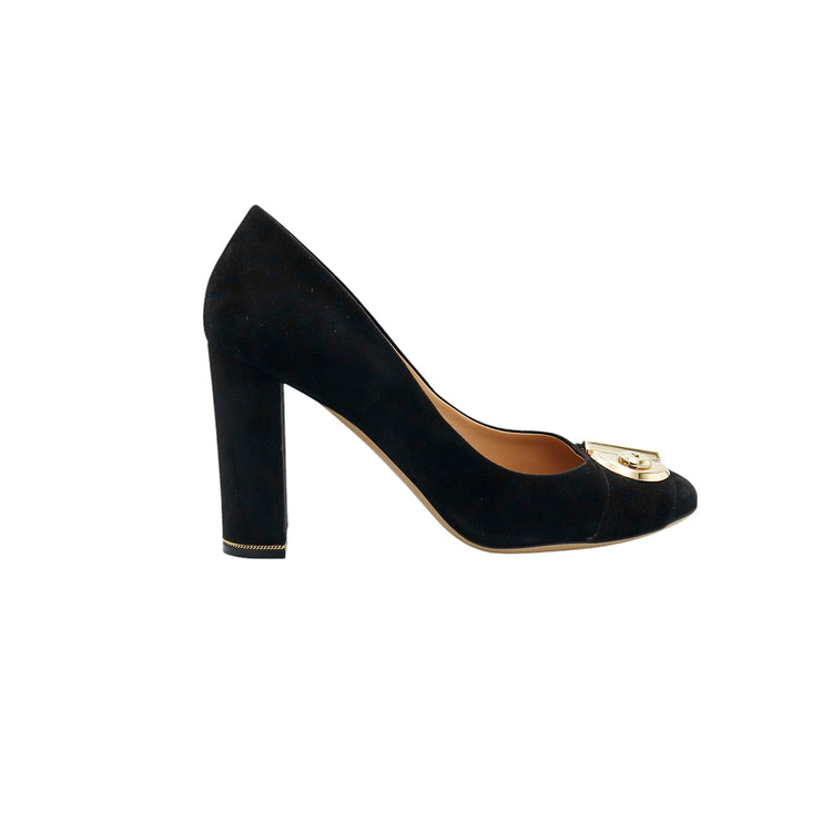 Zapatos de tacón Salvatore Ferragamo, de la colección Fiamma Keyhole, confeccionados en ante color negro, herrajes en color dorado, suela con leves detalles por poco uso.