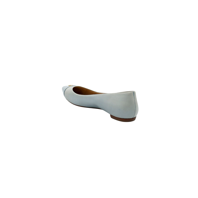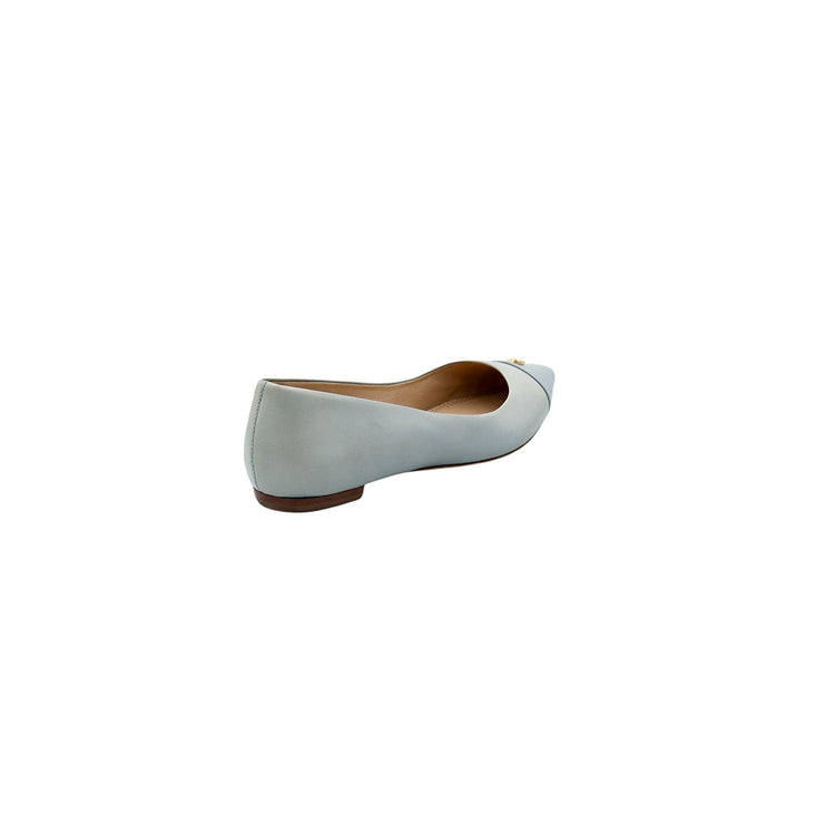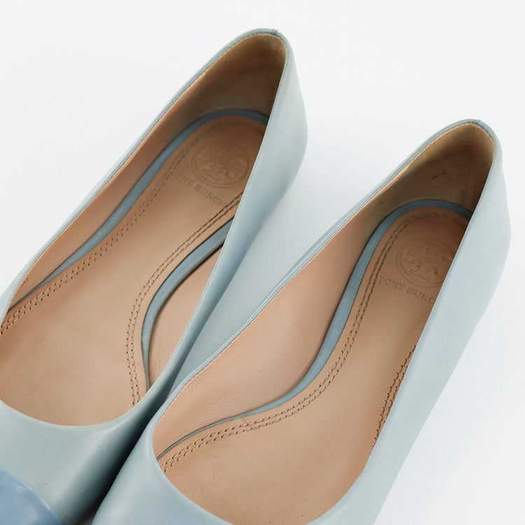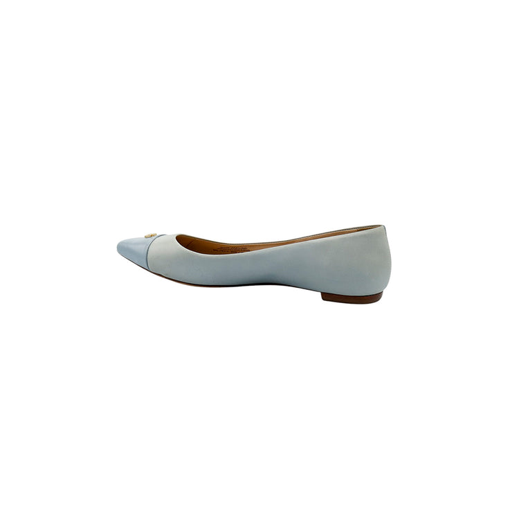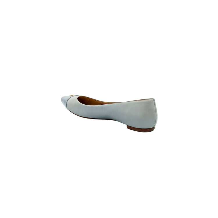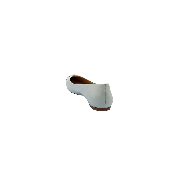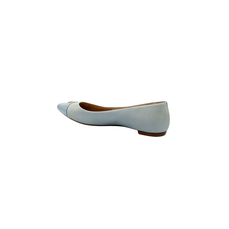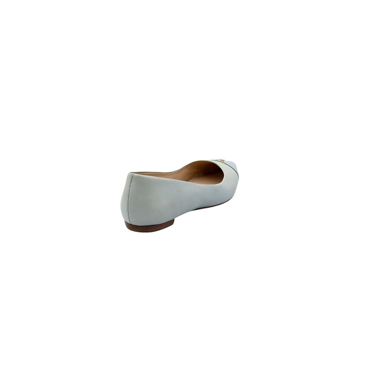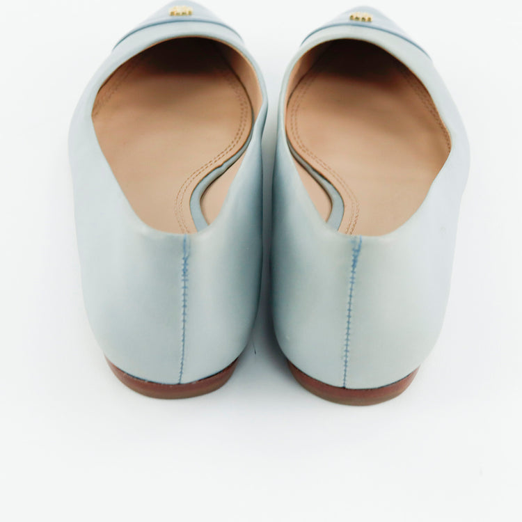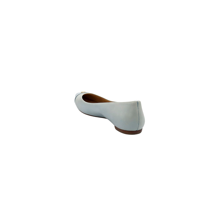 Zapatos tipo flat de la marca Tory Burch, confeccionados en piel color azul claro, puntera reforzada con el herraje de la marca en color dorado, suela poco sucia por uso.