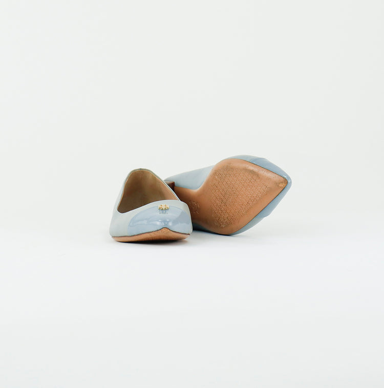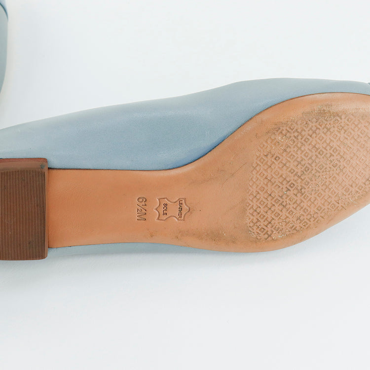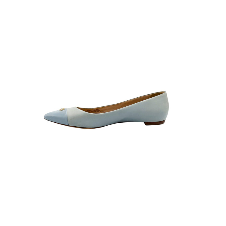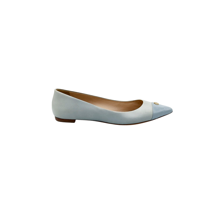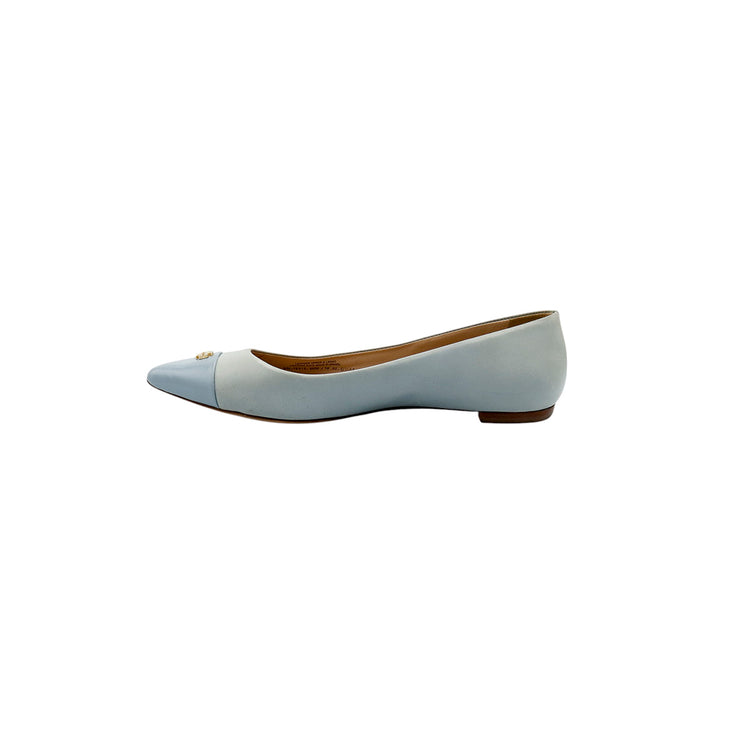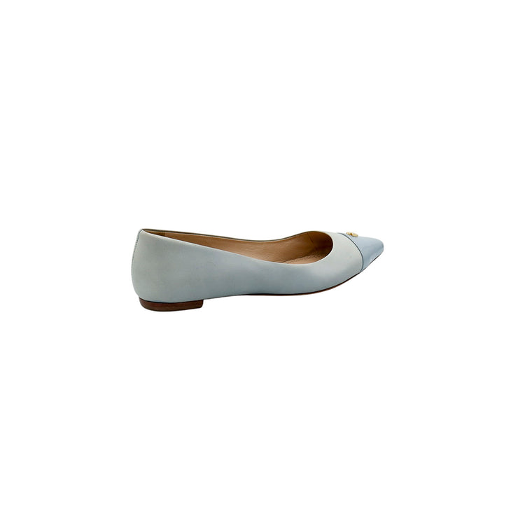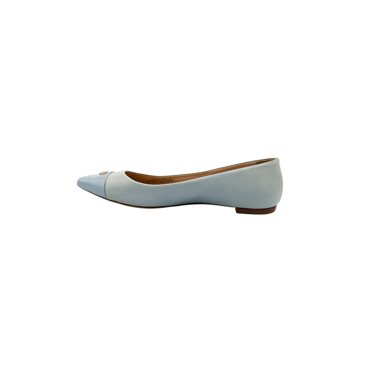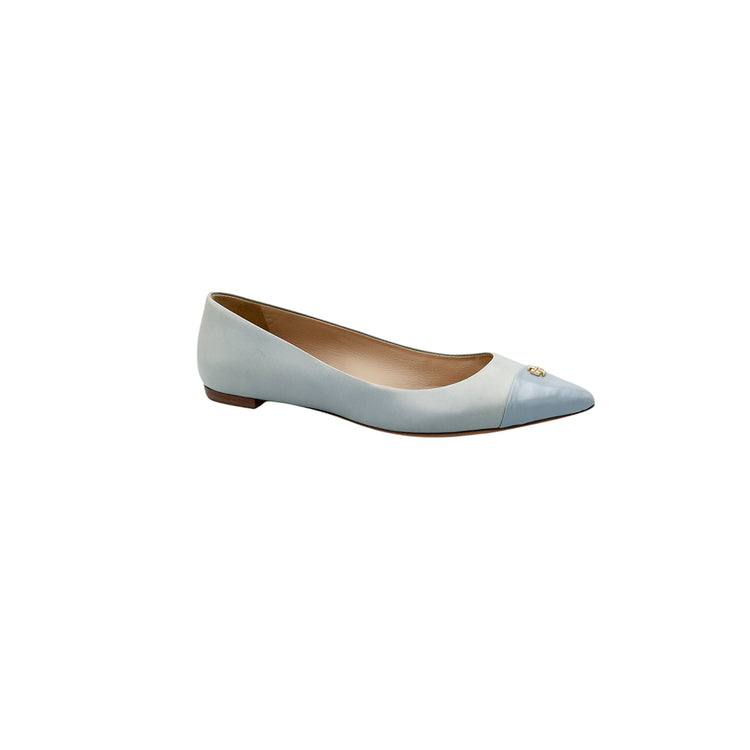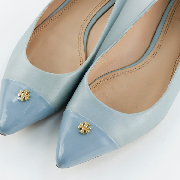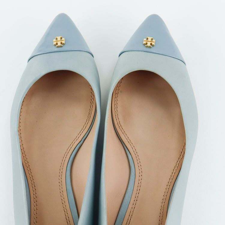 Zapatos tipo flat de la marca Tory Burch, confeccionados en piel color azul claro, puntera reforzada con el herraje de la marca en color dorado, suela poco sucia por uso.
