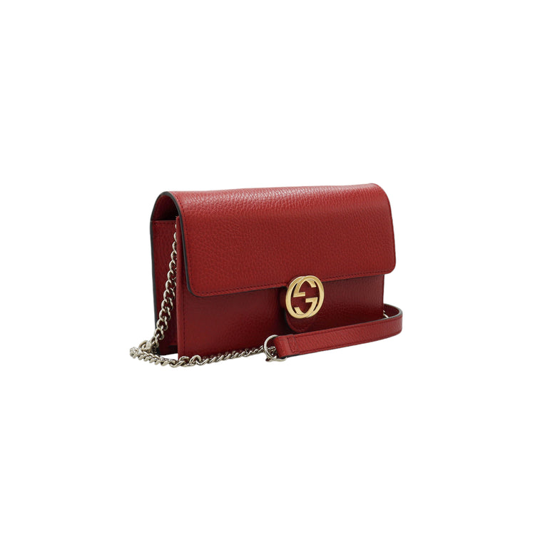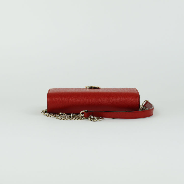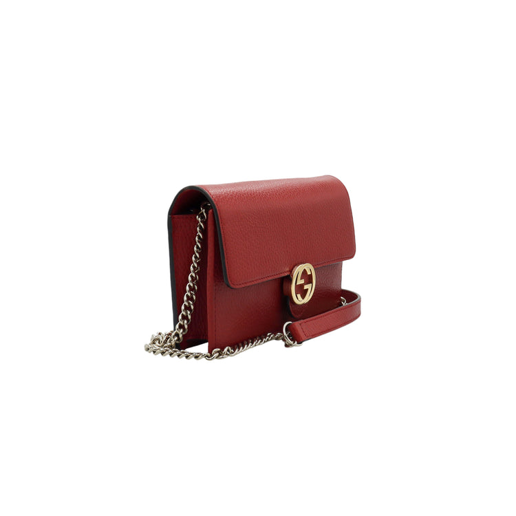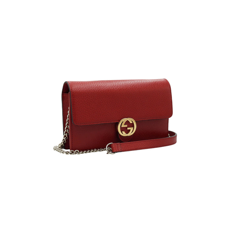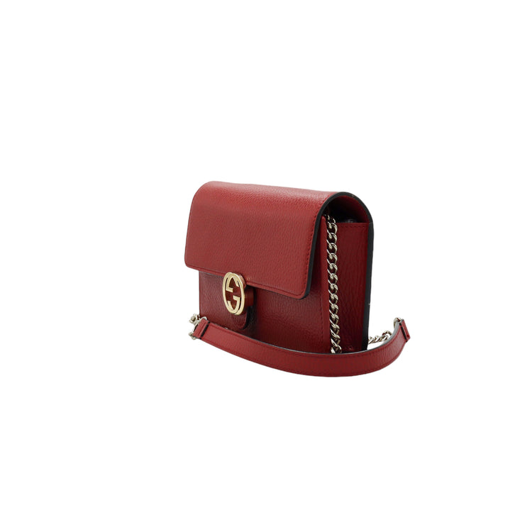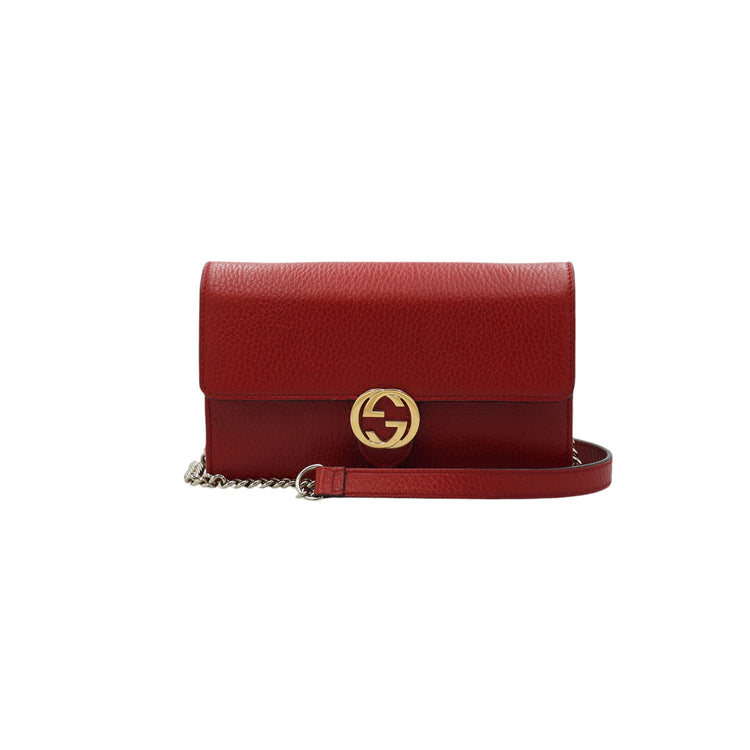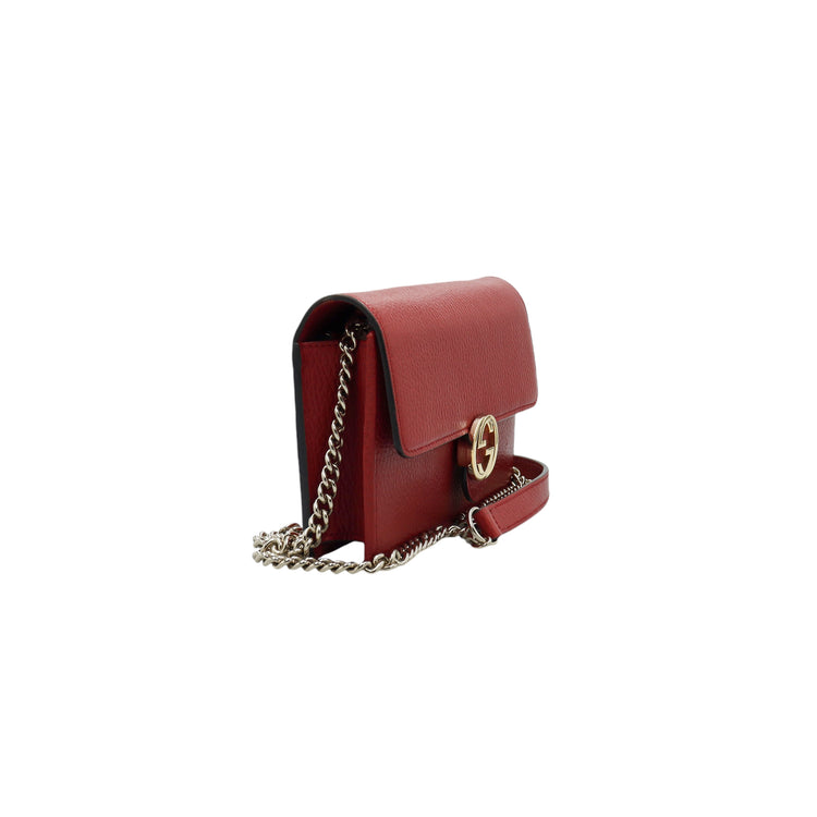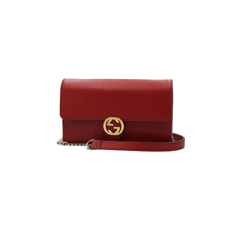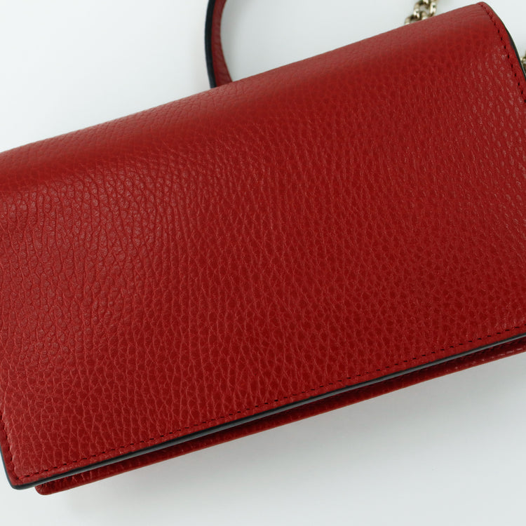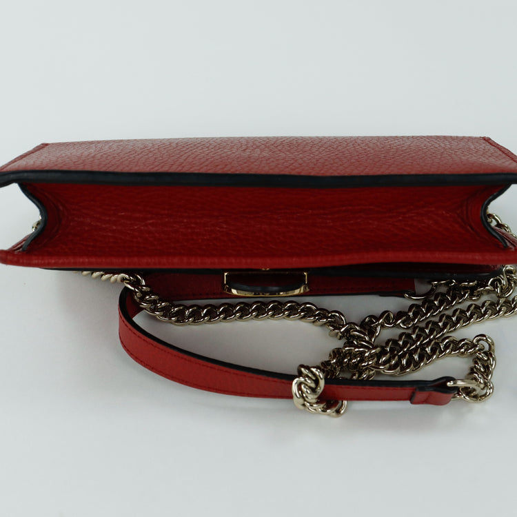 Bolso Gucci de la colección interlocking woc, confeccionado en piel color rojo, strap de cadena con piel, cierre a presión en la solapa y bolsillo interno con cremallera, herrajes en color dorado.