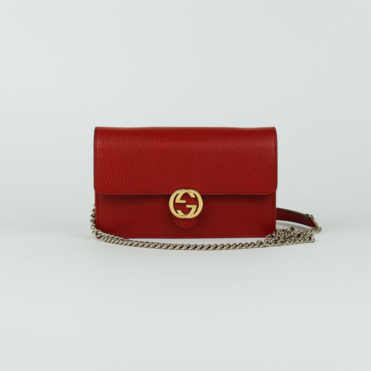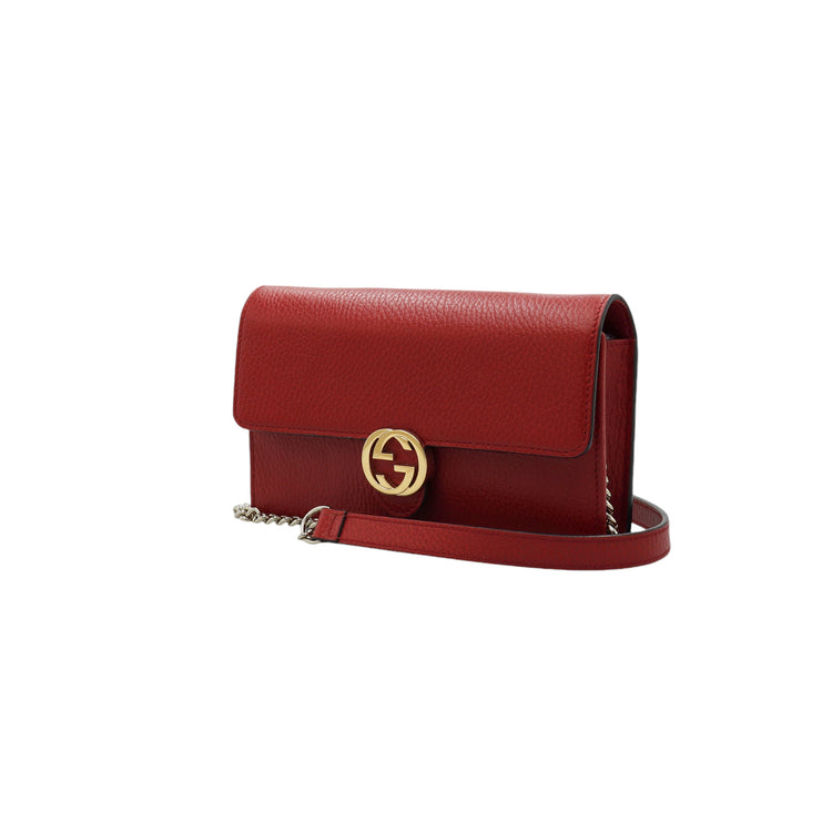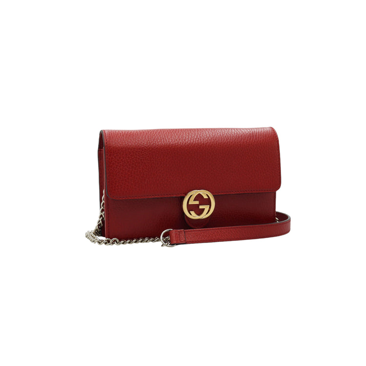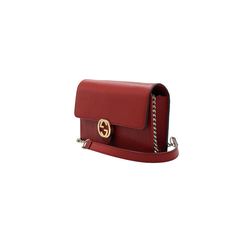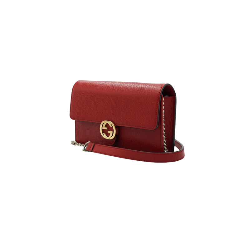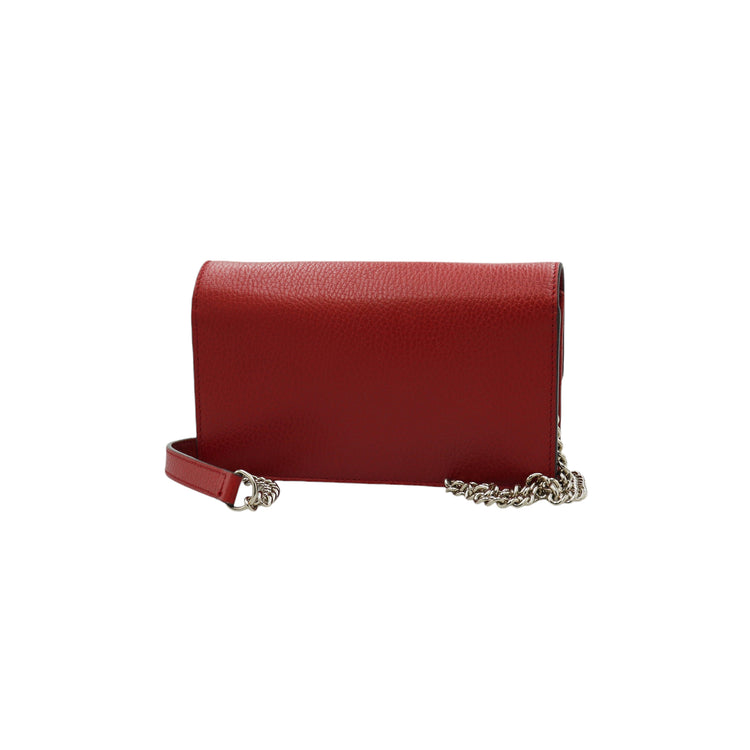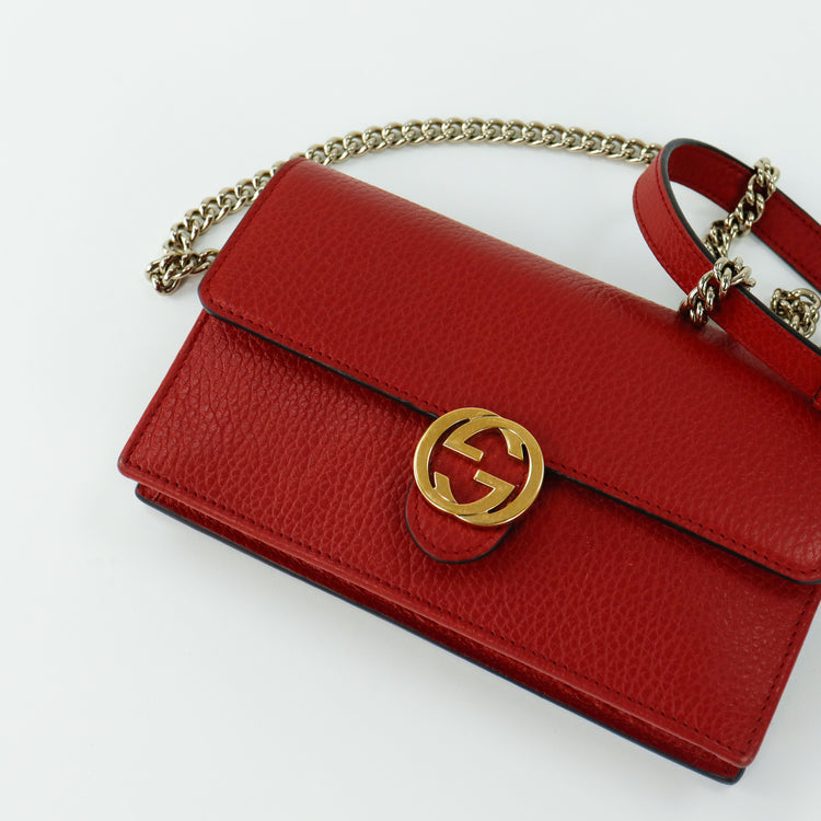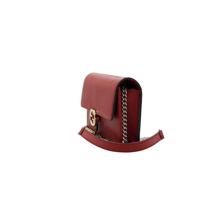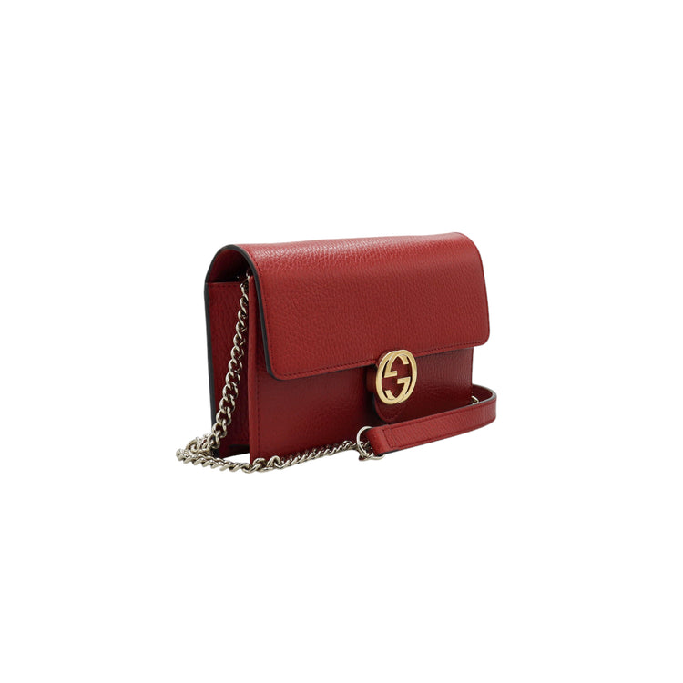Bolso Gucci de la colección interlocking woc, confeccionado en piel color rojo, strap de cadena con piel, cierre a presión en la solapa y bolsillo interno con cremallera, herrajes en color dorado.