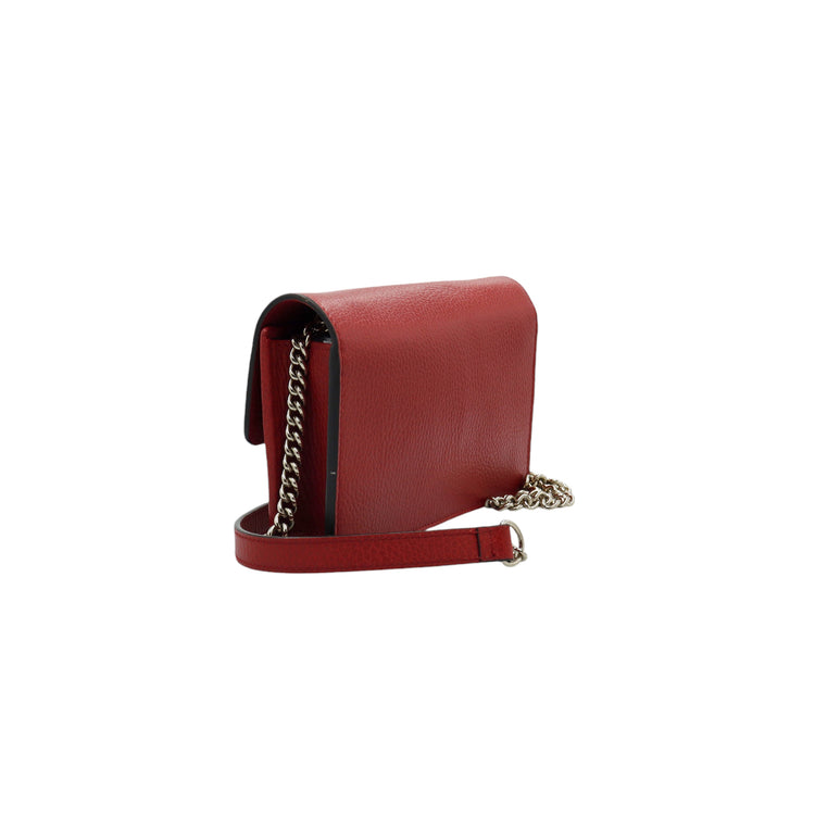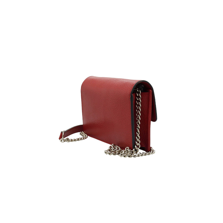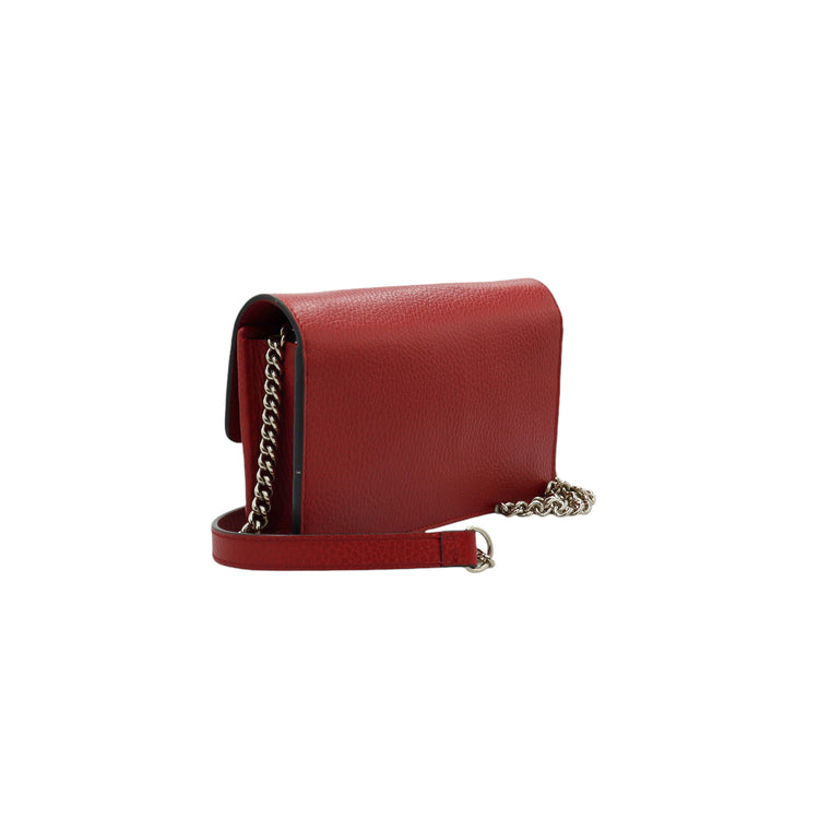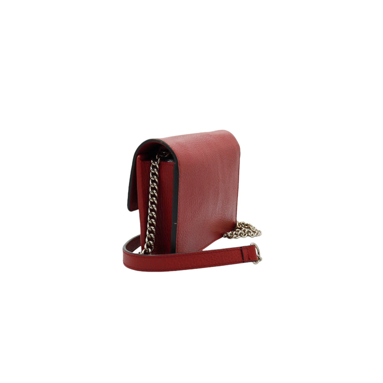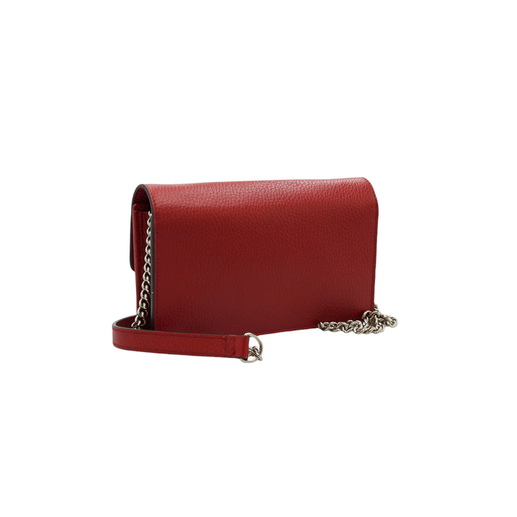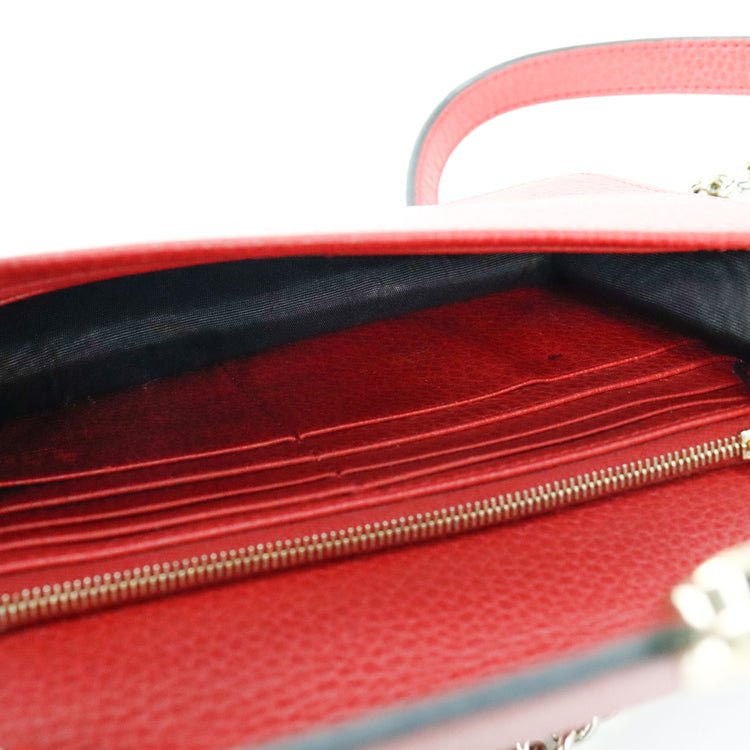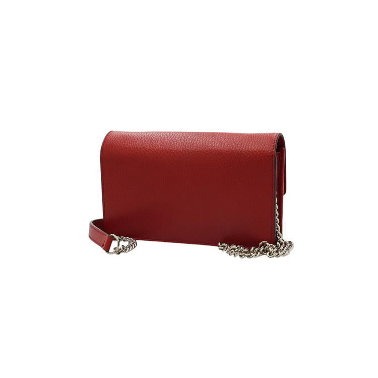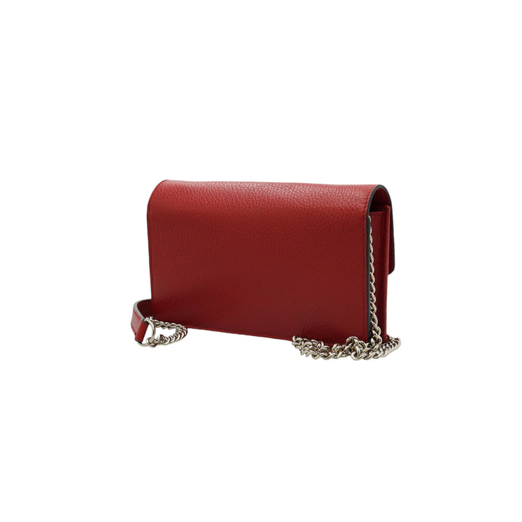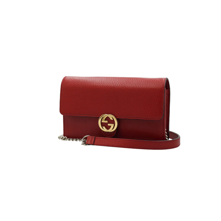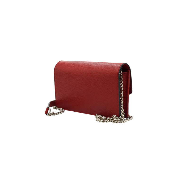 Bolso Gucci de la colección interlocking woc, confeccionado en piel color rojo, strap de cadena con piel, cierre a presión en la solapa y bolsillo interno con cremallera, herrajes en color dorado.