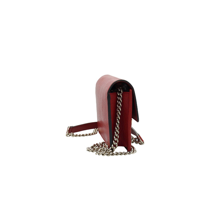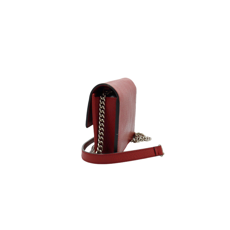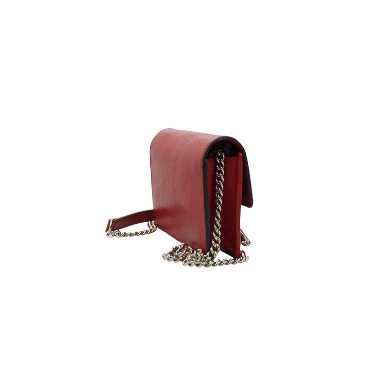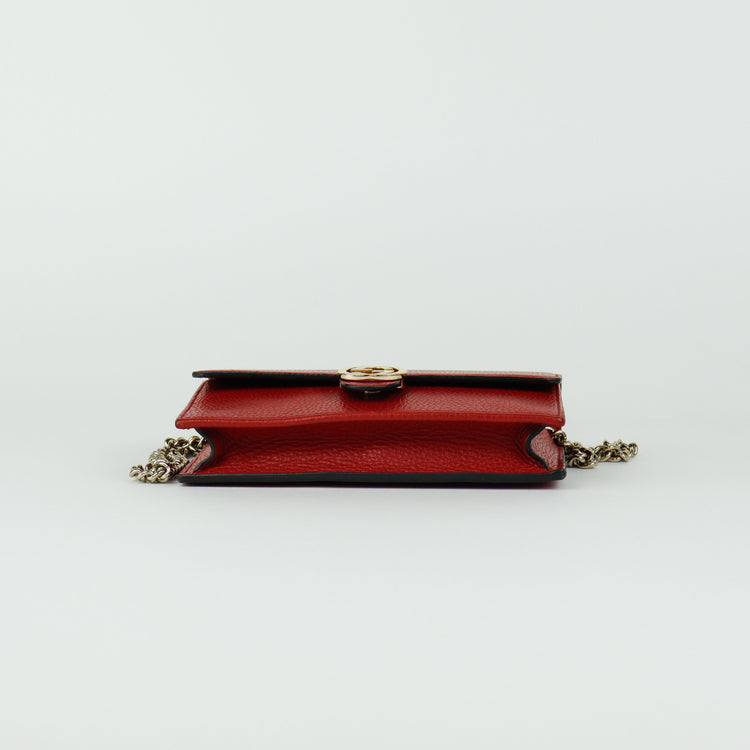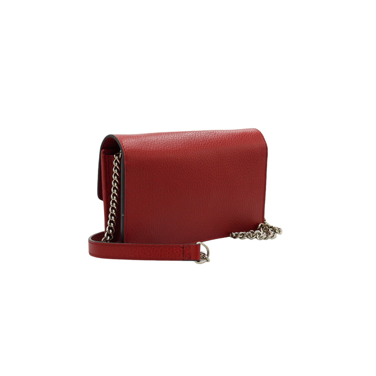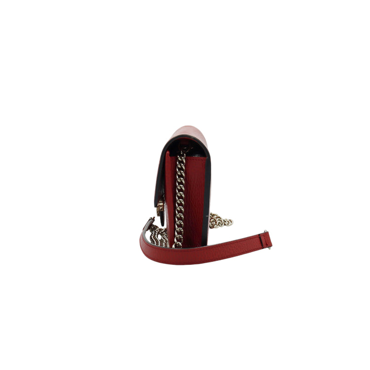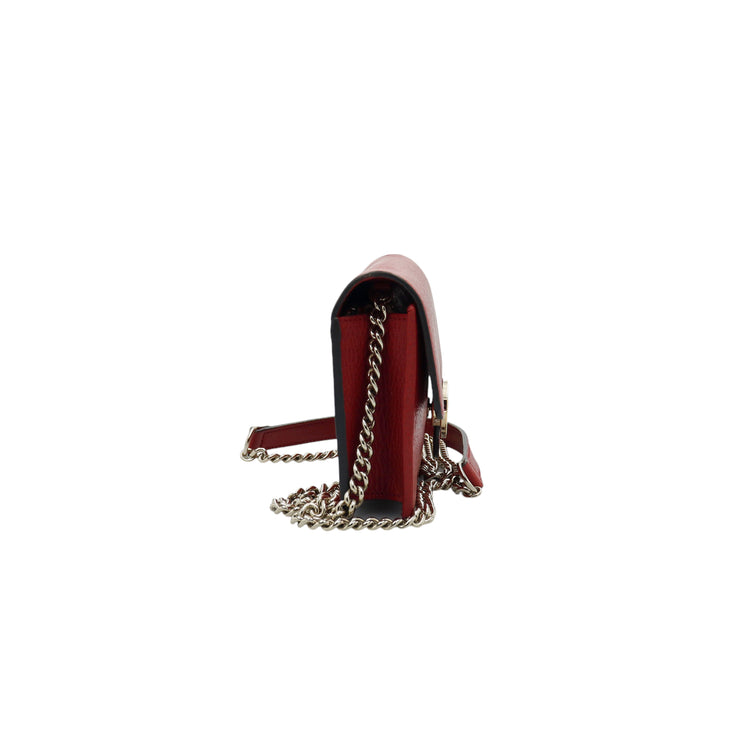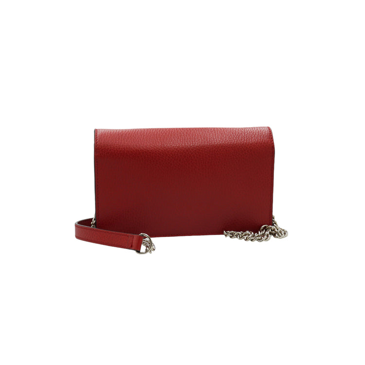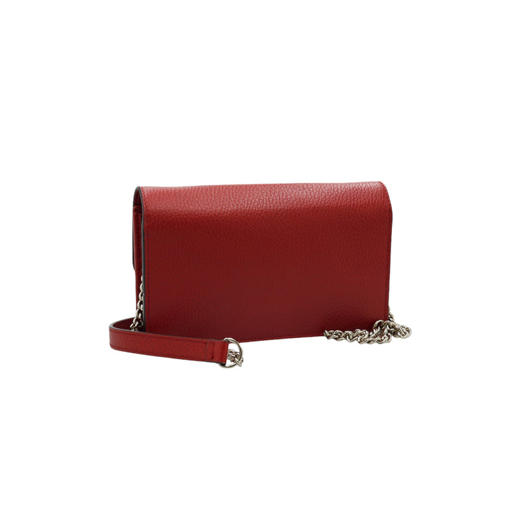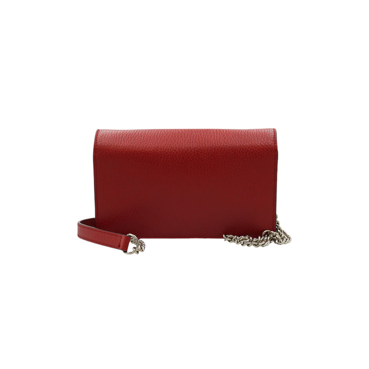 Bolso Gucci de la colección interlocking woc, confeccionado en piel color rojo, strap de cadena con piel, cierre a presión en la solapa y bolsillo interno con cremallera, herrajes en color dorado.