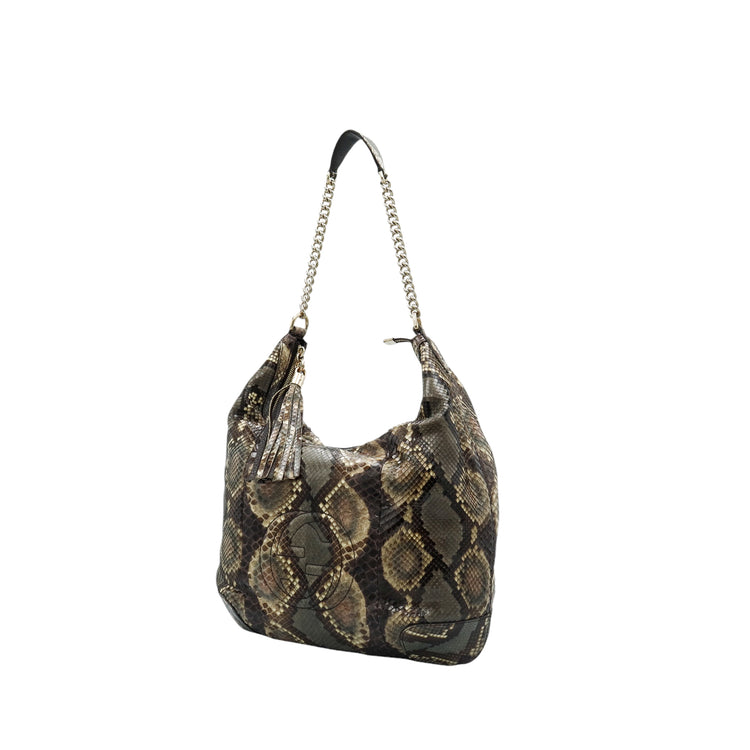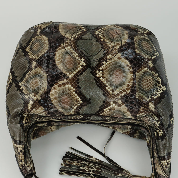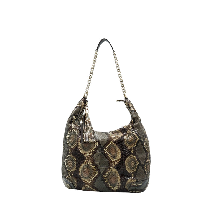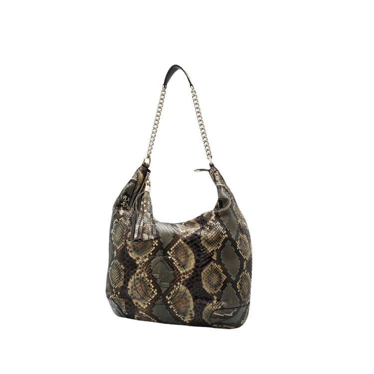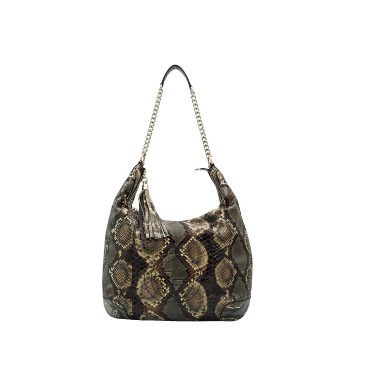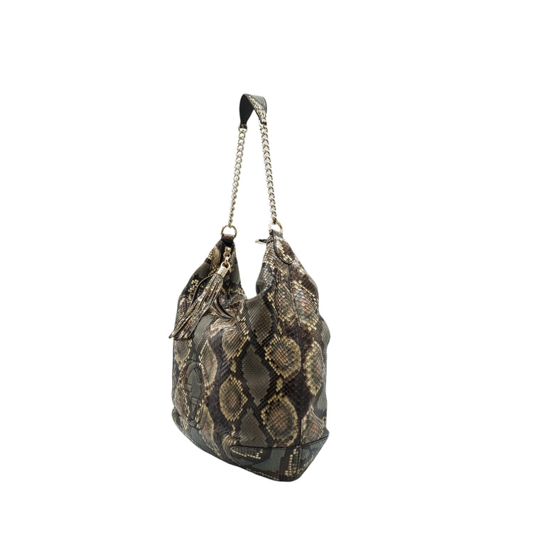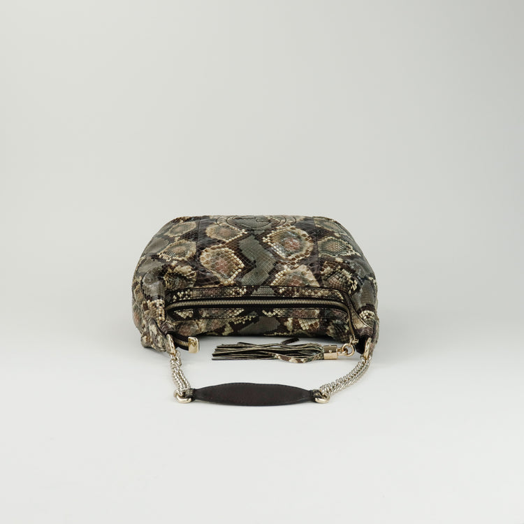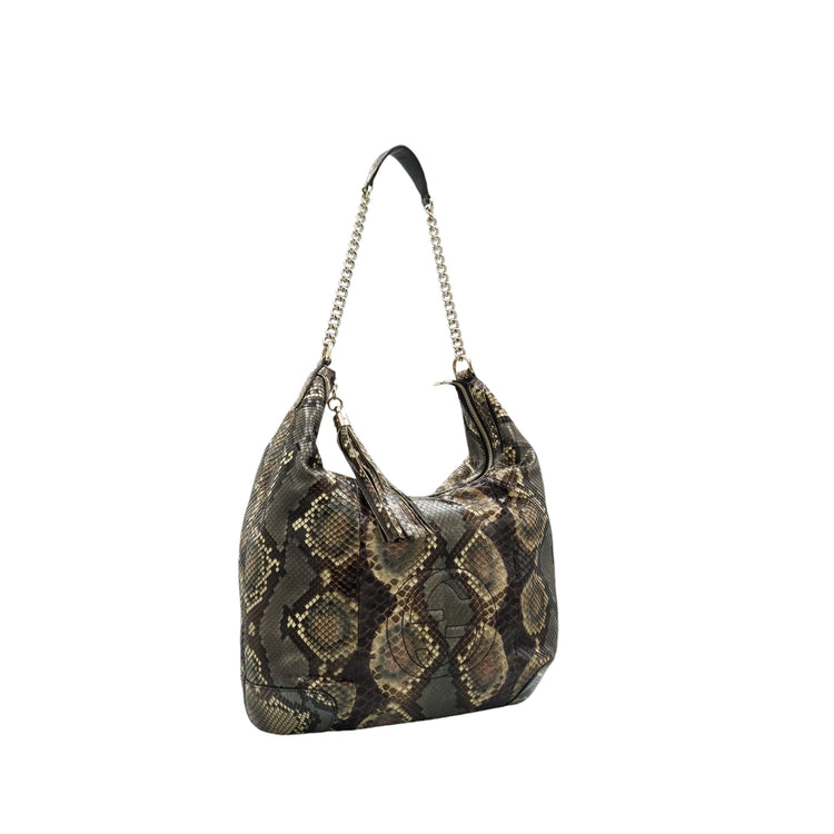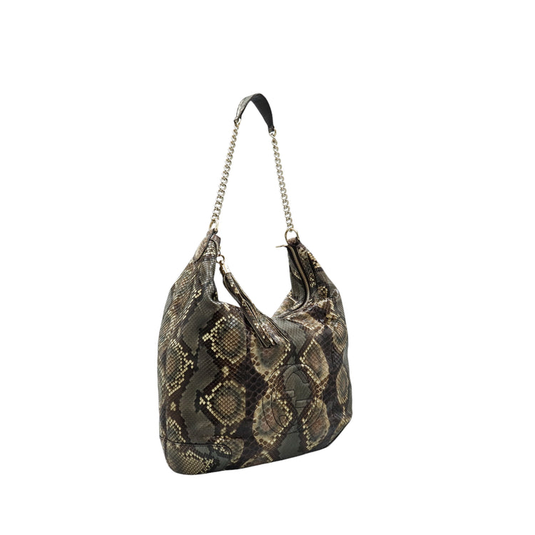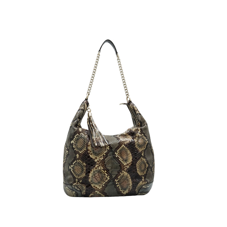Bolso Gucci modelo Soho, confeccionado en tipo piel exótica, con forro interno en textil, herrajes en color dorado con cierre de cremallera. (Con olor a humedad).