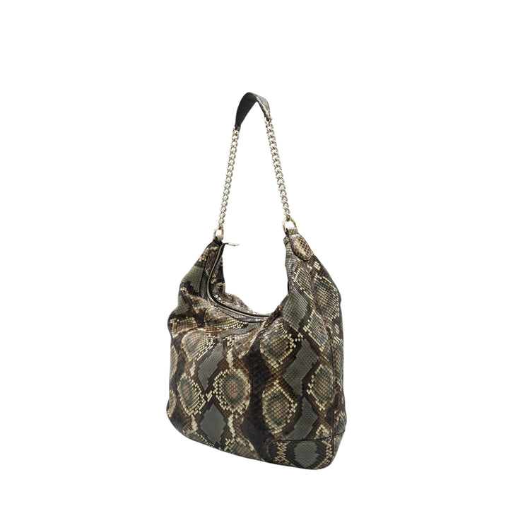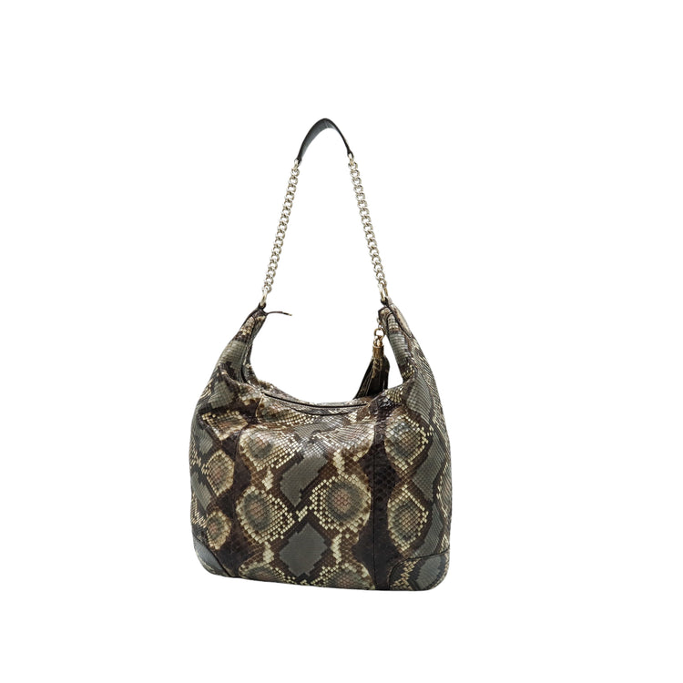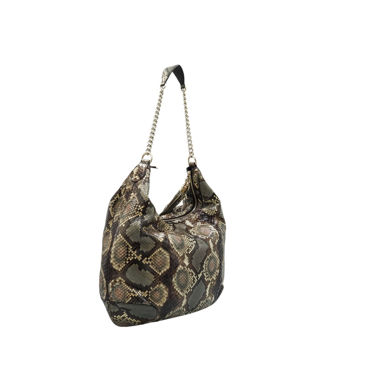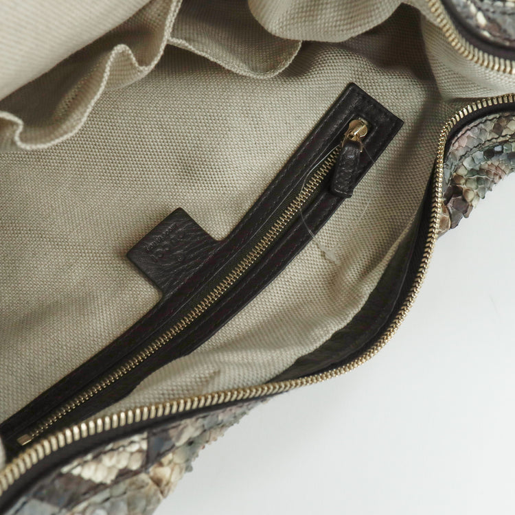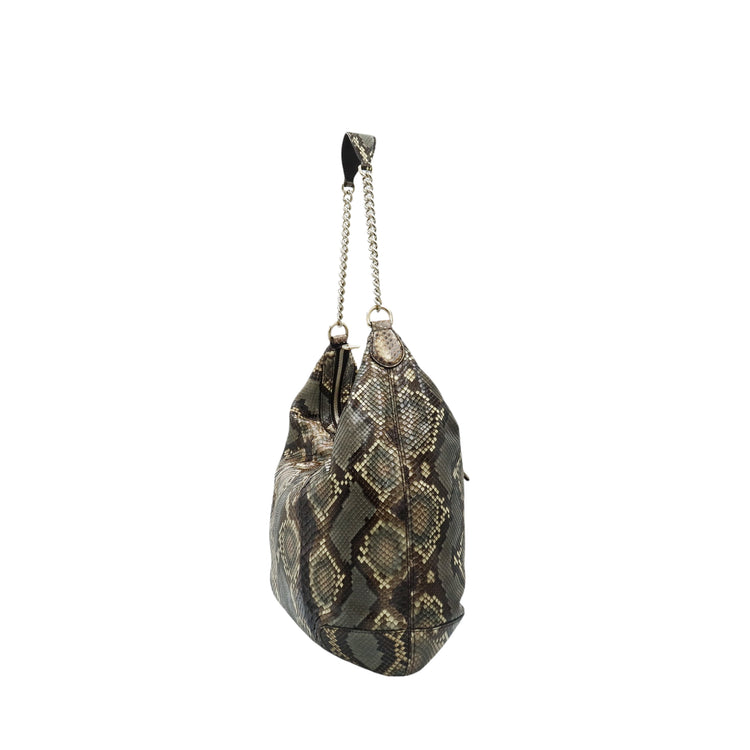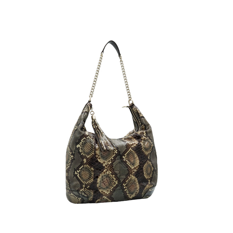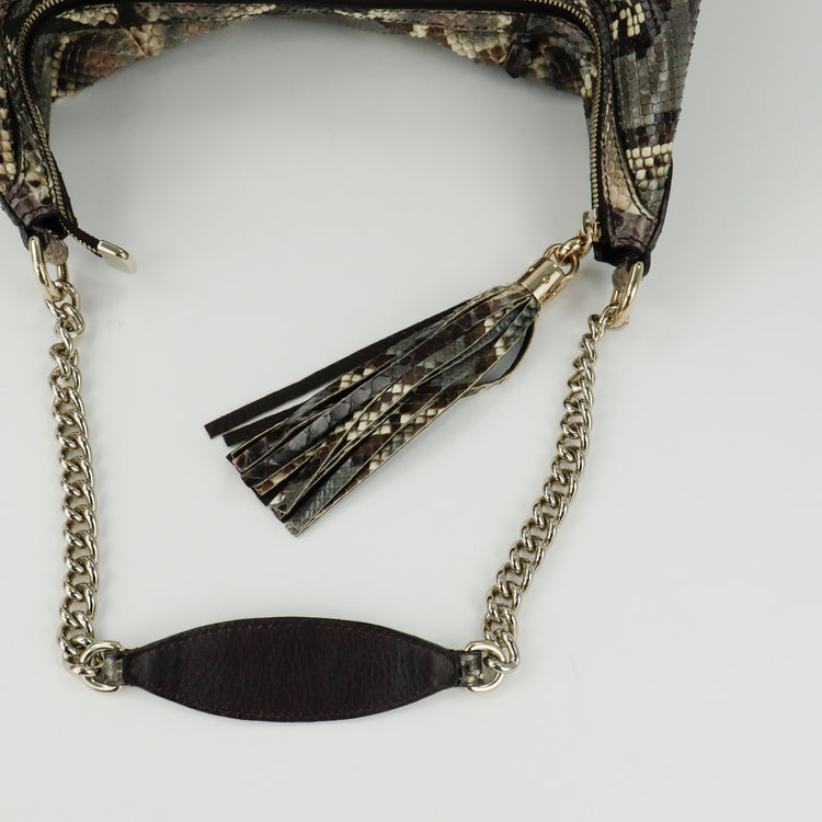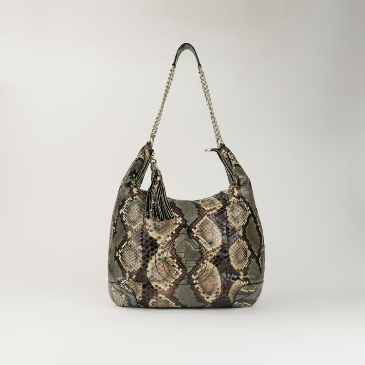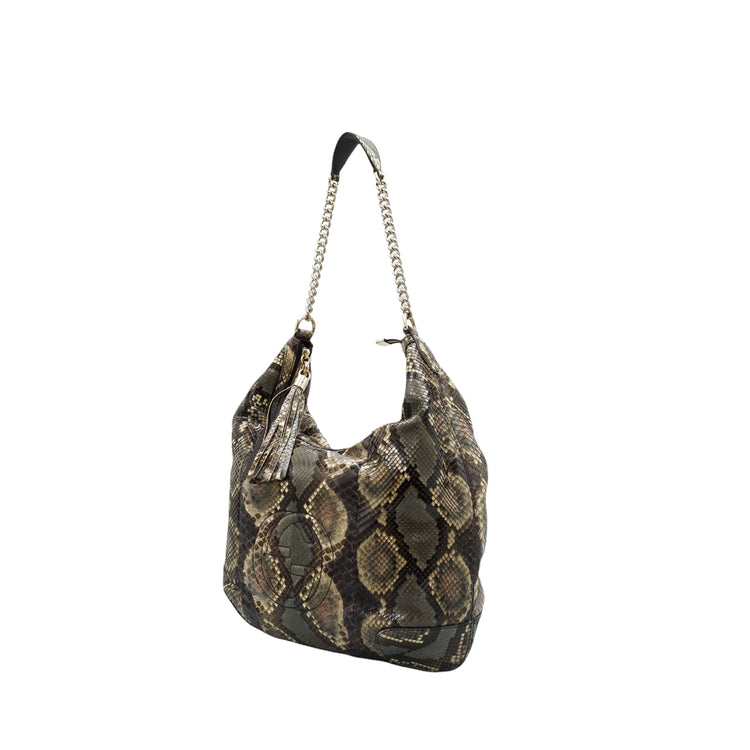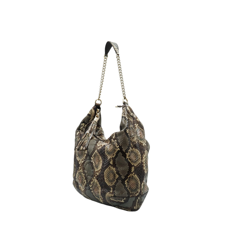 Bolso Gucci modelo Soho, confeccionado en tipo piel exótica, con forro interno en textil, herrajes en color dorado con cierre de cremallera. (Con olor a humedad).