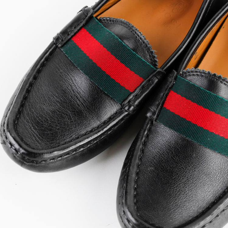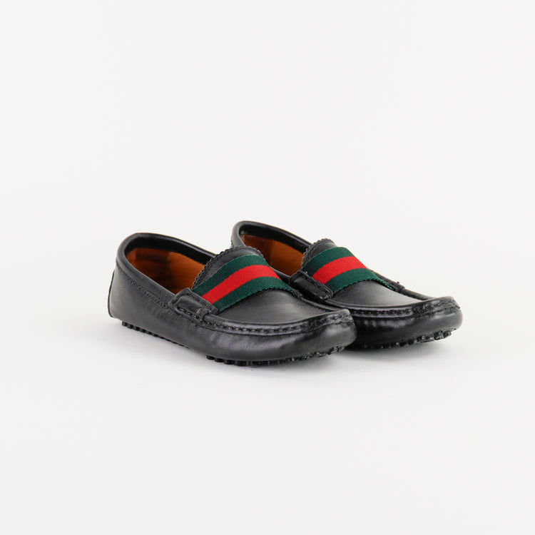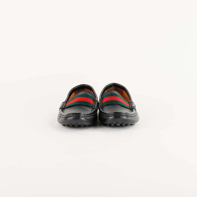 Mocasines para niño Gucci en piel color negro, con cinta frontal verde y roja característica de la marca. Un diseño elegante y distintivo para ocasiones especiales.