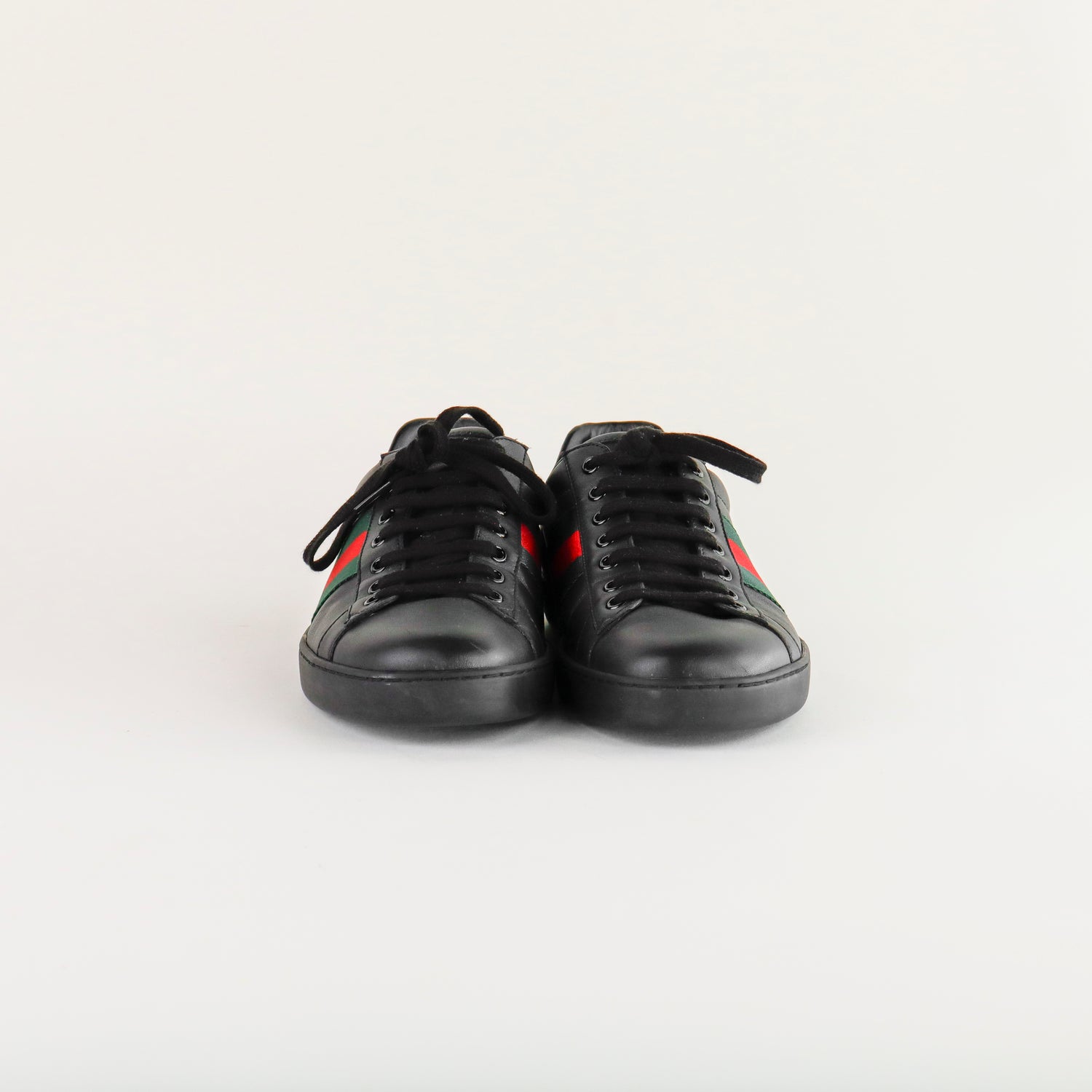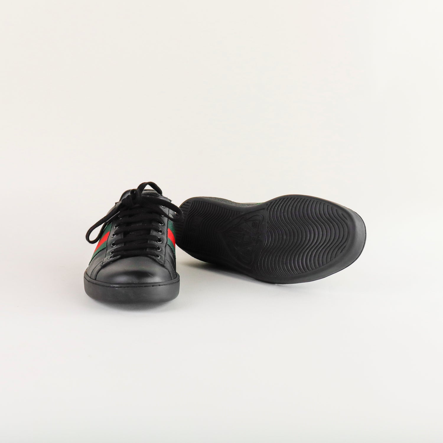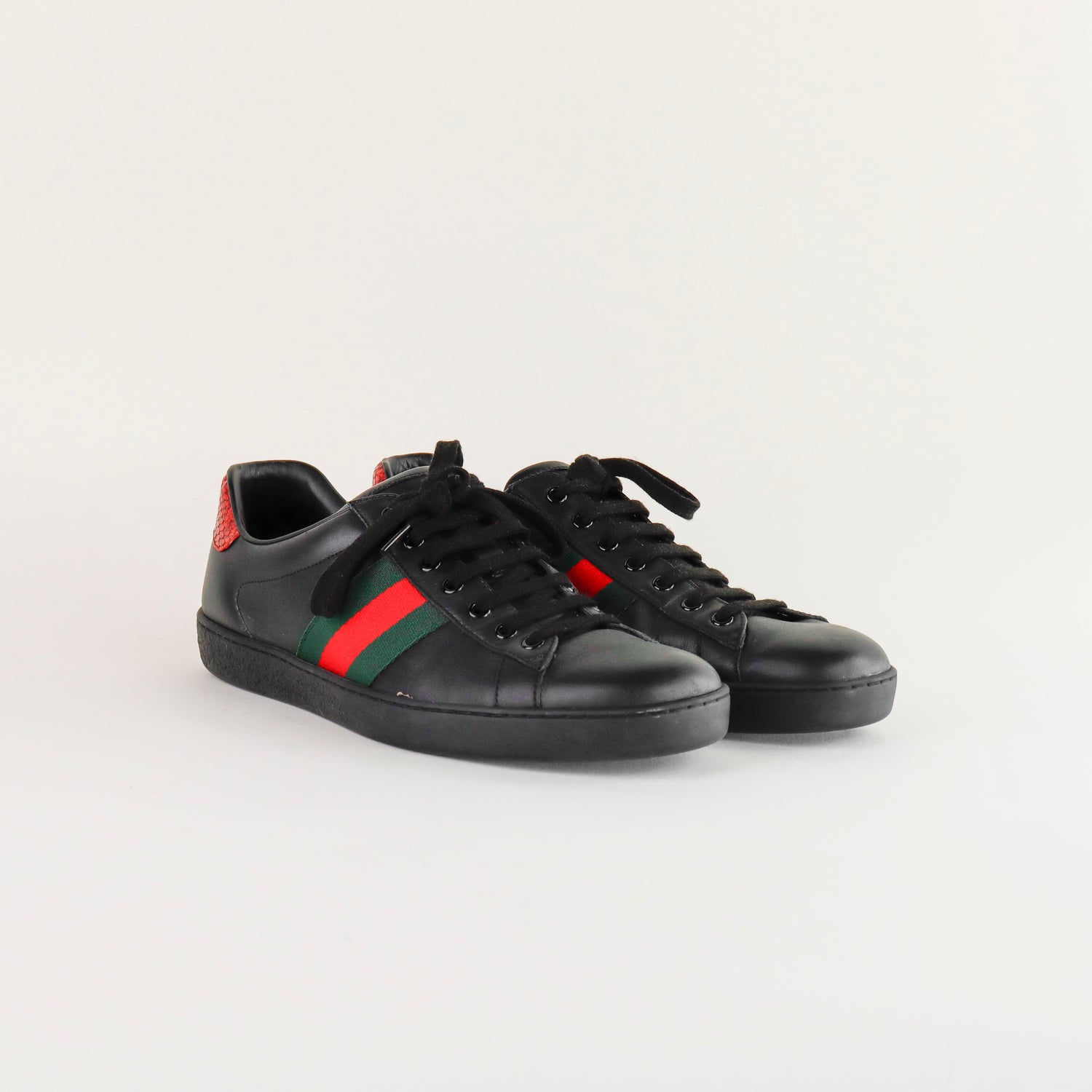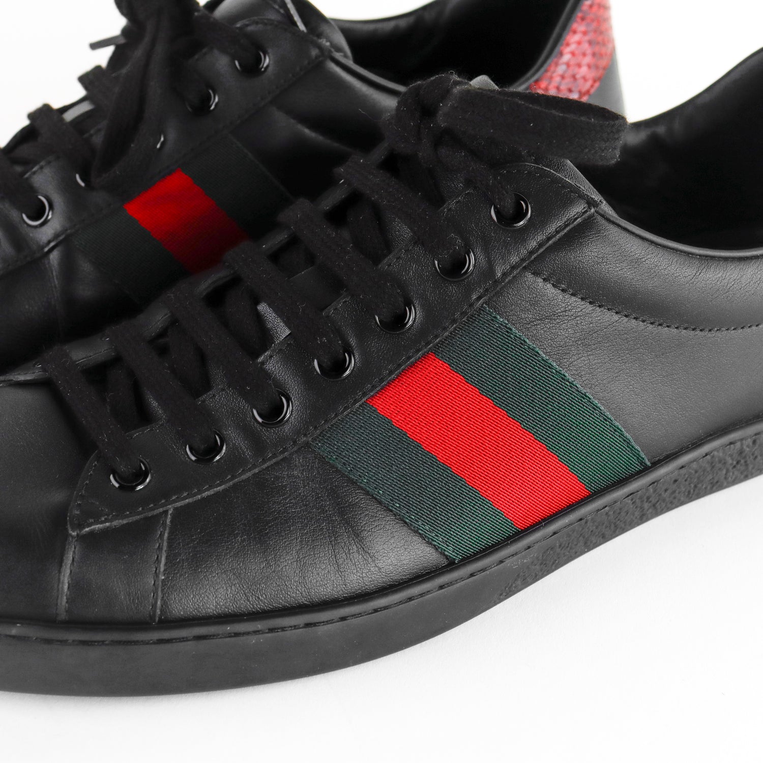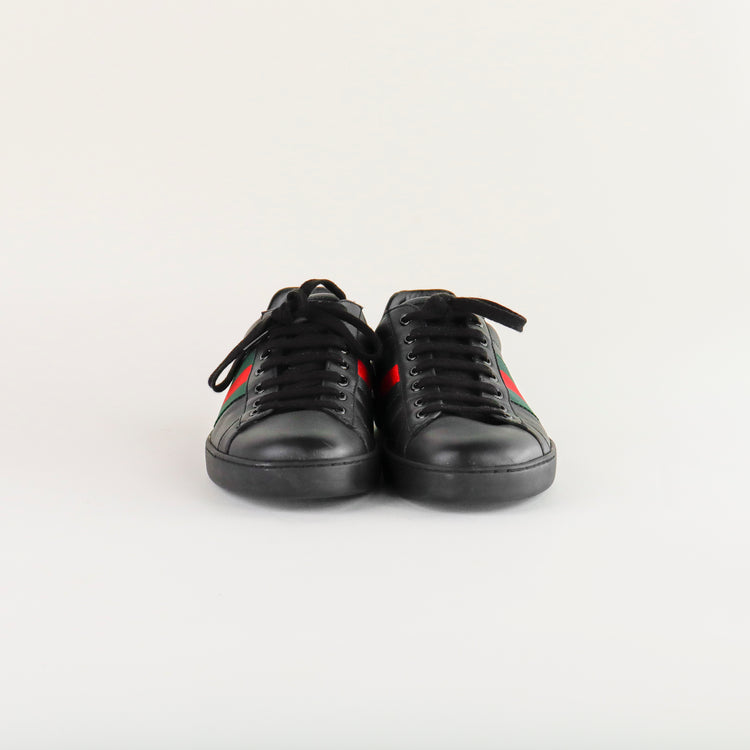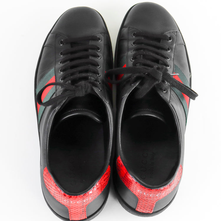 Tenis Gucci Ace en piel negra con tribanda lateral y detalle tipo piel de víbora.