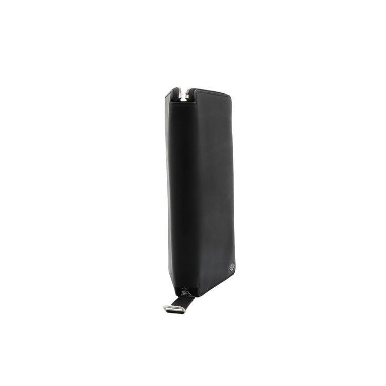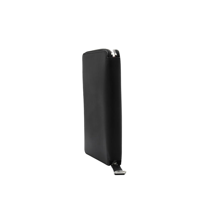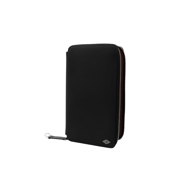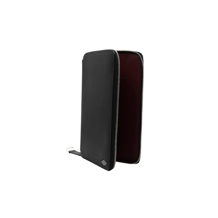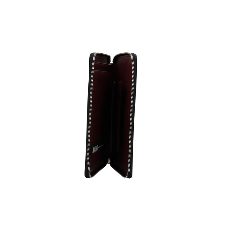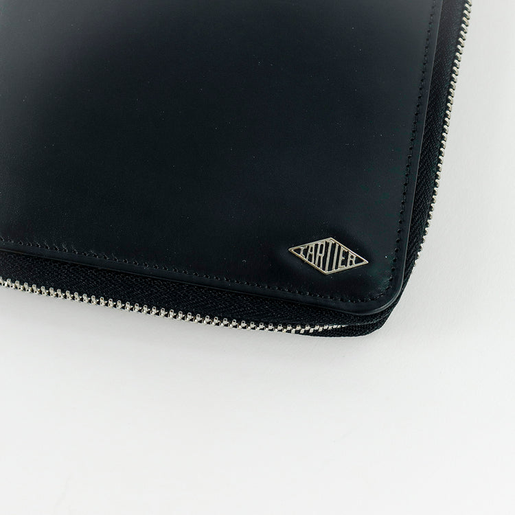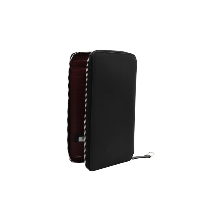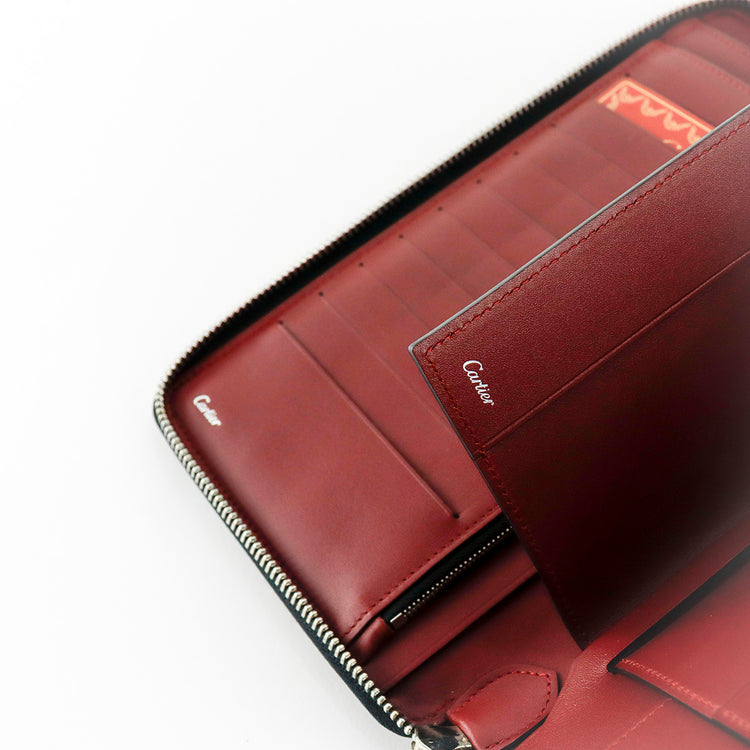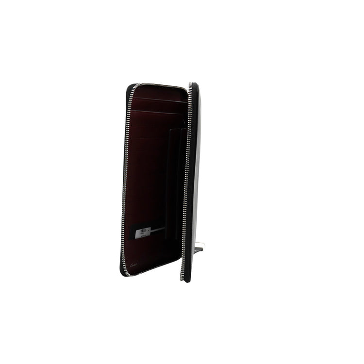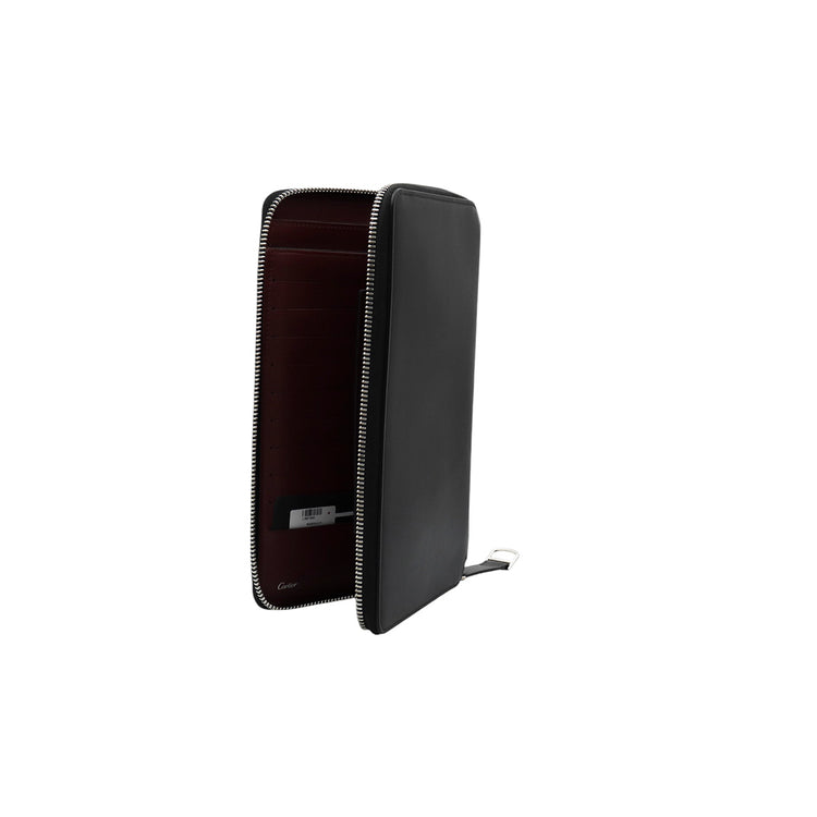 Tarjetero Cartier, confeccionado en piel color negro, forro interno en color vino, herrajes y cremallera en color plata, con funda y tarjeta de autenticidad.