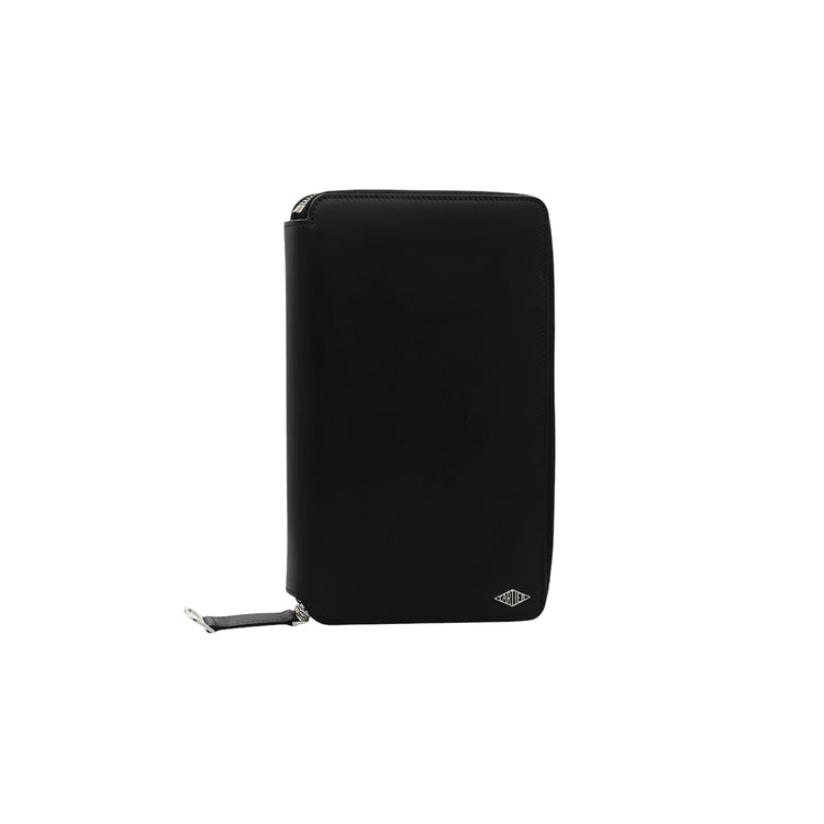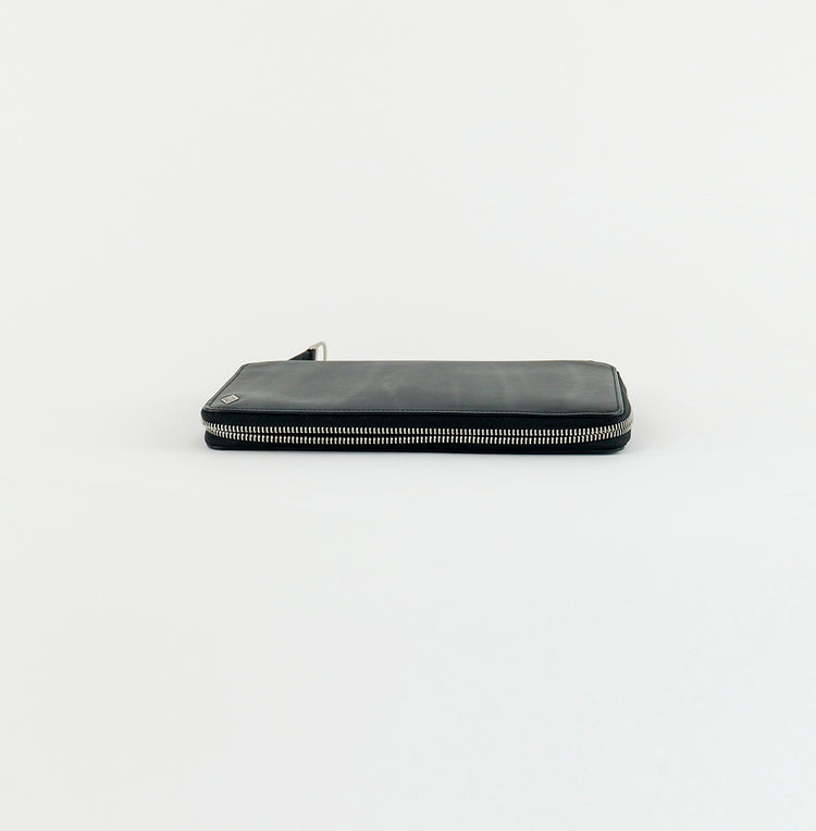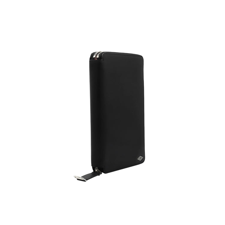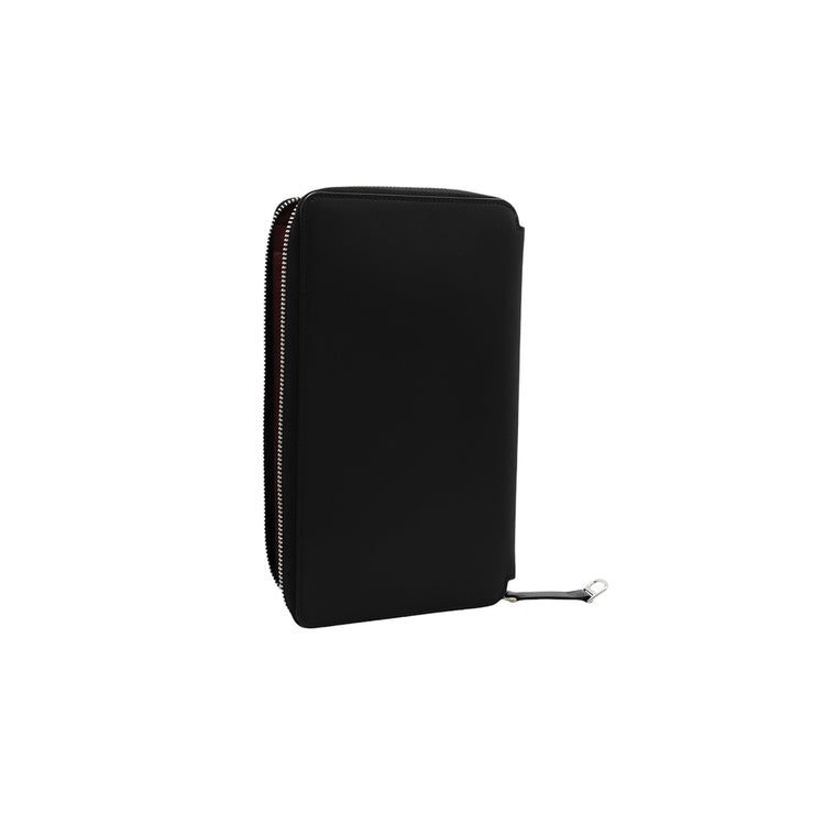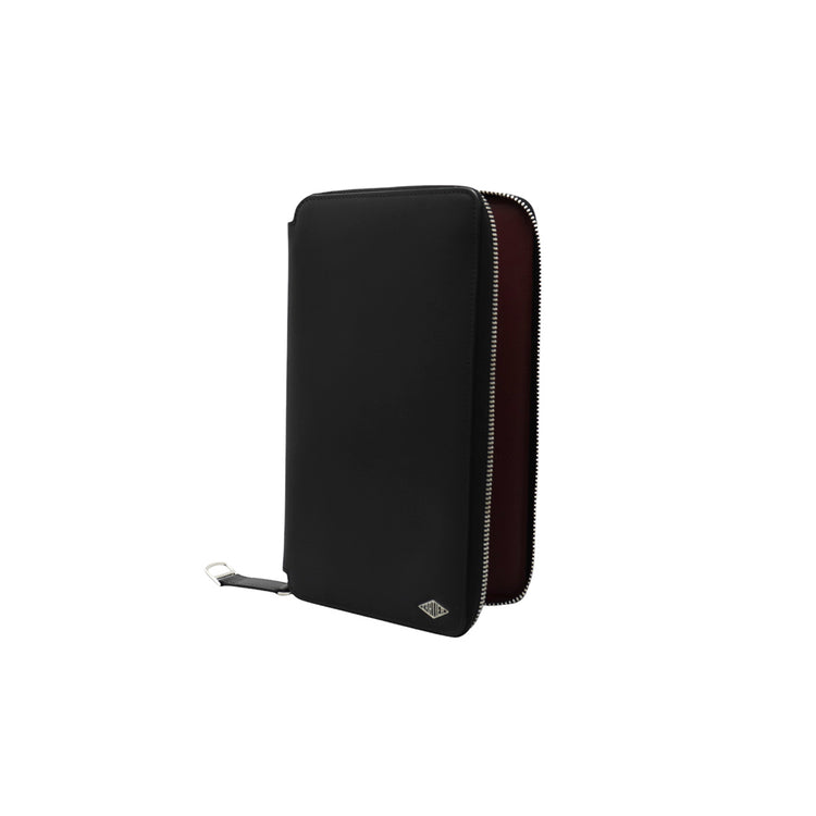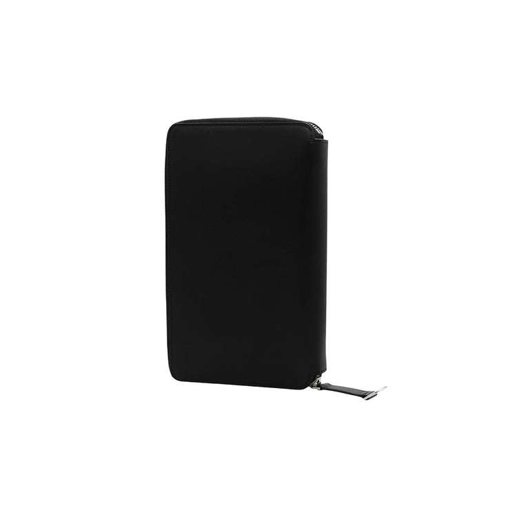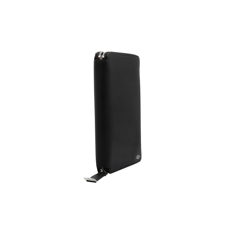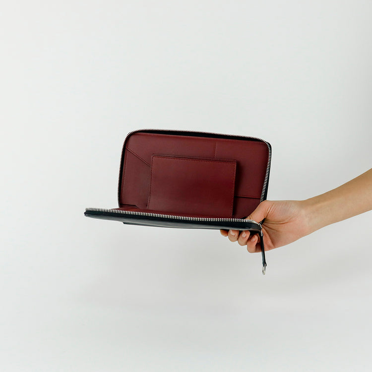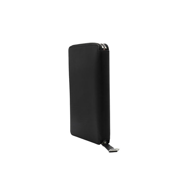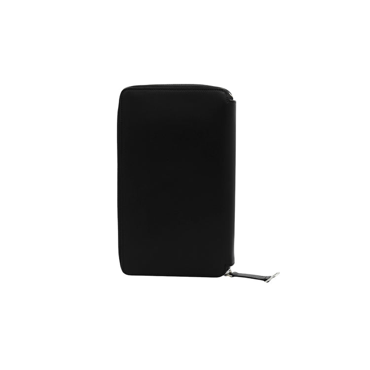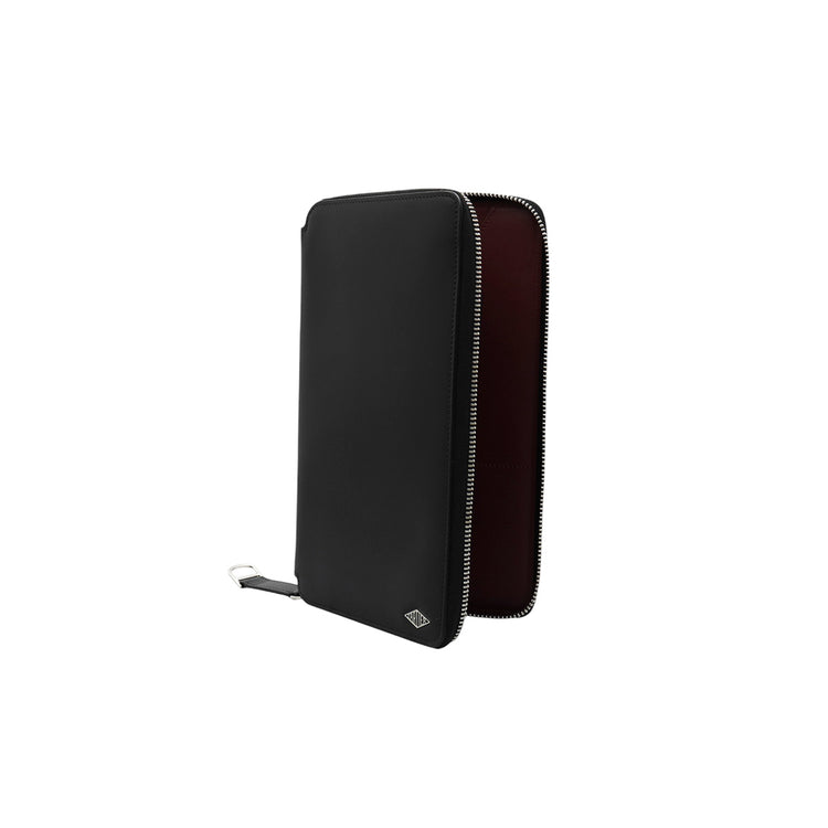 Tarjetero Cartier, confeccionado en piel color negro, forro interno en color vino, herrajes y cremallera en color plata, con funda y tarjeta de autenticidad.