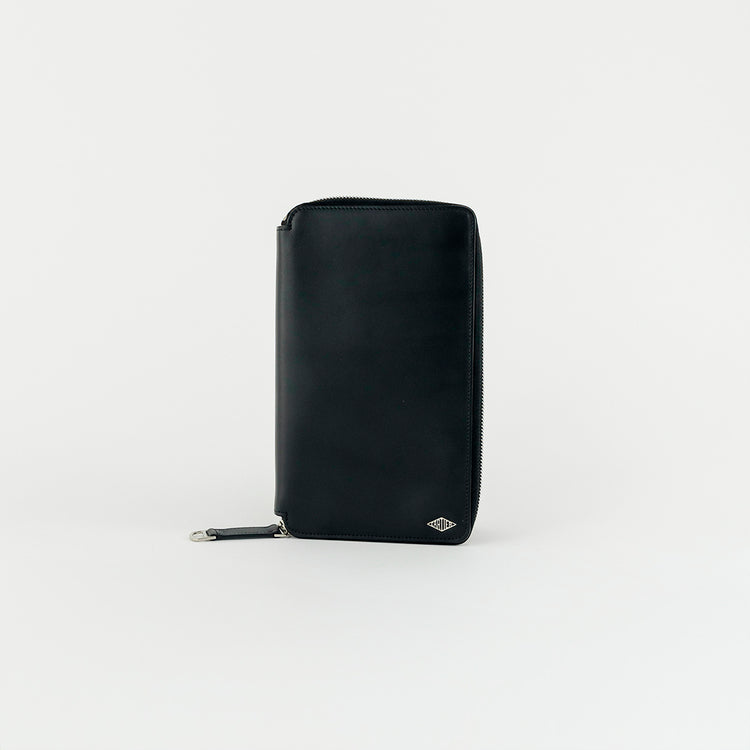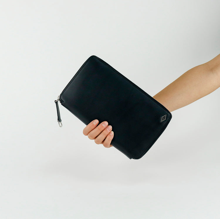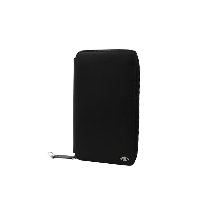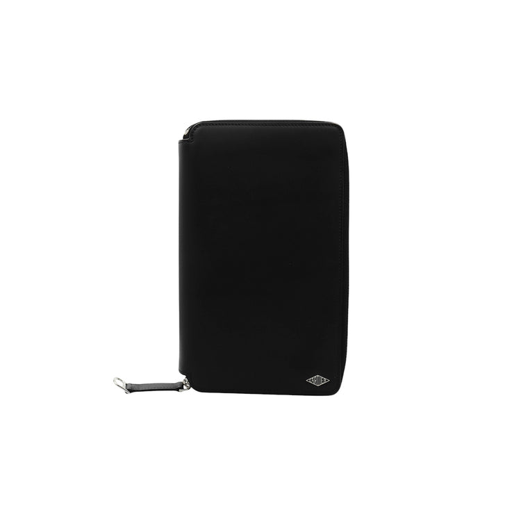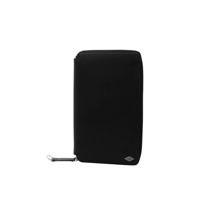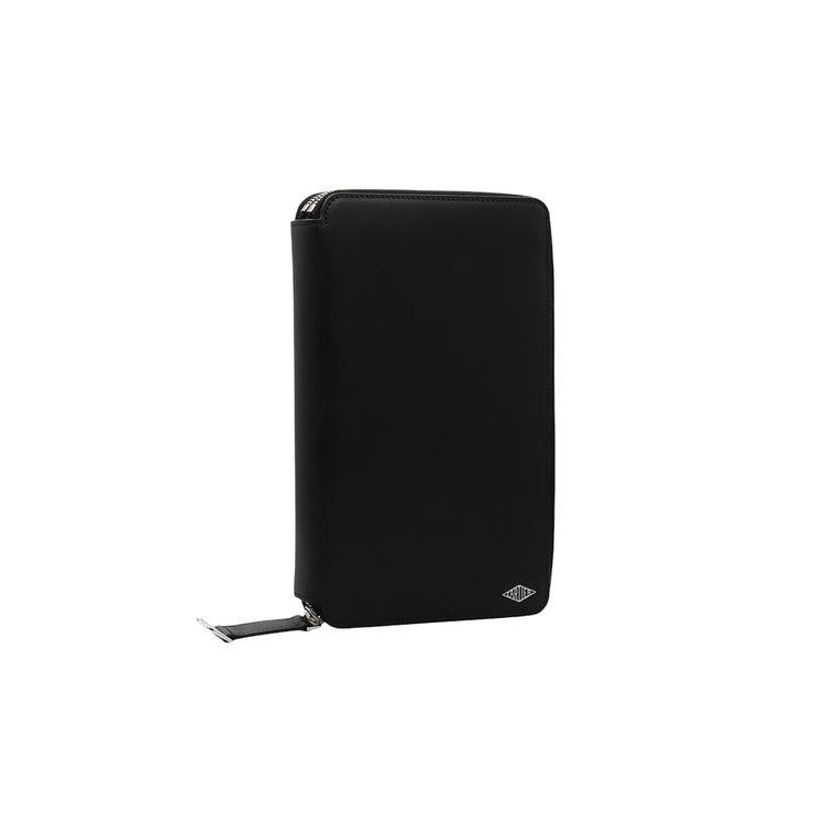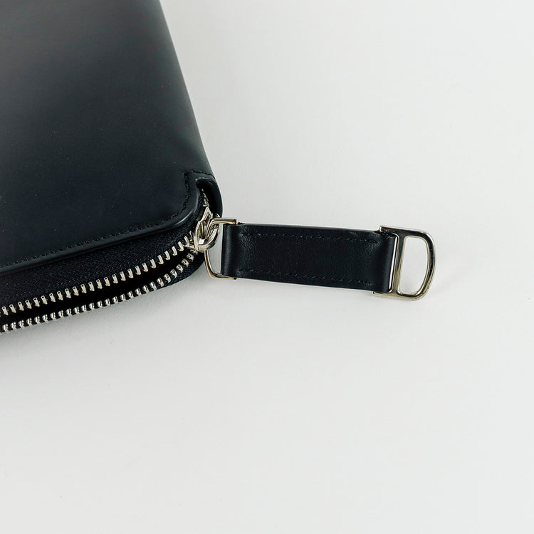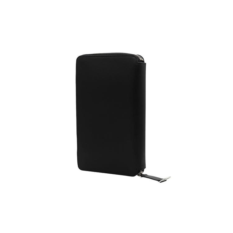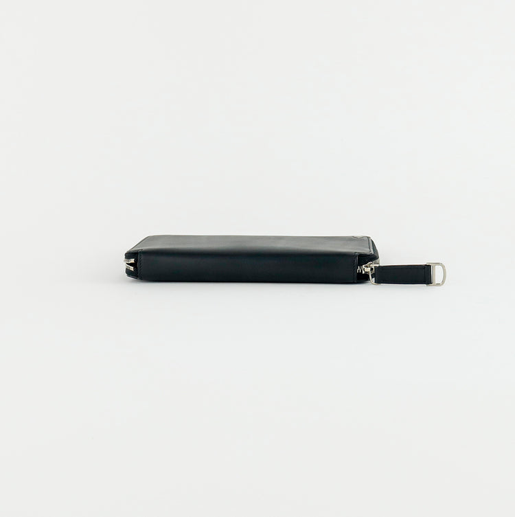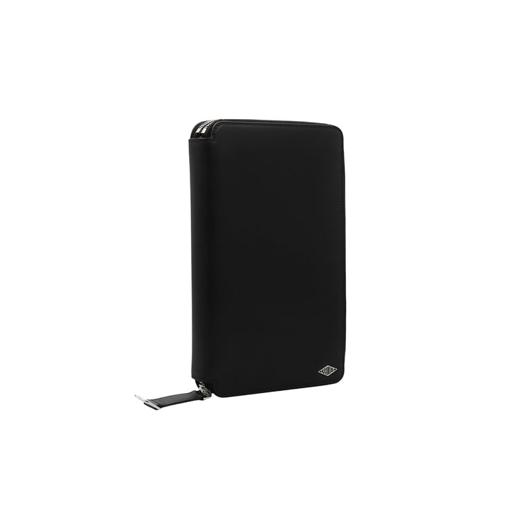 Tarjetero Cartier, confeccionado en piel color negro, forro interno en color vino, herrajes y cremallera en color plata, con funda y tarjeta de autenticidad.