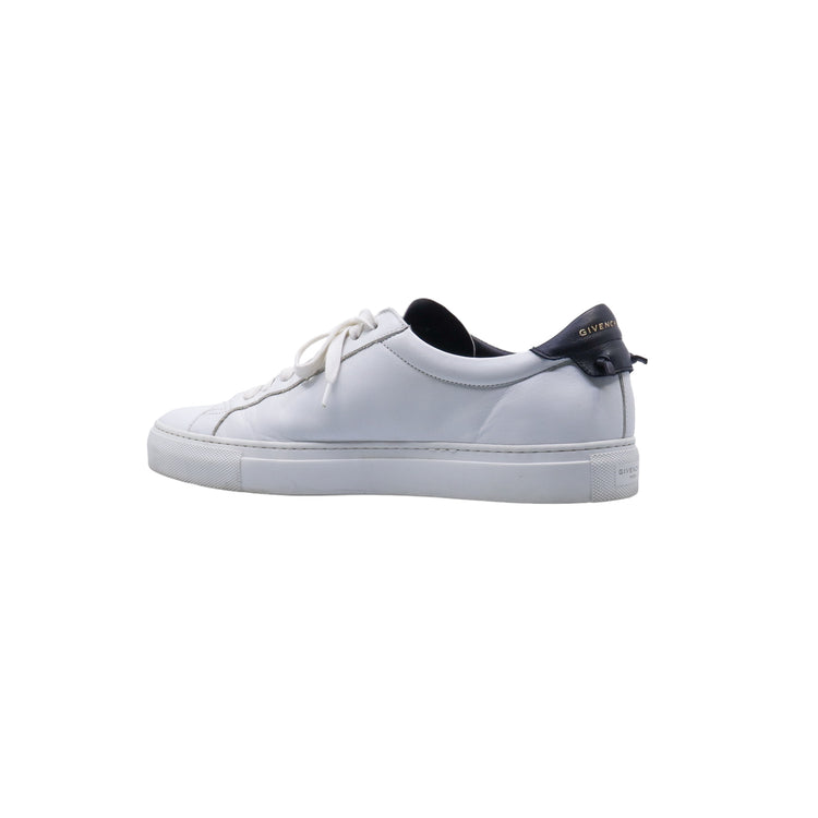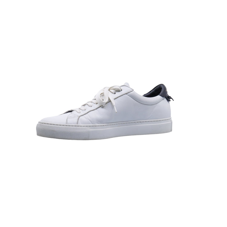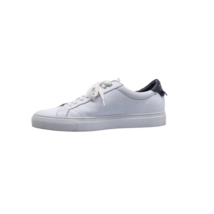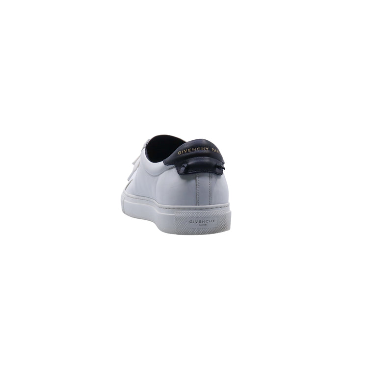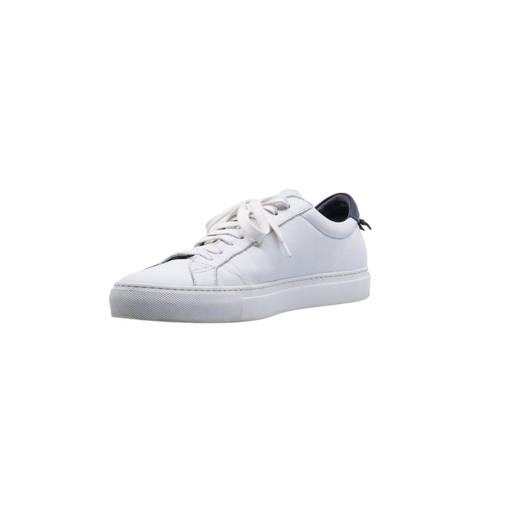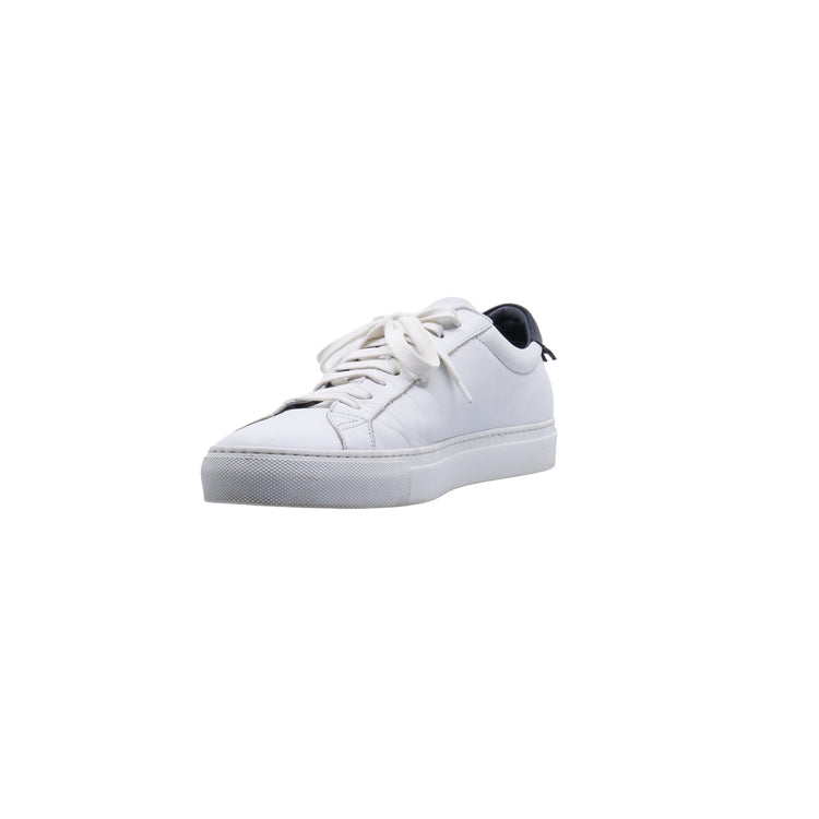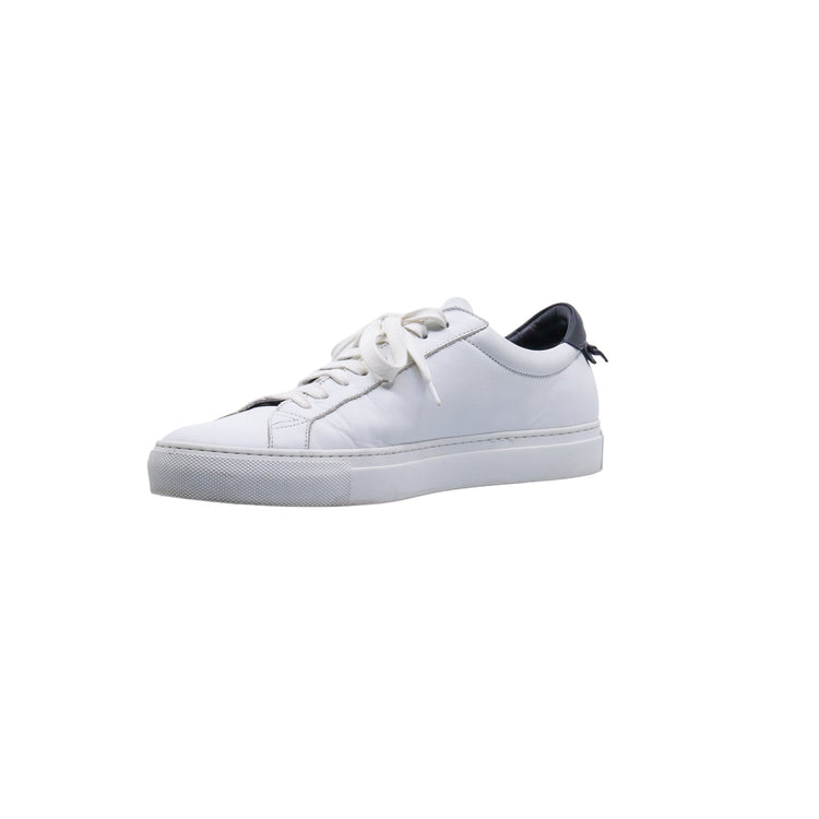 Sneakers Givenchy de la línea B Urban Street, confeccionados en piel color blanco con la marca perforada en los costados y parche de color negro en el talón, pocos sucios con desgaste por uso regular.