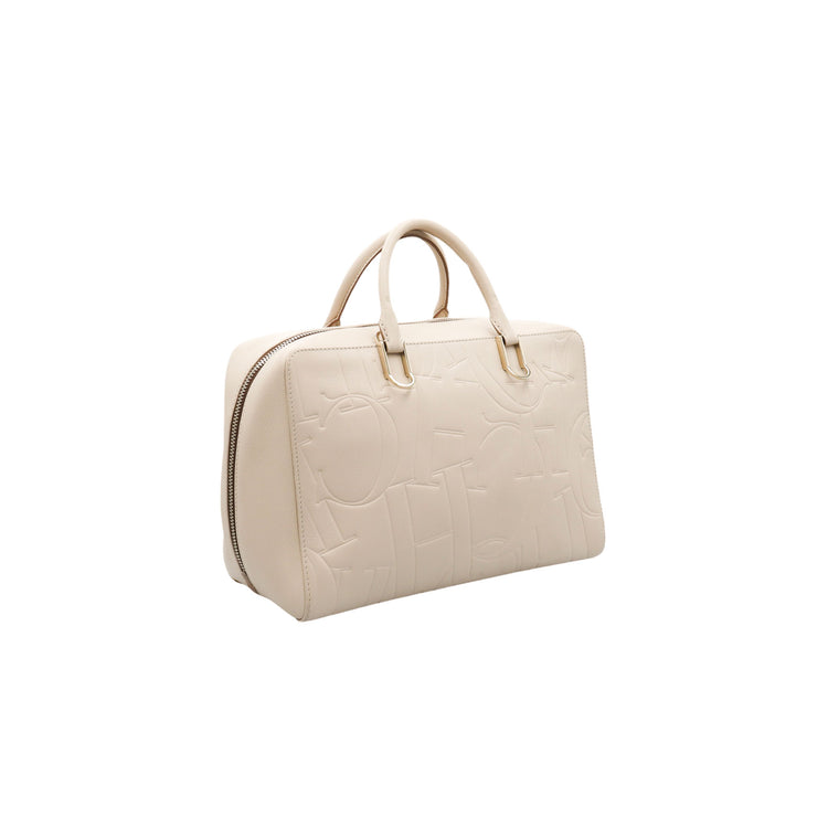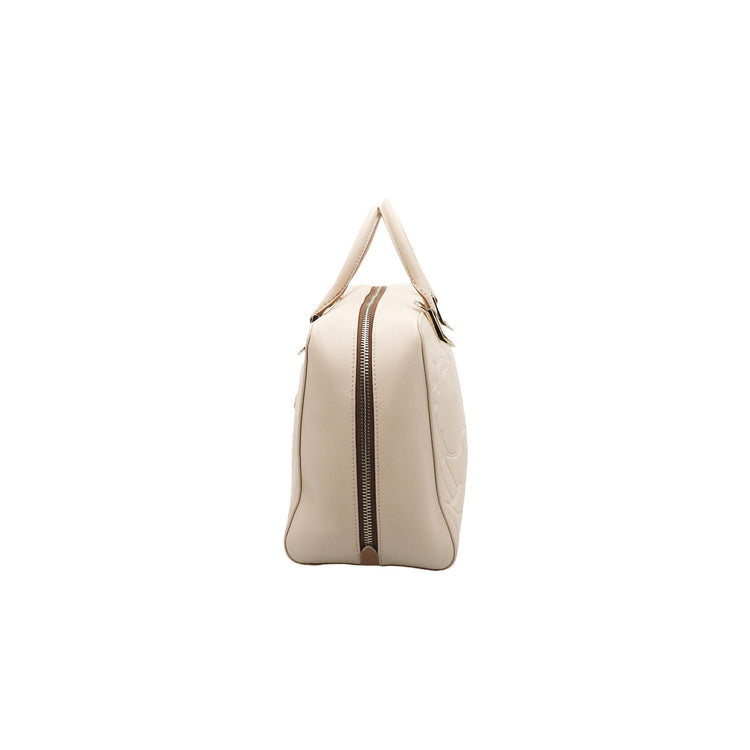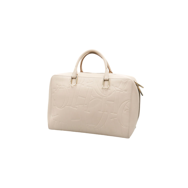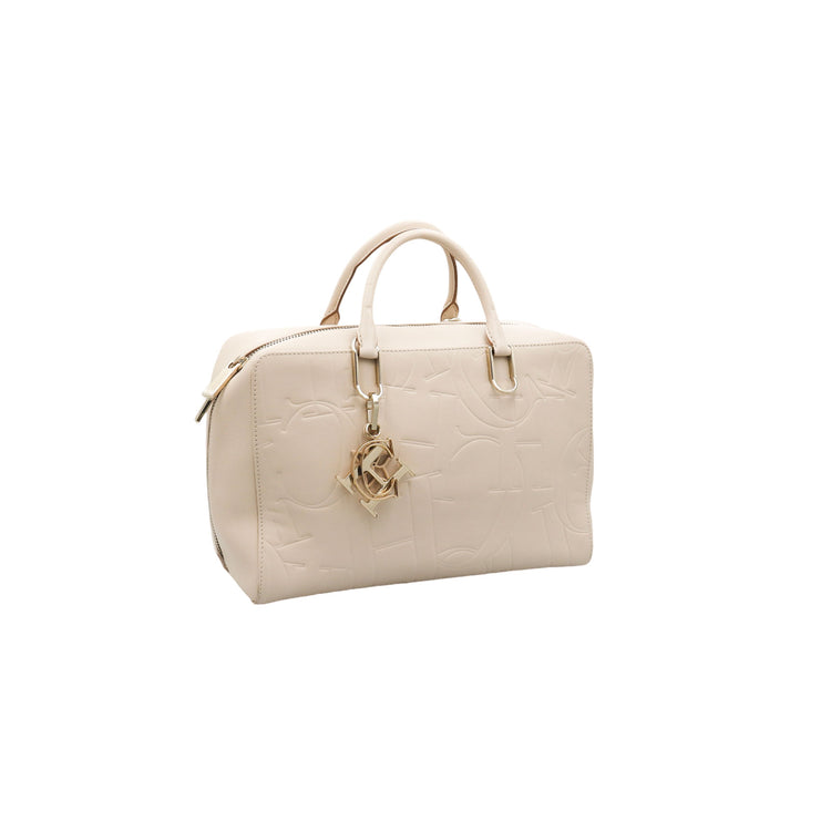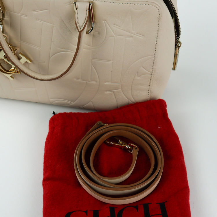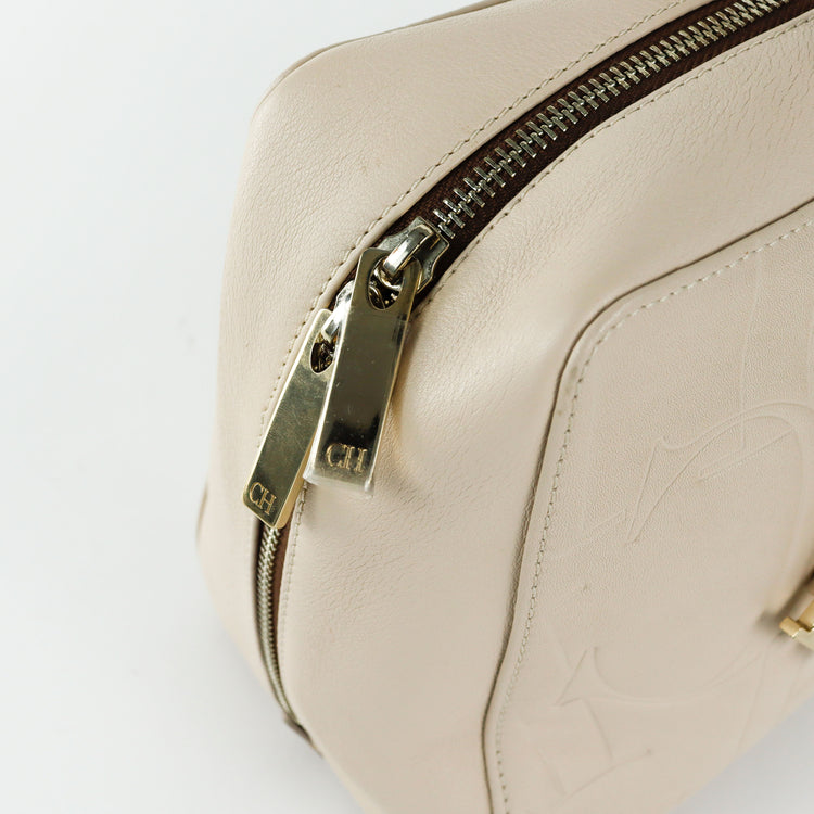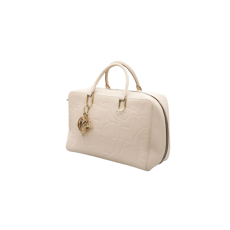 Bolso Carolina Herrera de la línea Duke Bag, confeccionada en piel de becerro color beige, con forro interno en yute con 2 bolsillos internos, cierres tipo cremallera, charm y herrajes en color dorado.