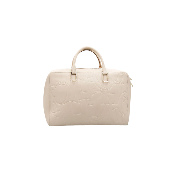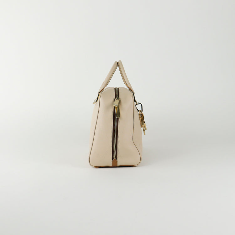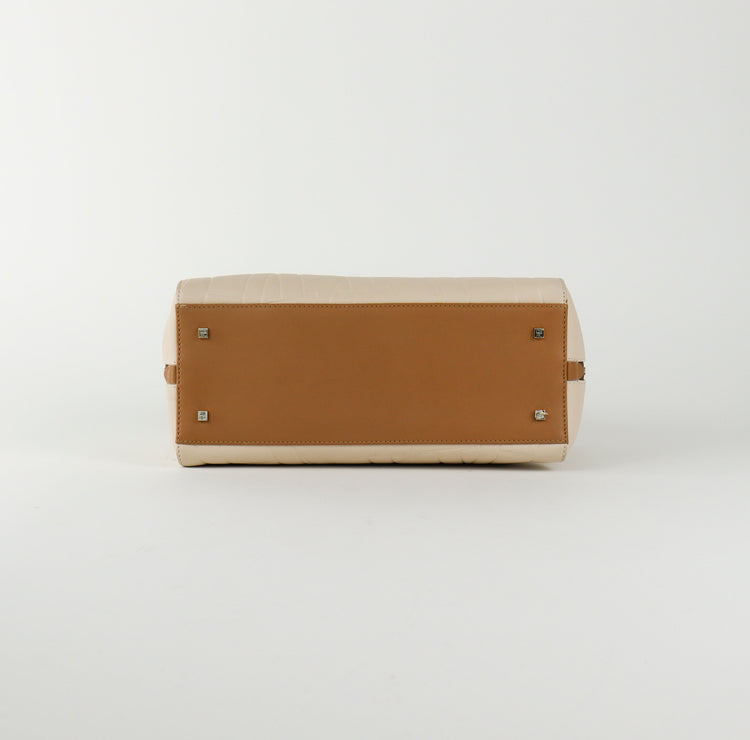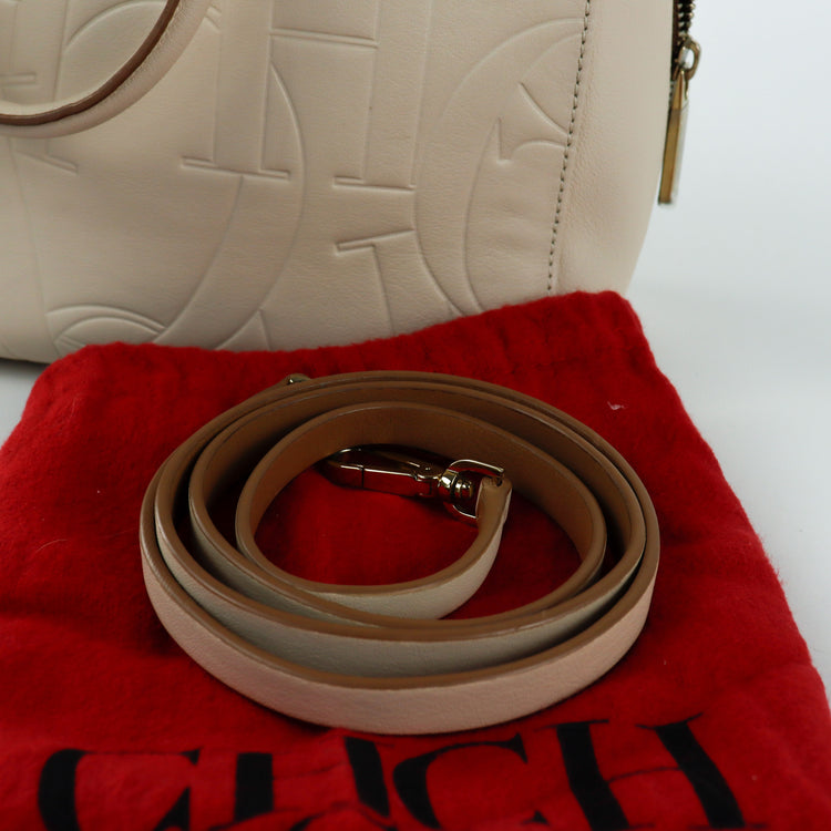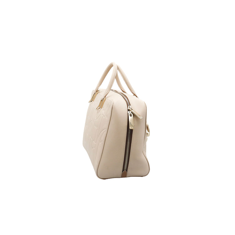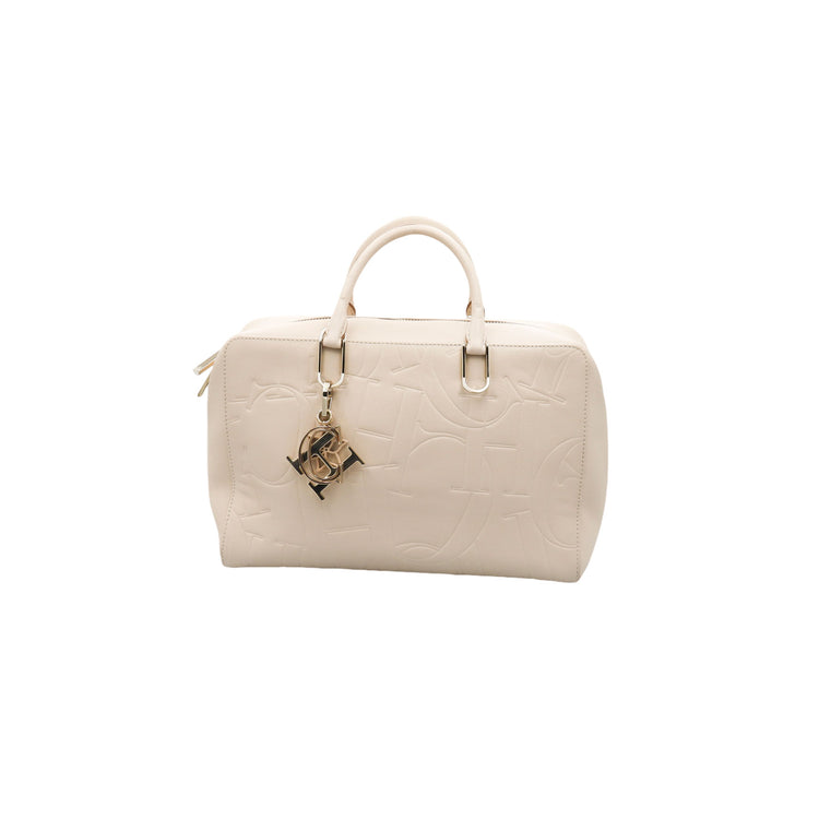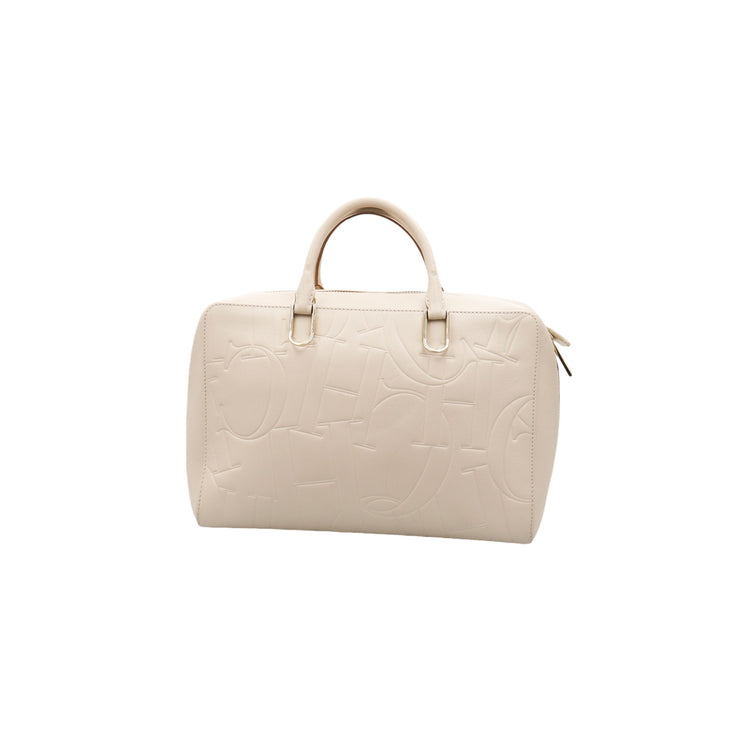 Bolso Carolina Herrera de la línea Duke Bag, confeccionada en piel de becerro color beige, con forro interno en yute con 2 bolsillos internos, cierres tipo cremallera, charm y herrajes en color dorado.