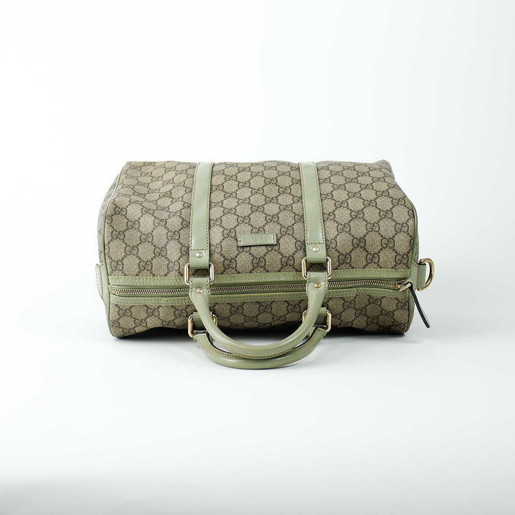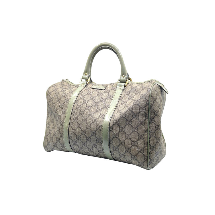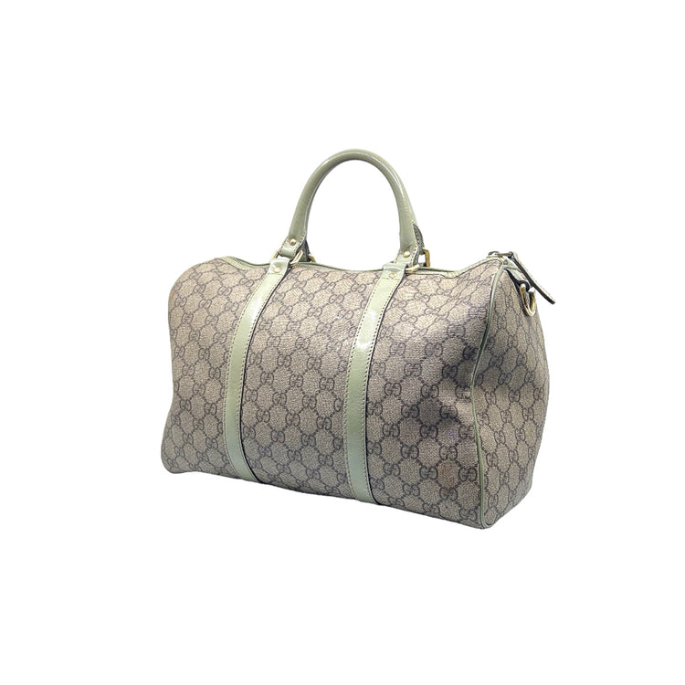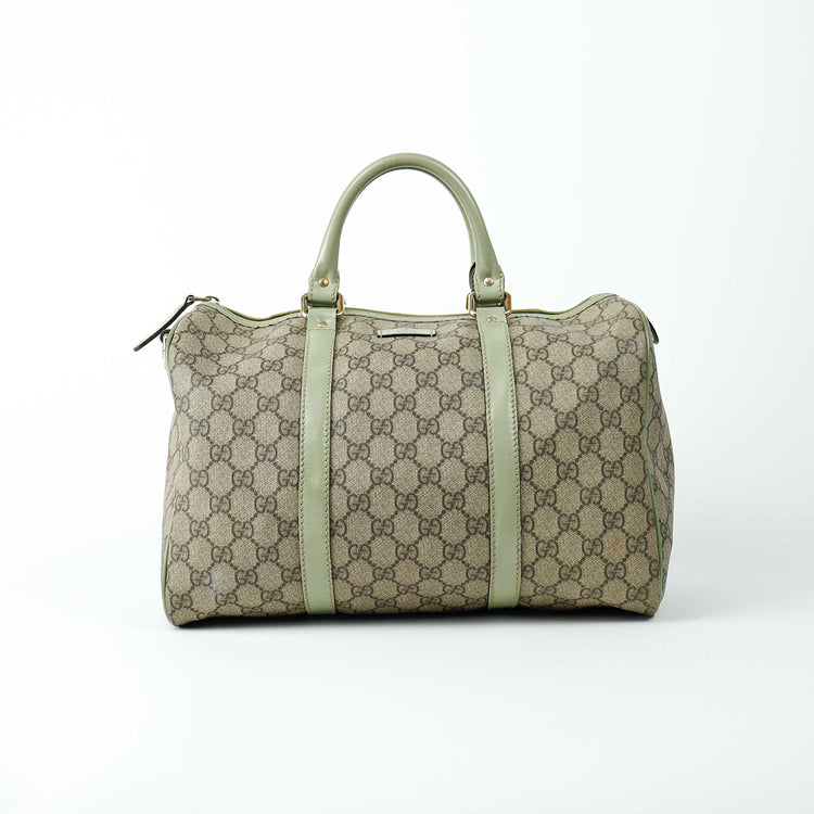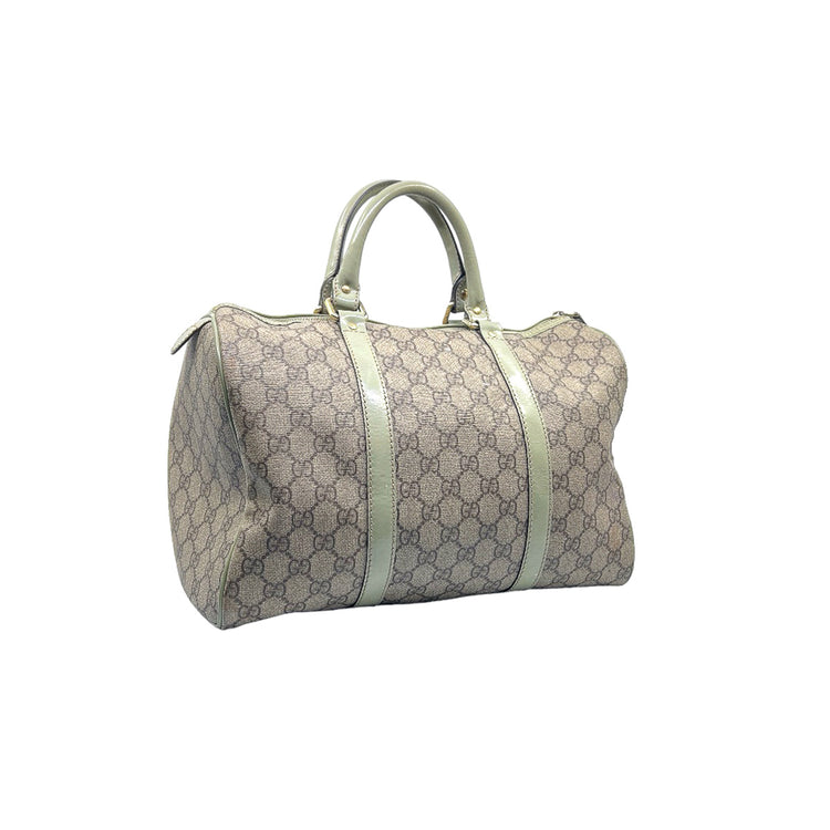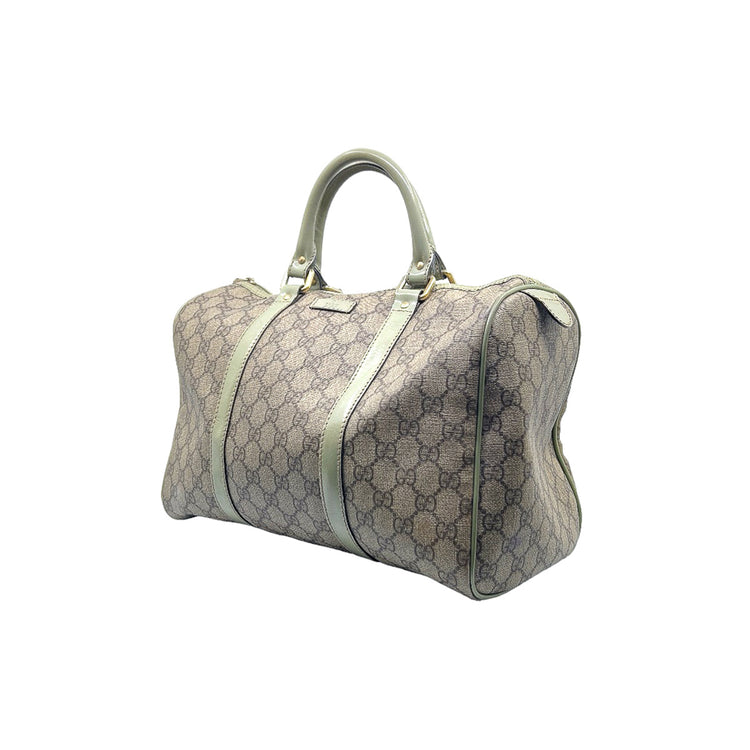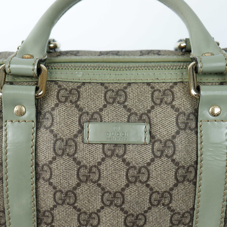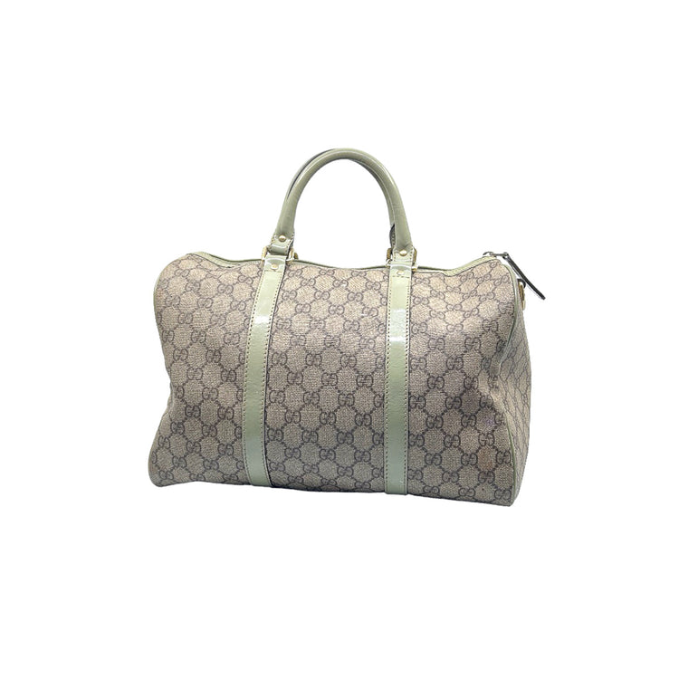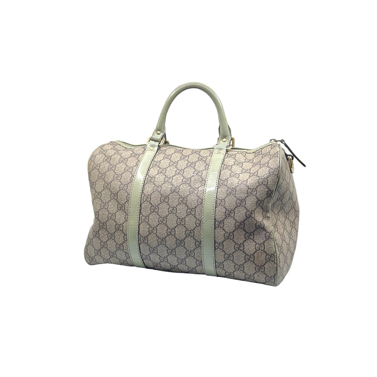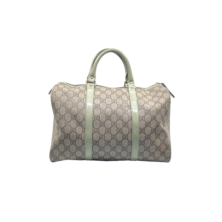 Bolso Gucci de la colección Joy Boston, confeccionado en lona GG, con detalles y asas en piel color verde claro, detalles de desgaste por uso.
