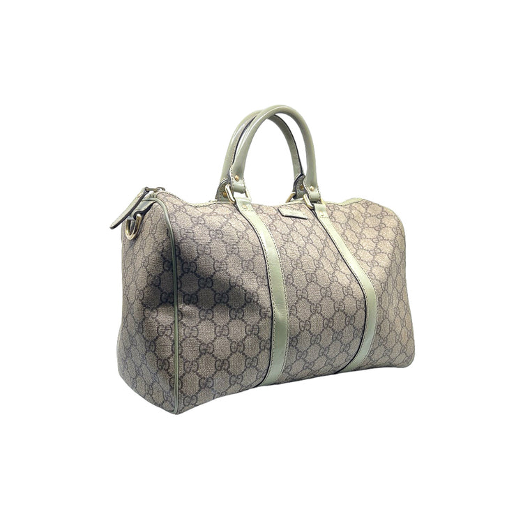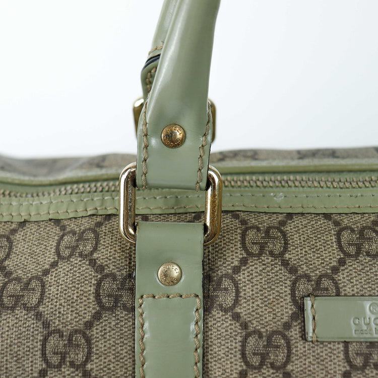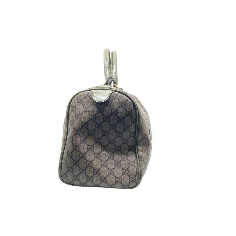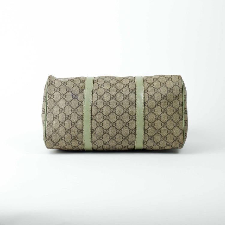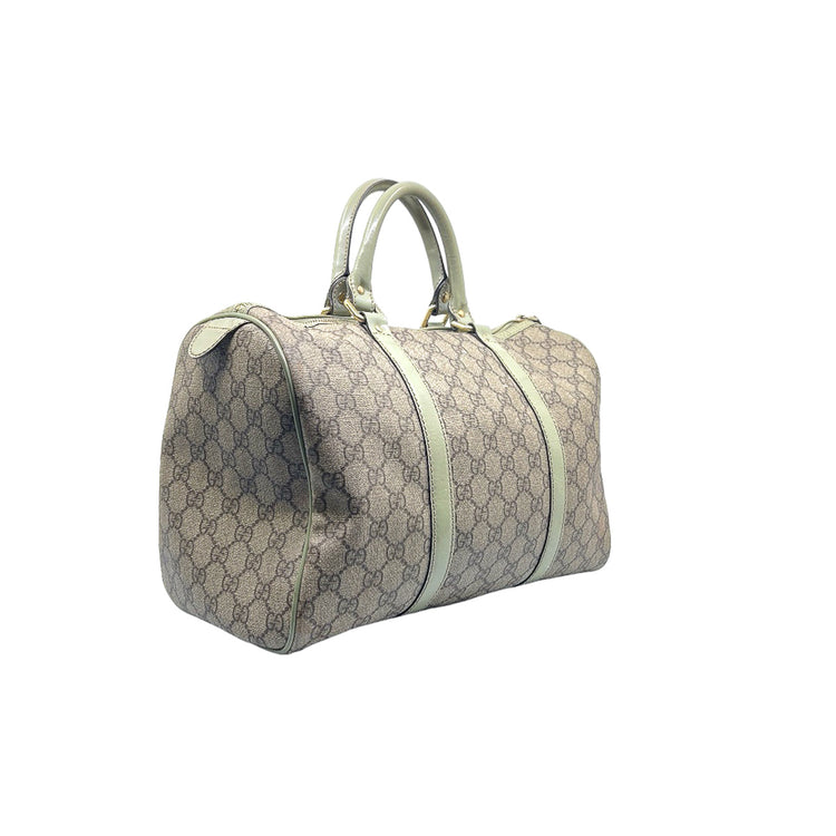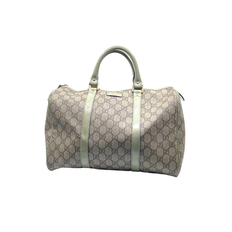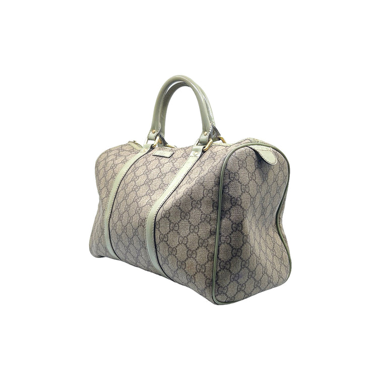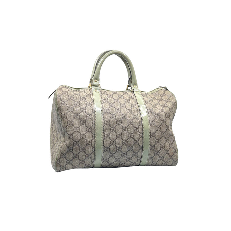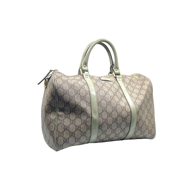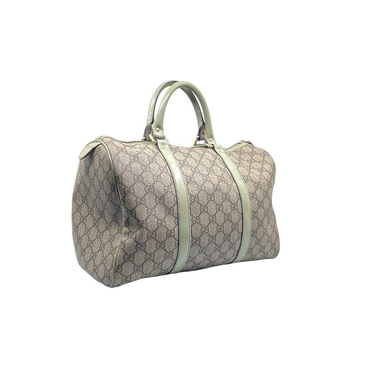 Bolso Gucci de la colección Joy Boston, confeccionado en lona GG, con detalles y asas en piel color verde claro, detalles de desgaste por uso.