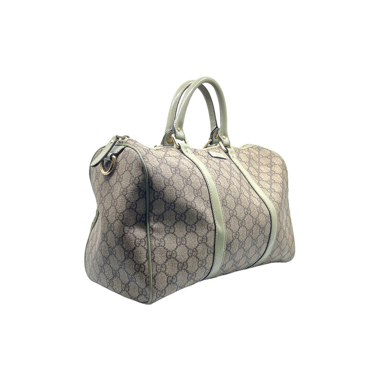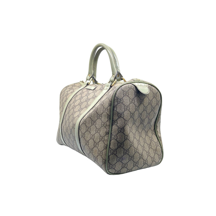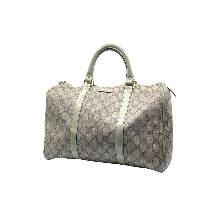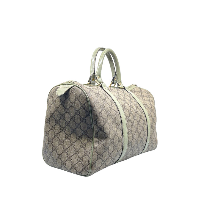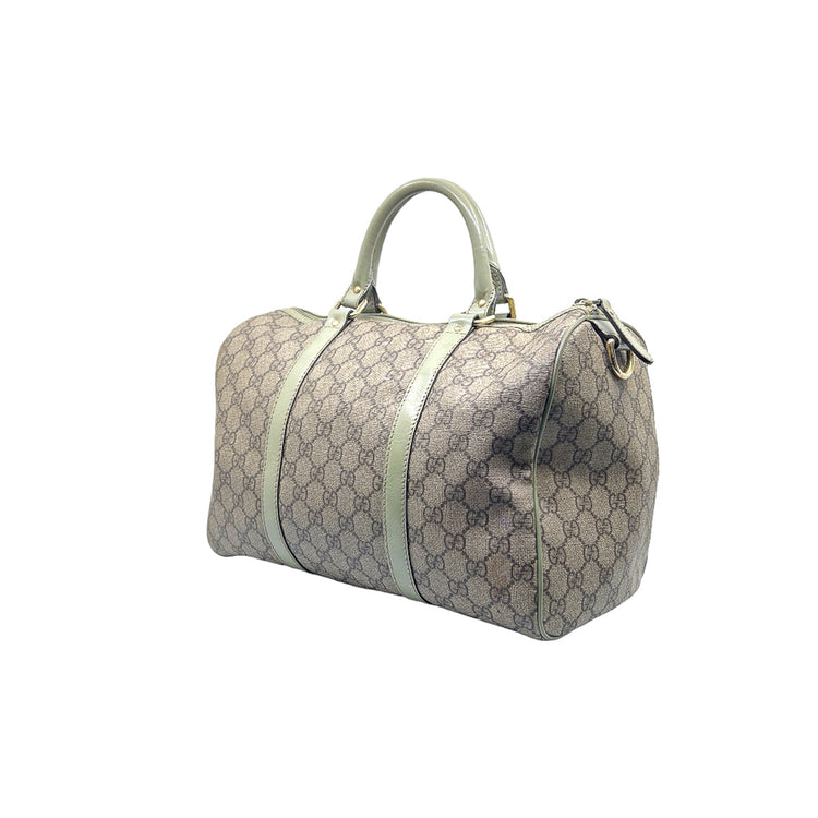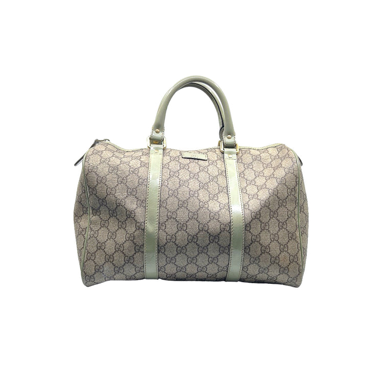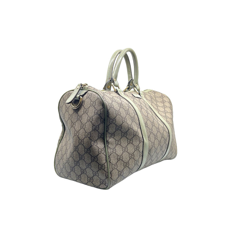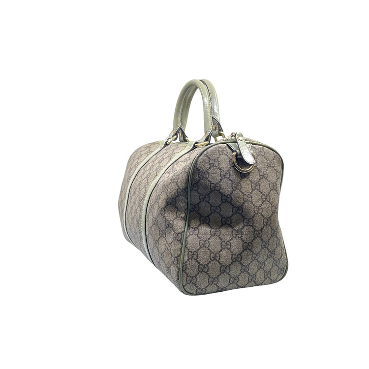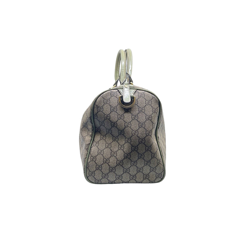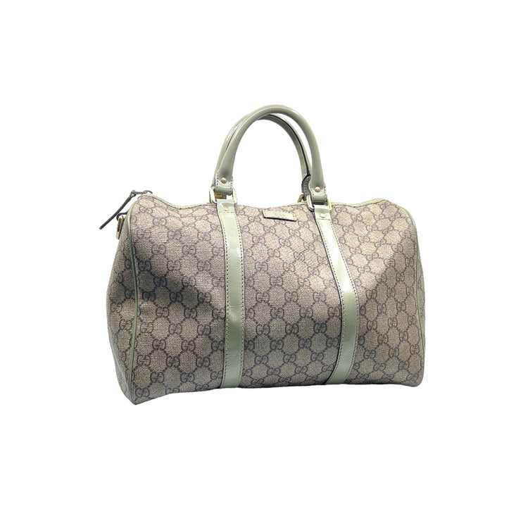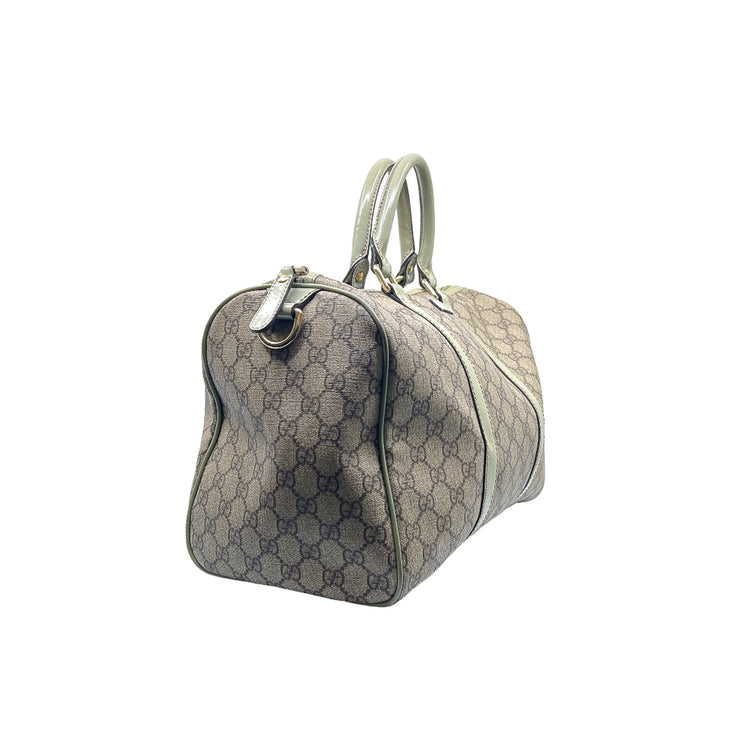 Bolso Gucci de la colección Joy Boston, confeccionado en lona GG, con detalles y asas en piel color verde claro, detalles de desgaste por uso.