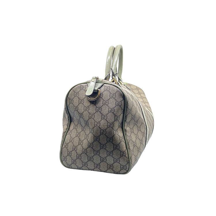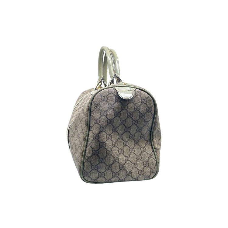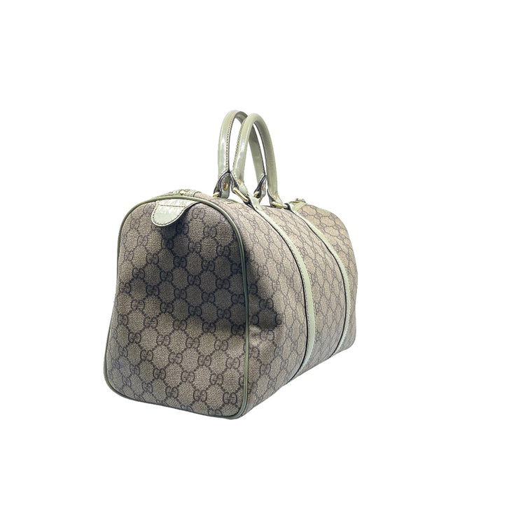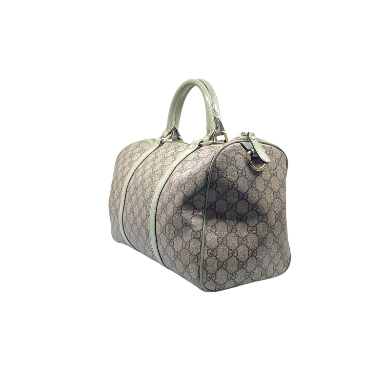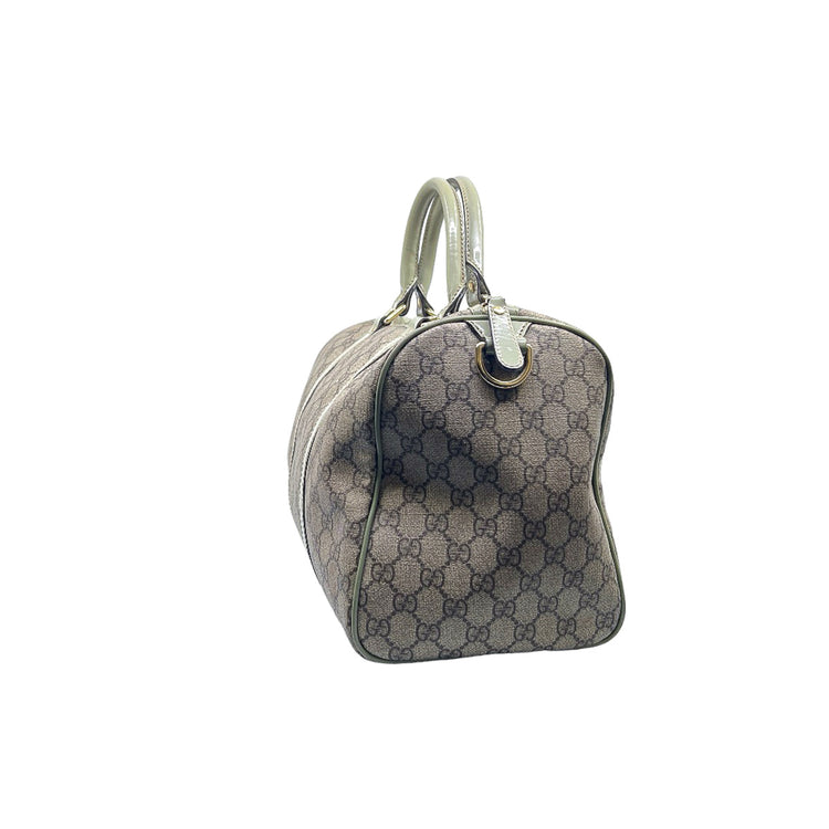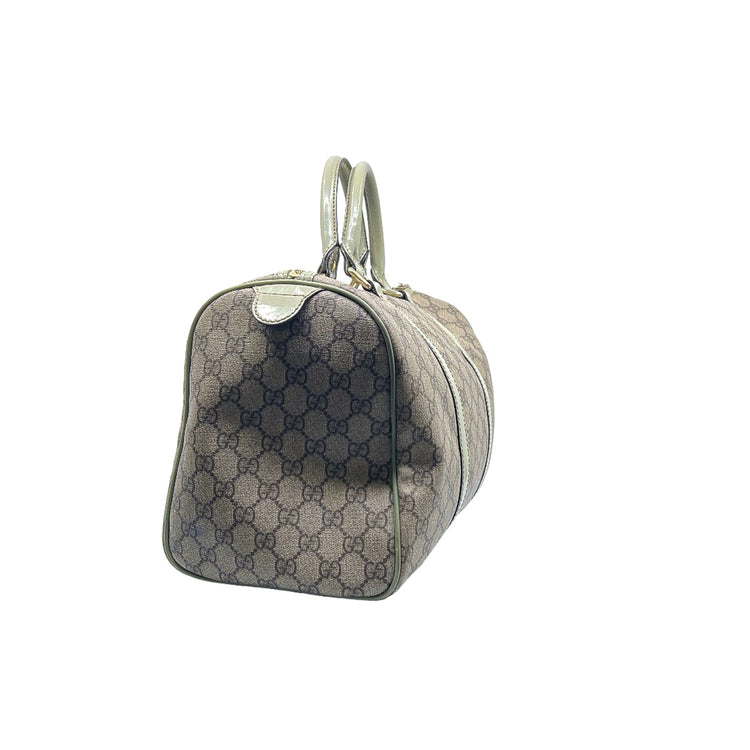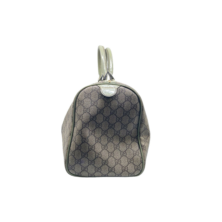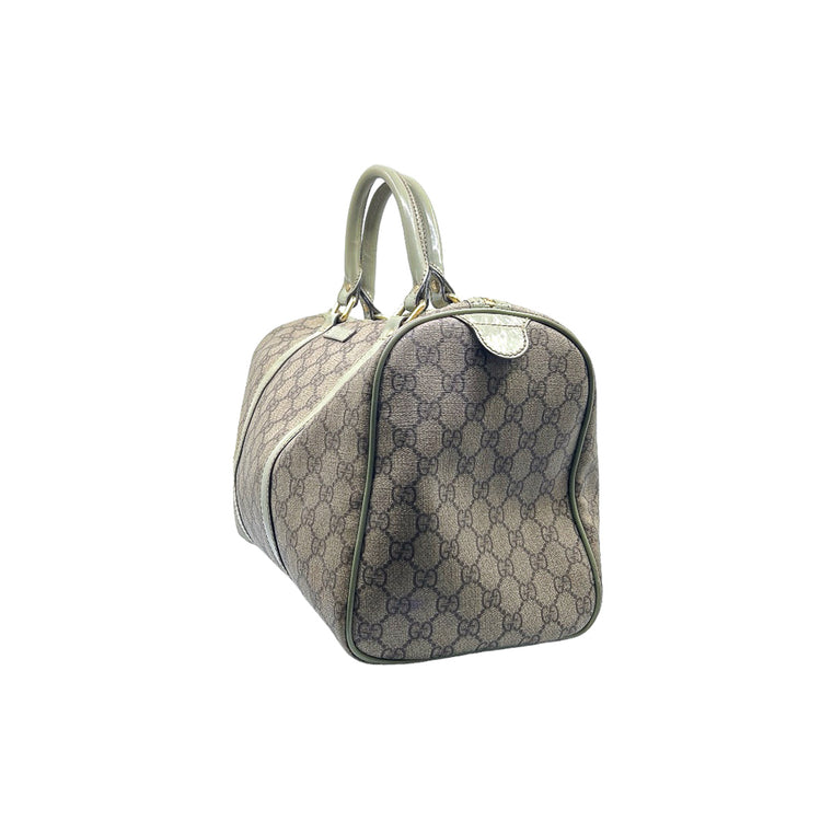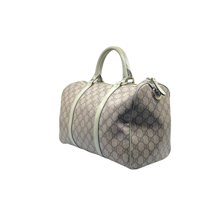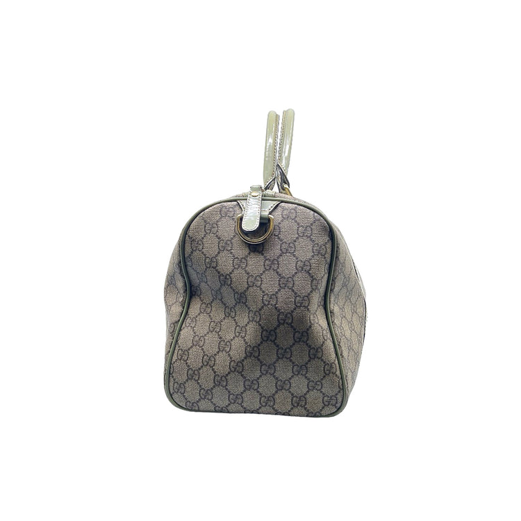 Bolso Gucci de la colección Joy Boston, confeccionado en lona GG, con detalles y asas en piel color verde claro, detalles de desgaste por uso.