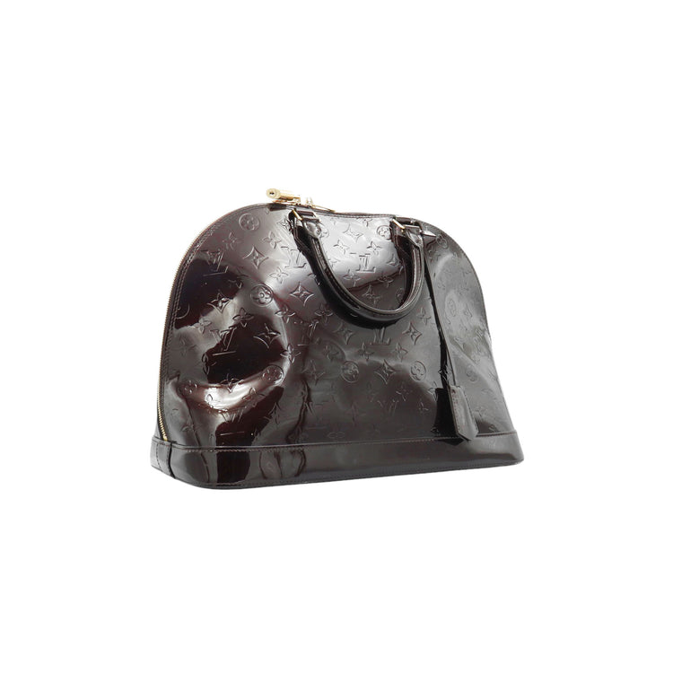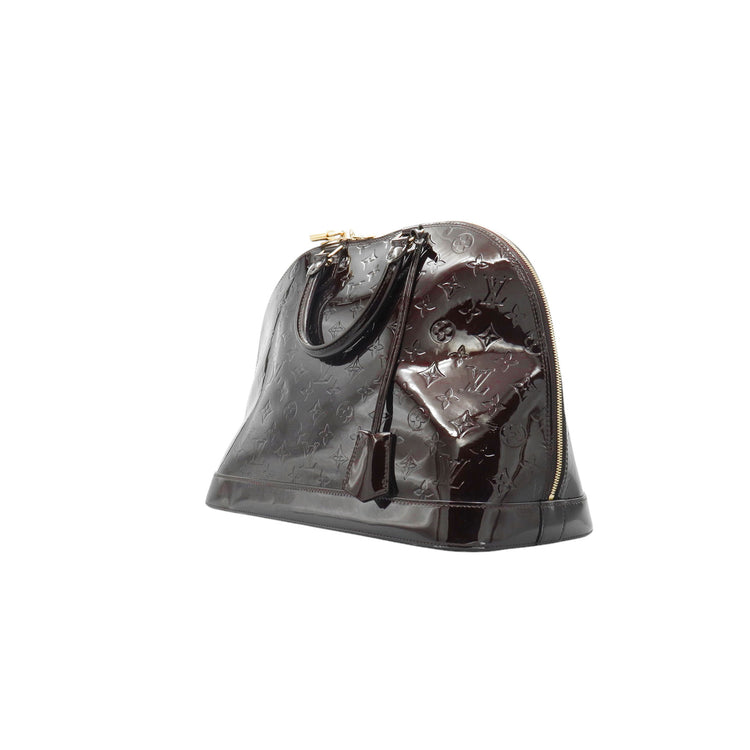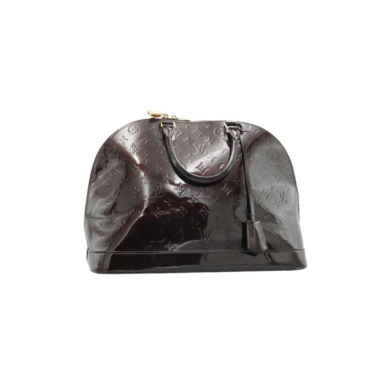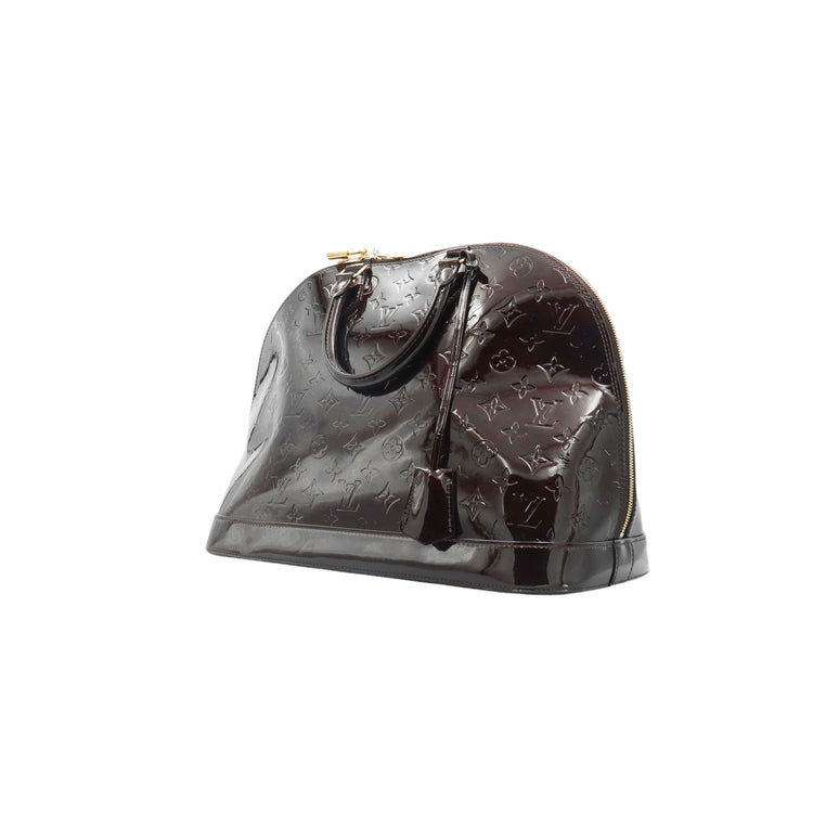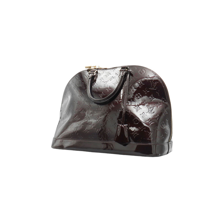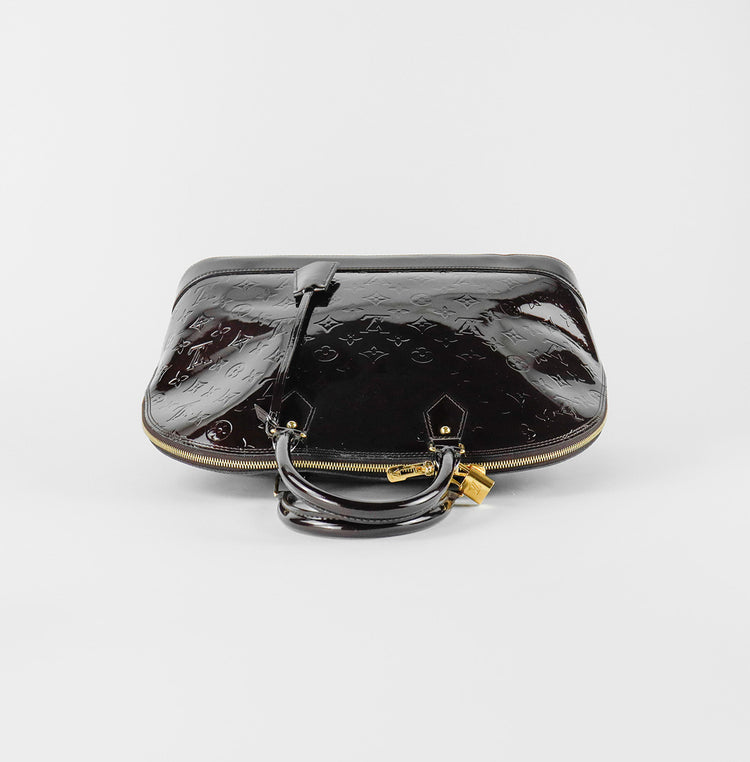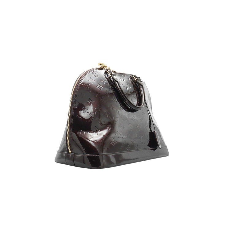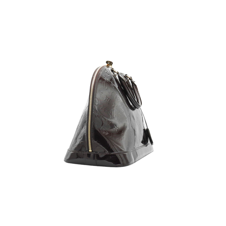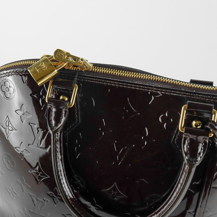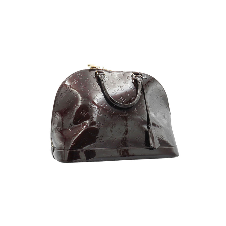 Bolso Louis Vuitton modelo Alma, confeccionado en piel vernis amarante, con el monograma de la marca, interior en tela del mismo tono, con 2 asas rígidas, con par de llaves y candado, cremallera y herrajes en color dorado.
