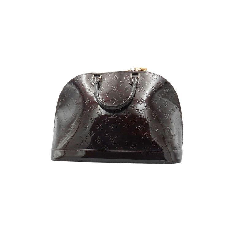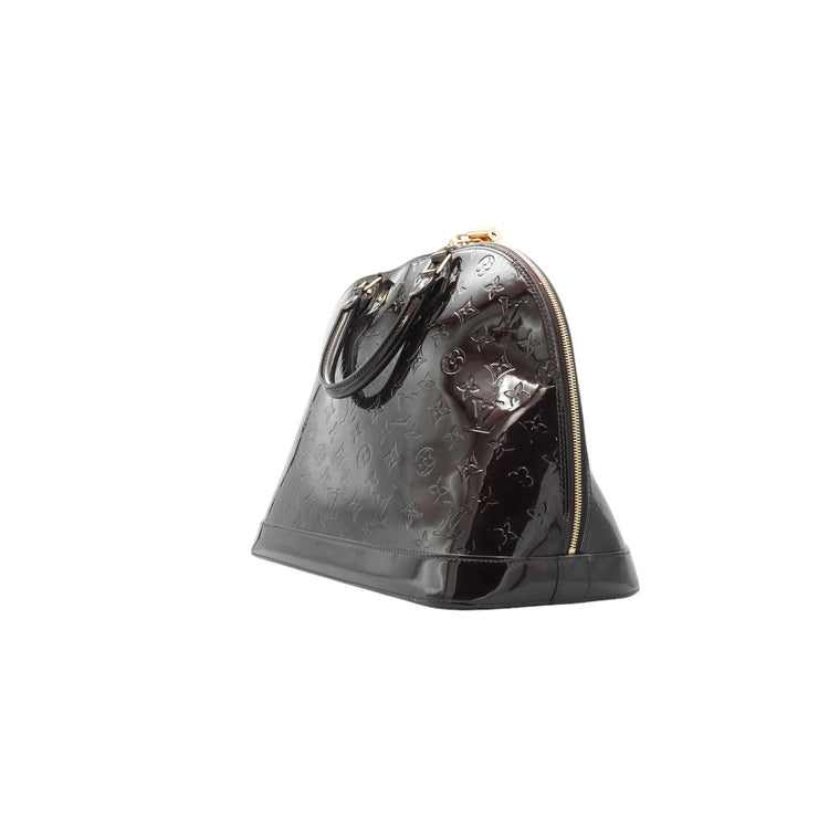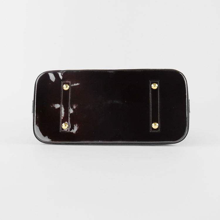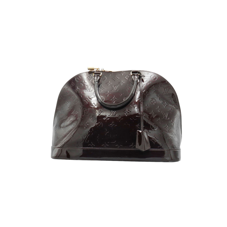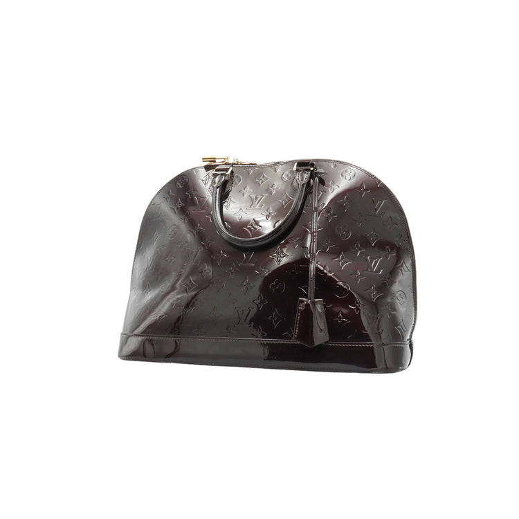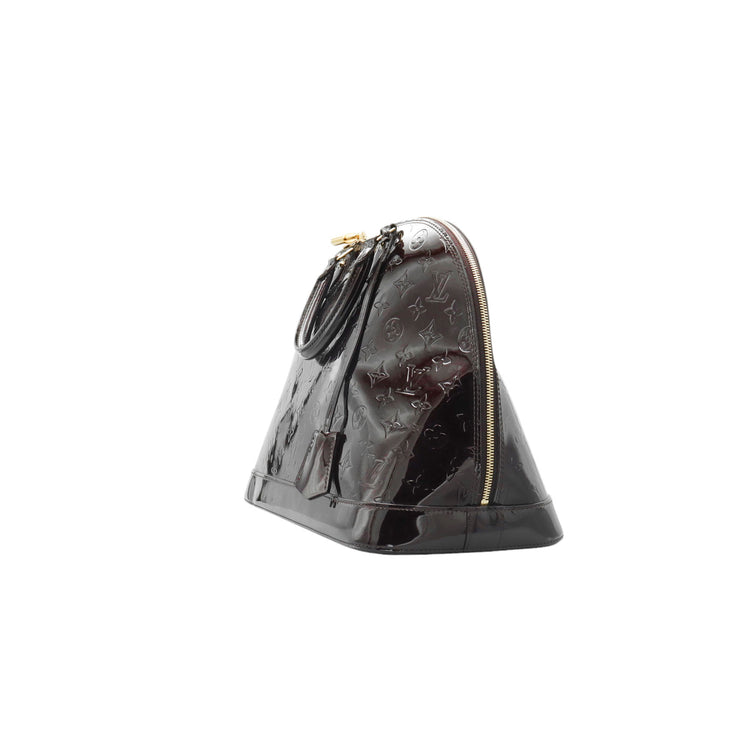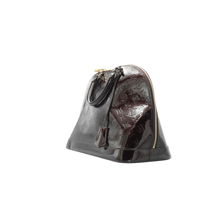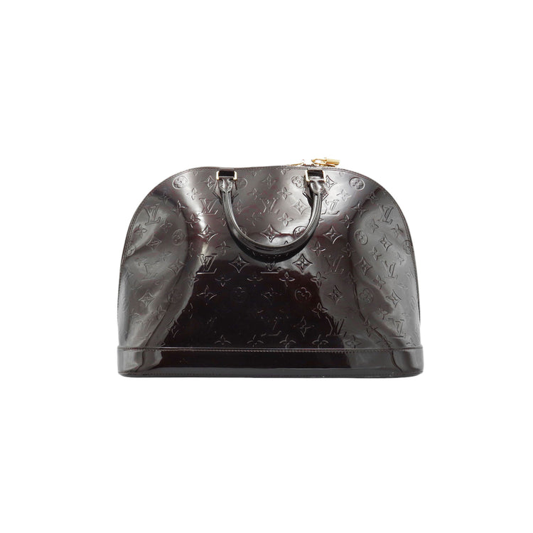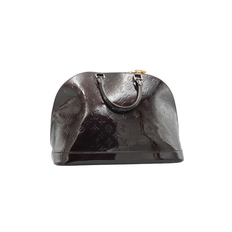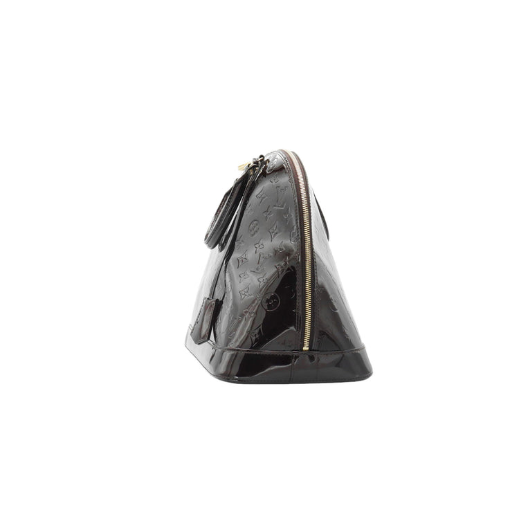 Bolso Louis Vuitton modelo Alma, confeccionado en piel vernis amarante, con el monograma de la marca, interior en tela del mismo tono, con 2 asas rígidas, con par de llaves y candado, cremallera y herrajes en color dorado.