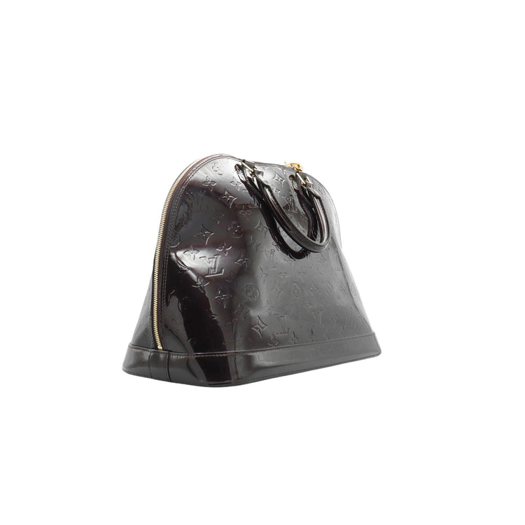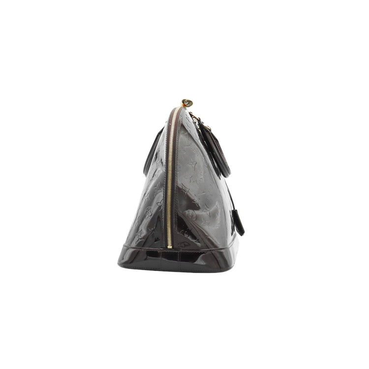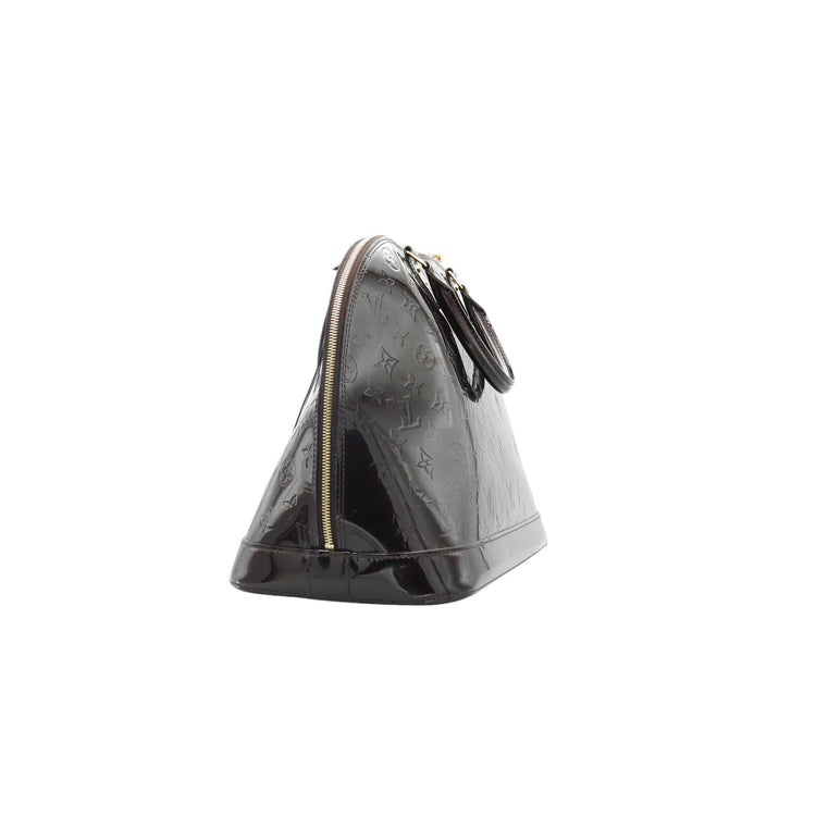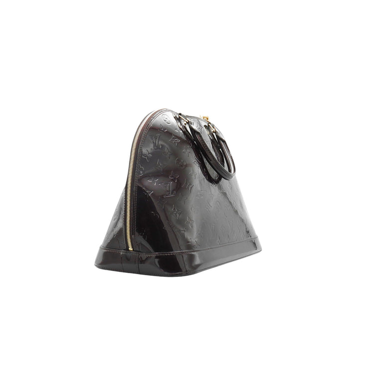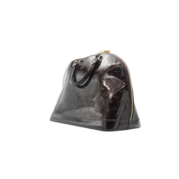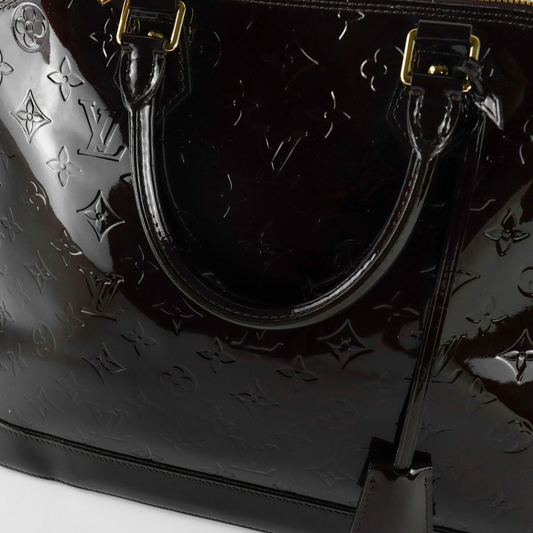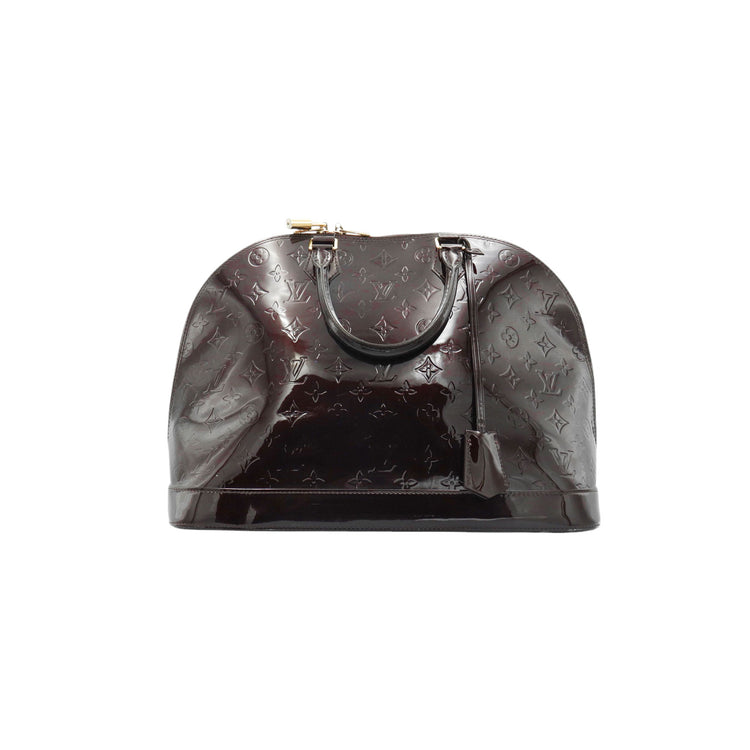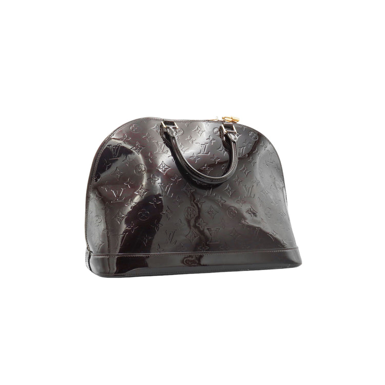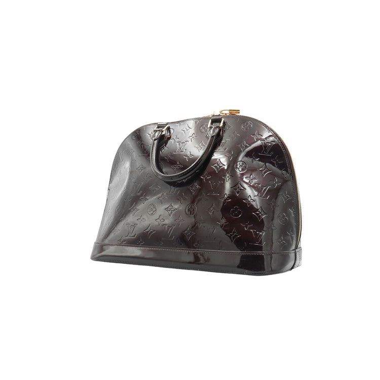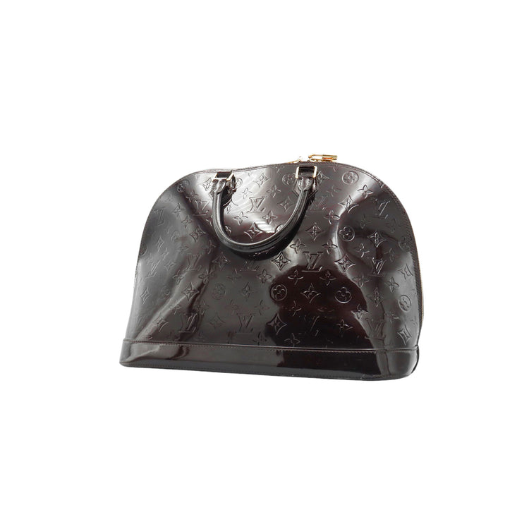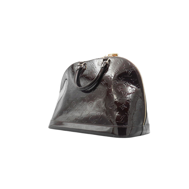 Bolso Louis Vuitton modelo Alma, confeccionado en piel vernis amarante, con el monograma de la marca, interior en tela del mismo tono, con 2 asas rígidas, con par de llaves y candado, cremallera y herrajes en color dorado.