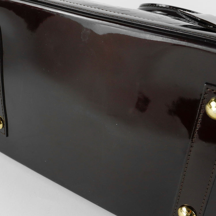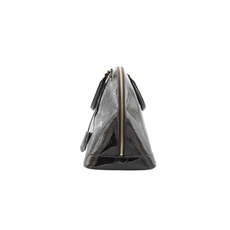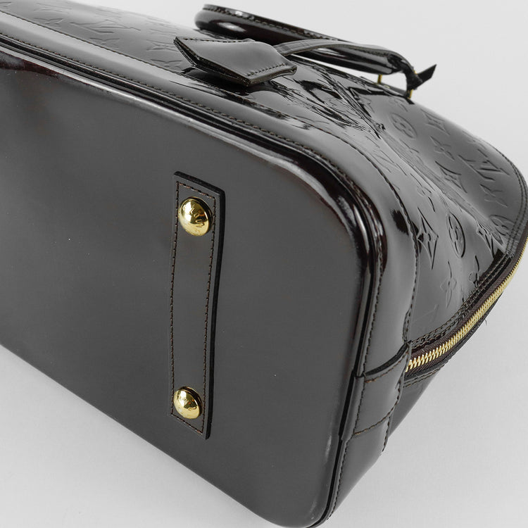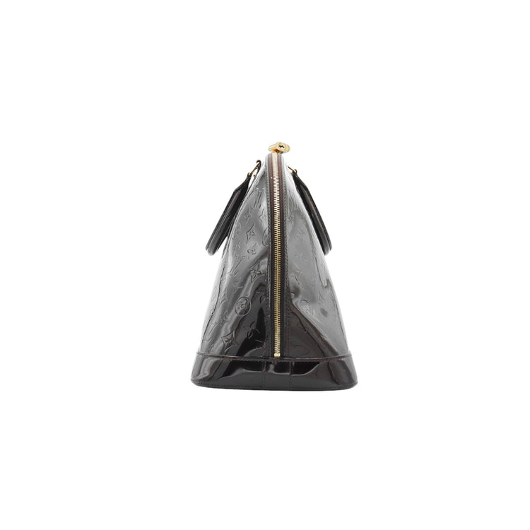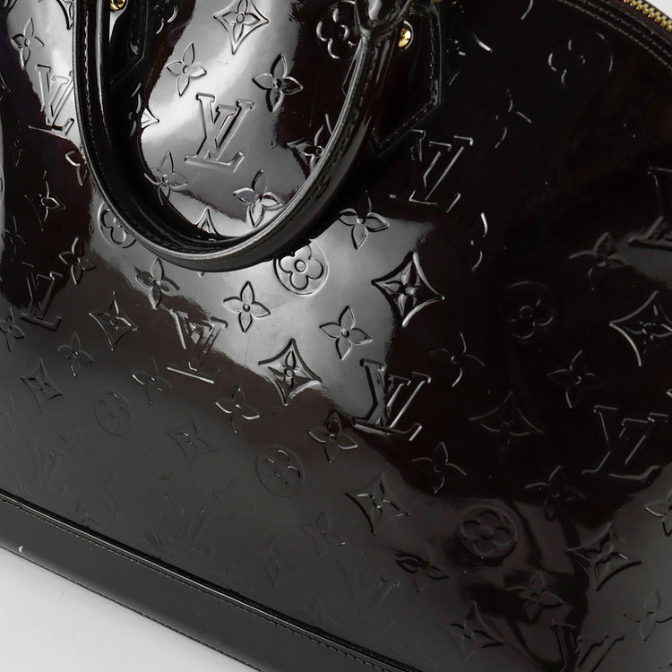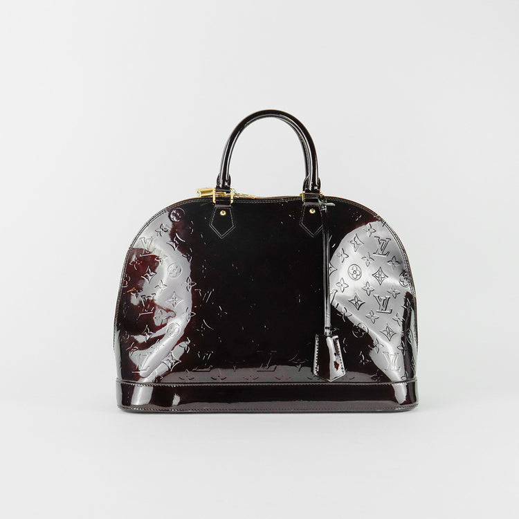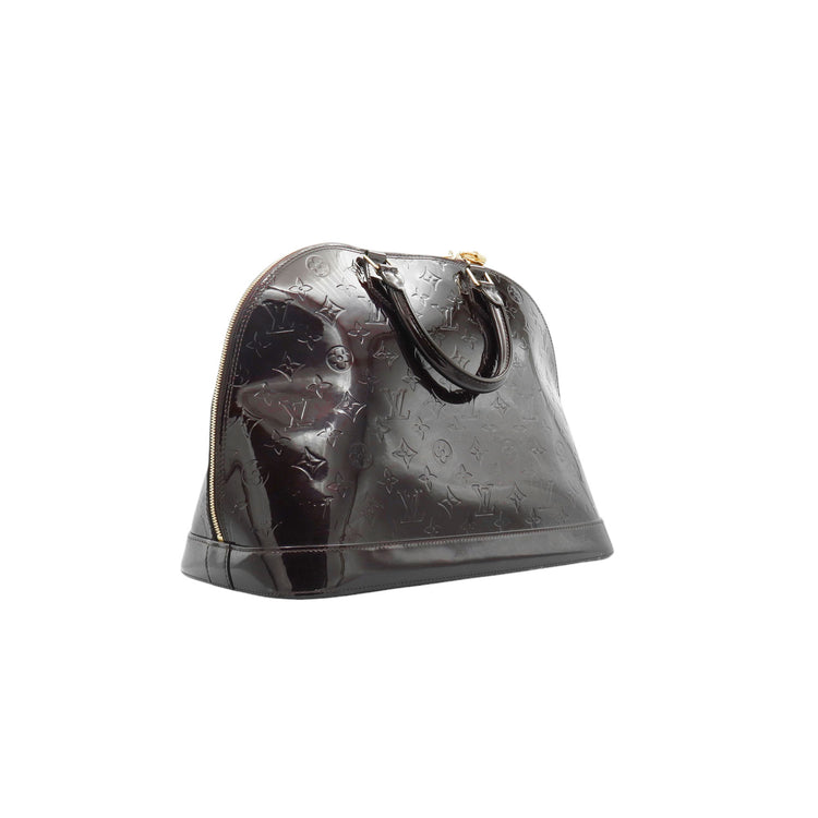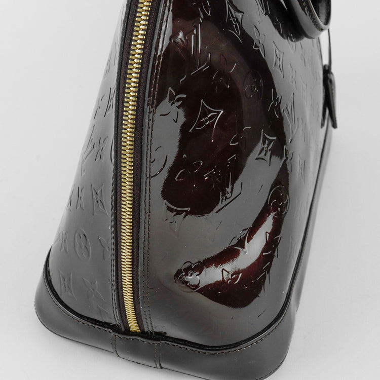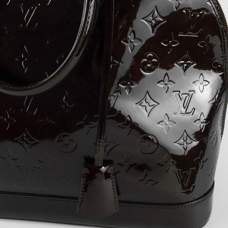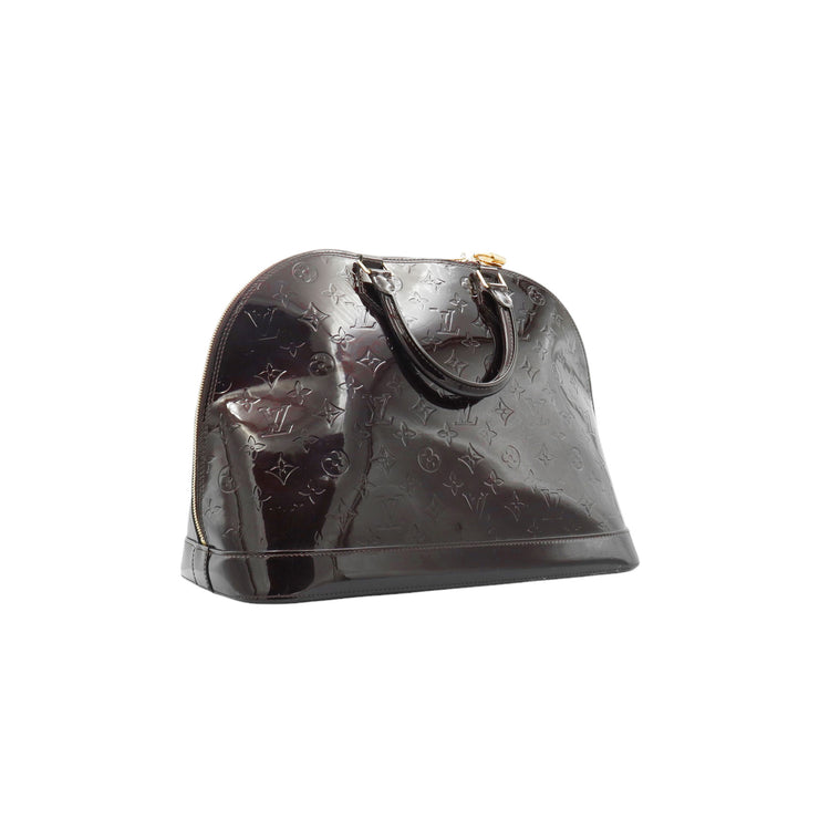 Bolso Louis Vuitton modelo Alma, confeccionado en piel vernis amarante, con el monograma de la marca, interior en tela del mismo tono, con 2 asas rígidas, con par de llaves y candado, cremallera y herrajes en color dorado.