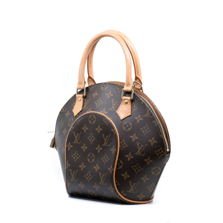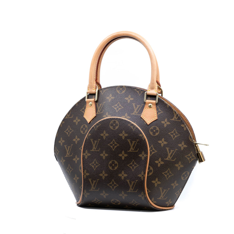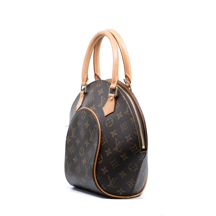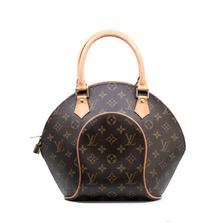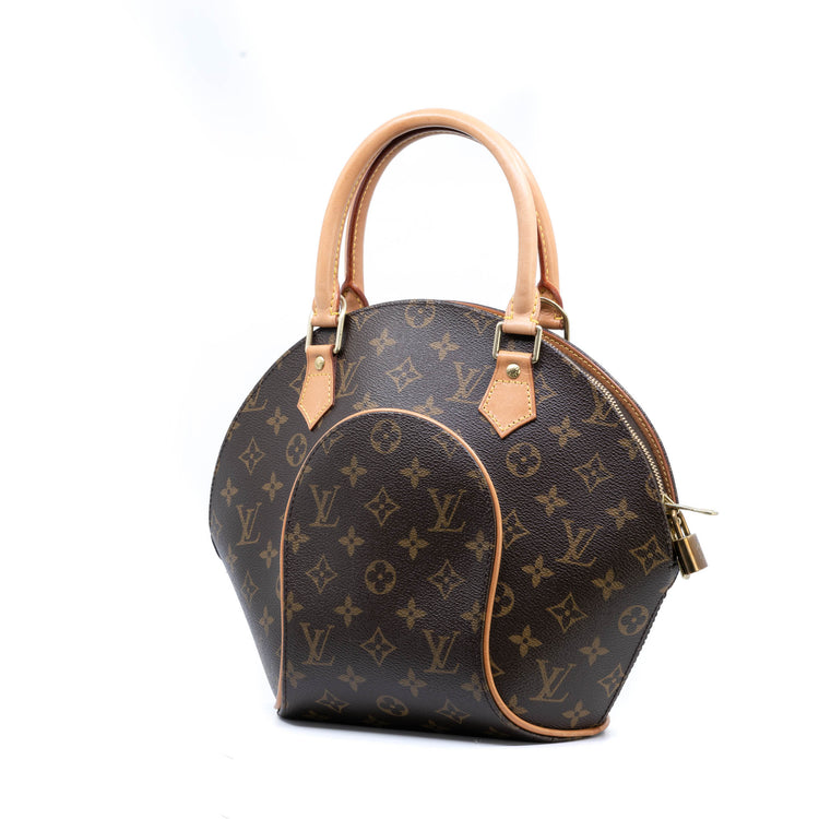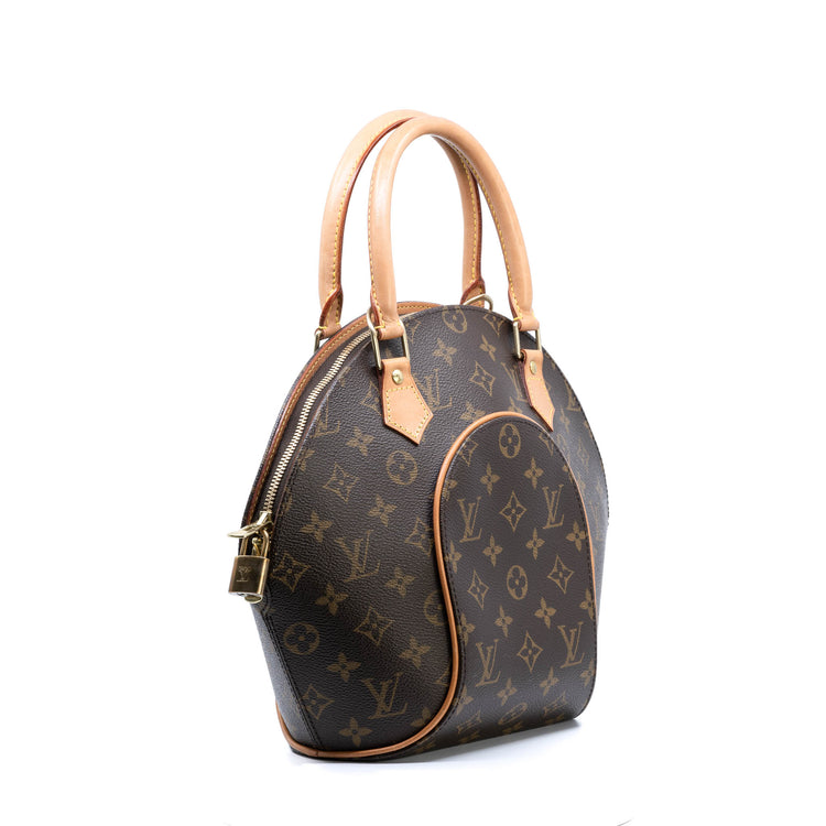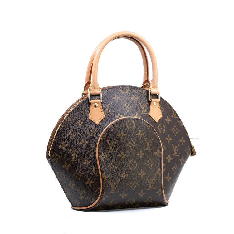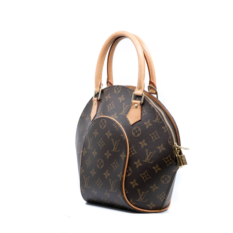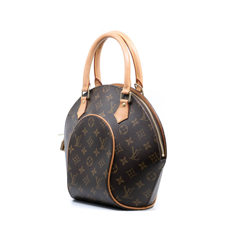 Bolso Louis Vuitton modelo Ellipse, confeccionado en lona clásica monogram, con herrajes en metal dorado, asas y ribetes en cuero natural, cierre de cremallera y bolsillo liso interno, no incluye candado ni llave.