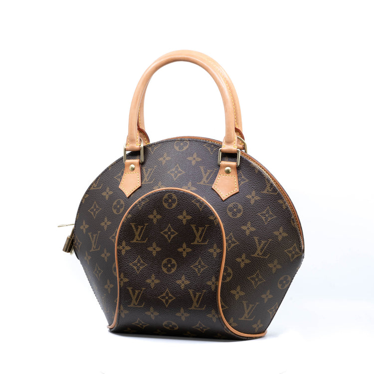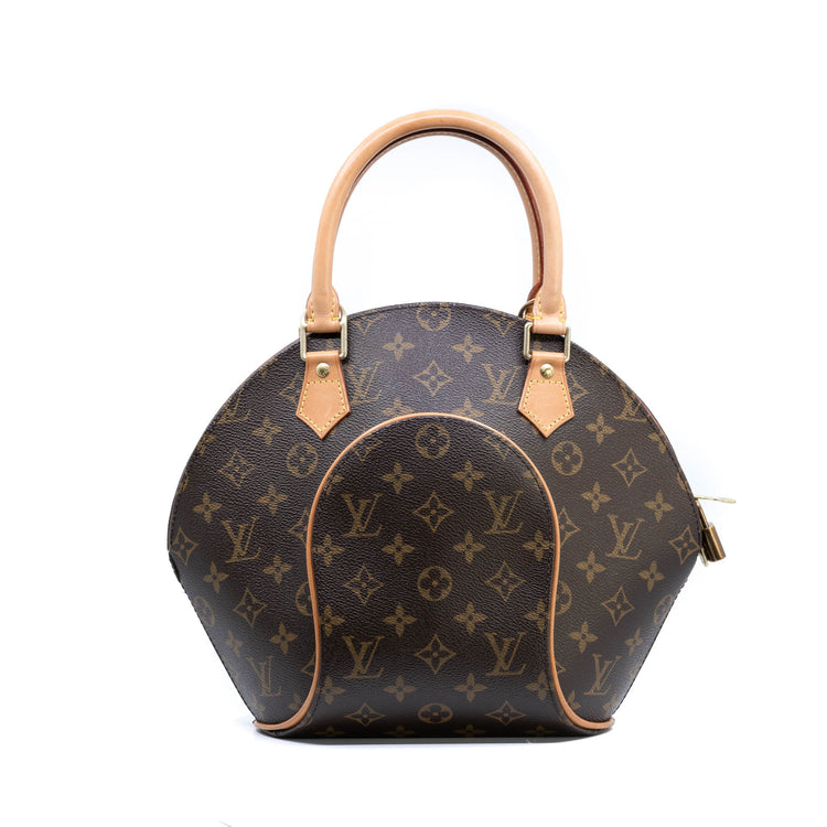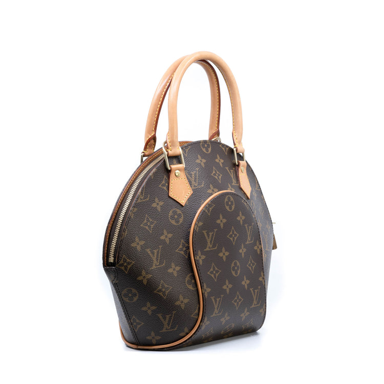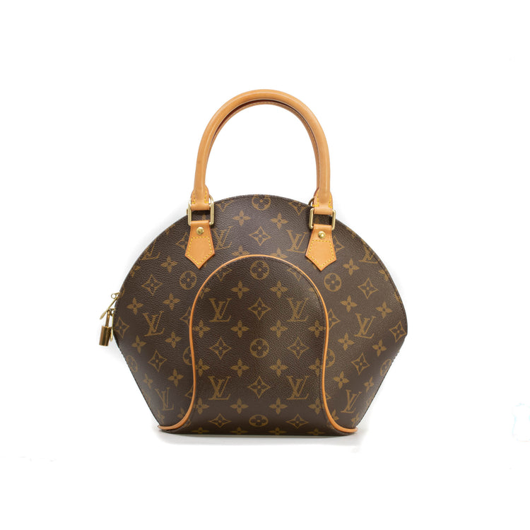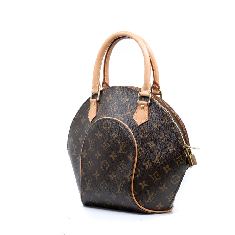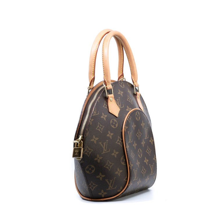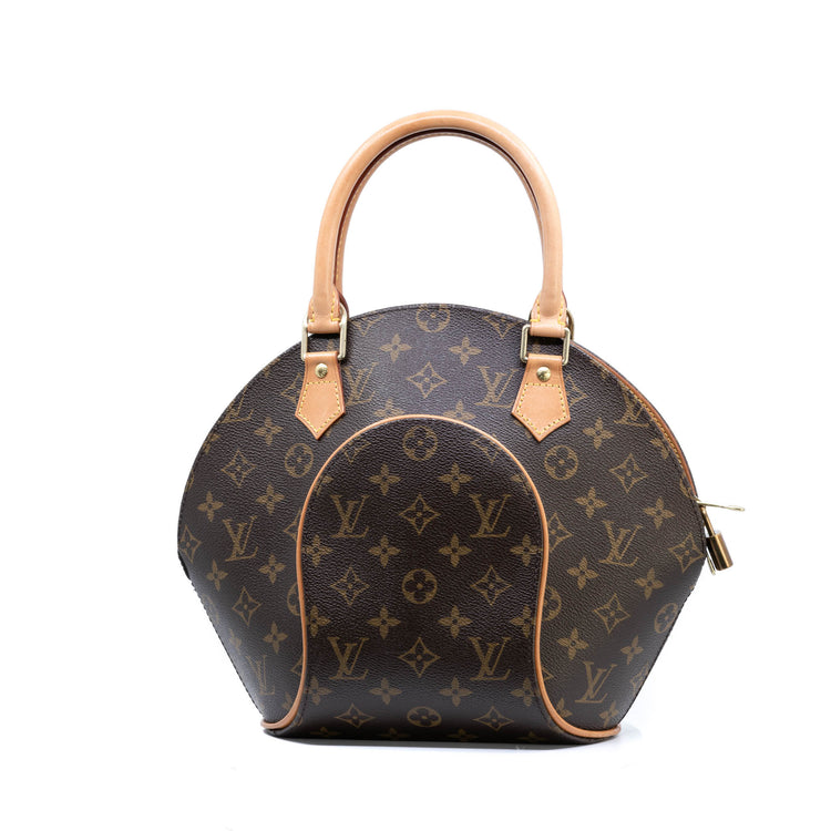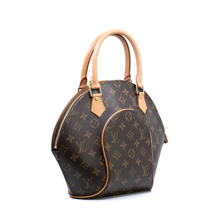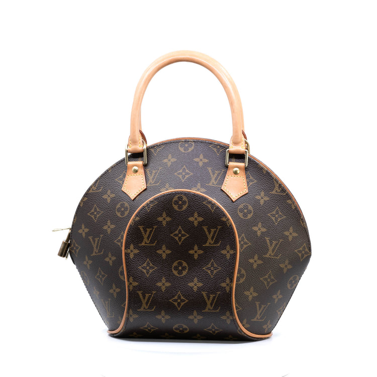 Bolso Louis Vuitton modelo Ellipse, confeccionado en lona clásica monogram, con herrajes en metal dorado, asas y ribetes en cuero natural, cierre de cremallera y bolsillo liso interno, no incluye candado ni llave.