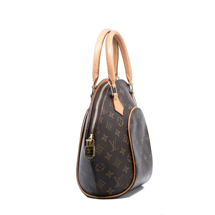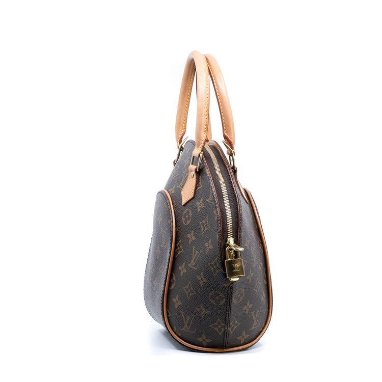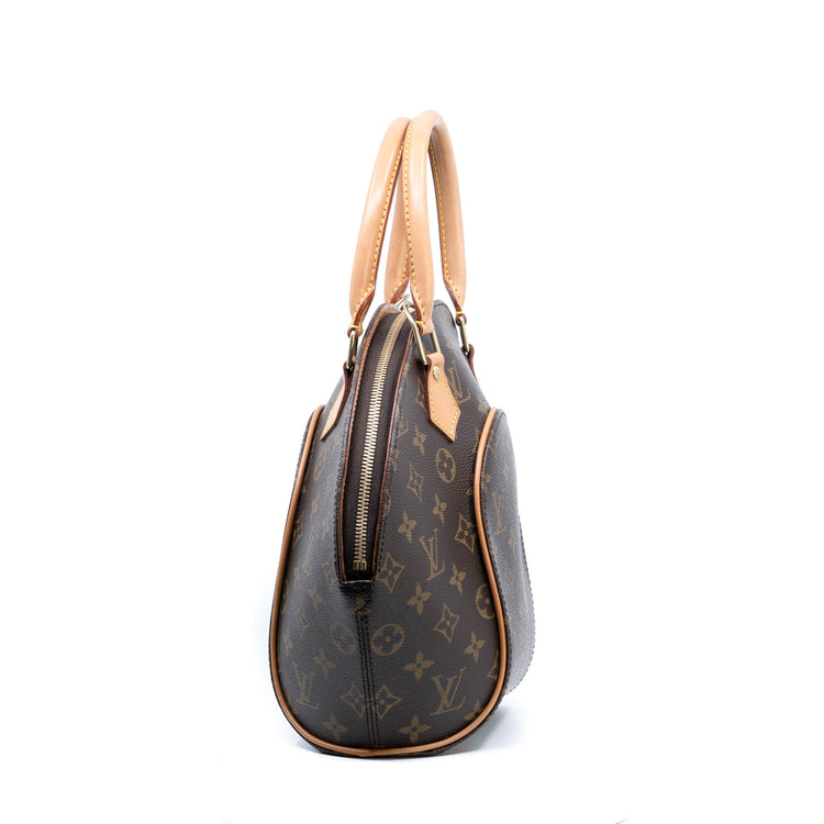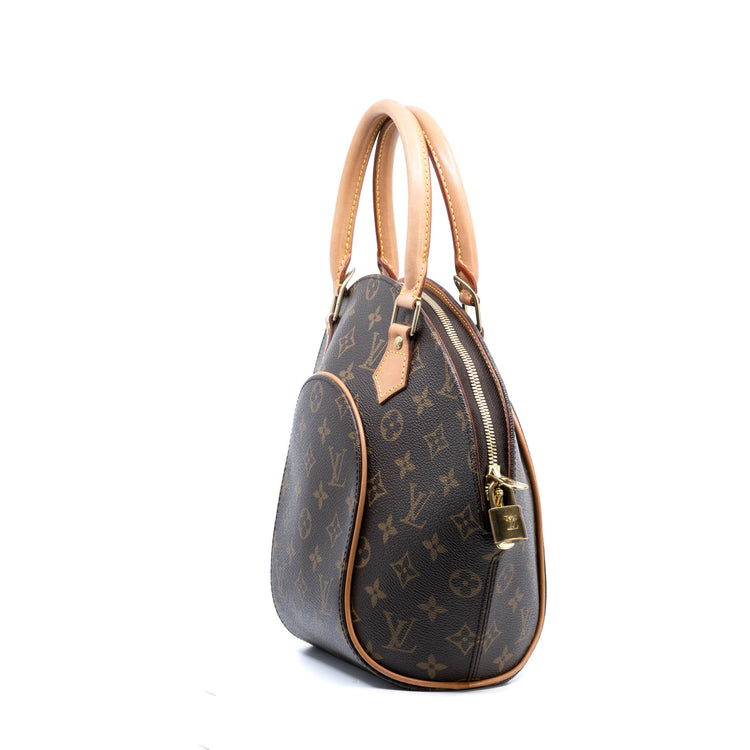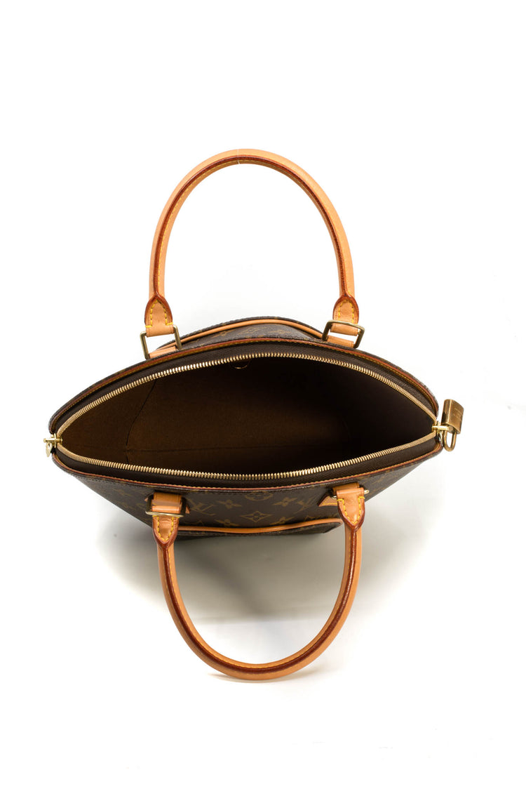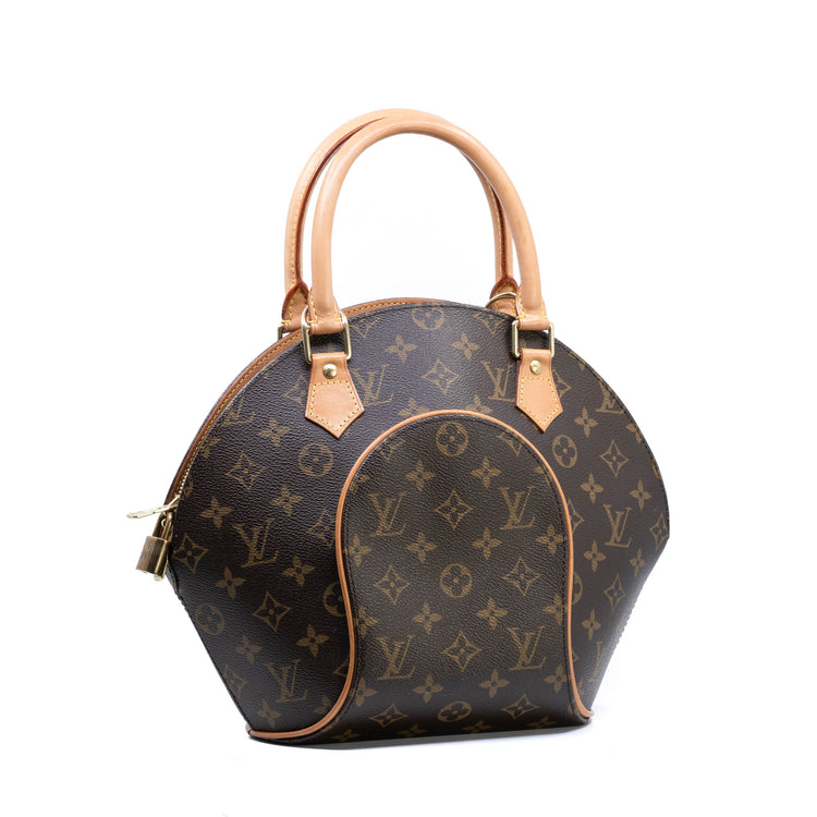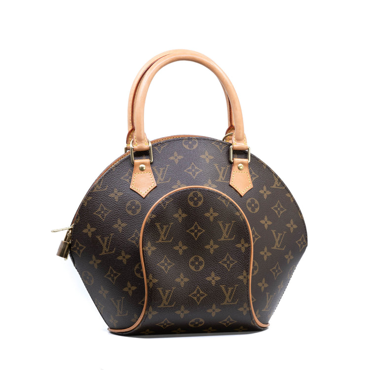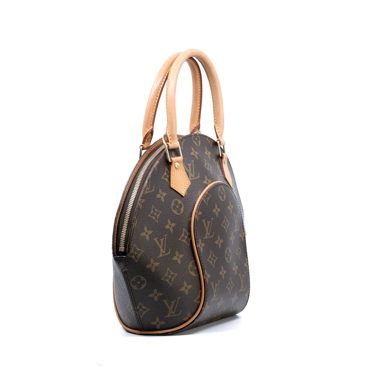 Bolso Louis Vuitton modelo Ellipse, confeccionado en lona clásica monogram, con herrajes en metal dorado, asas y ribetes en cuero natural, cierre de cremallera y bolsillo liso interno, no incluye candado ni llave.