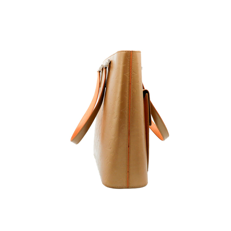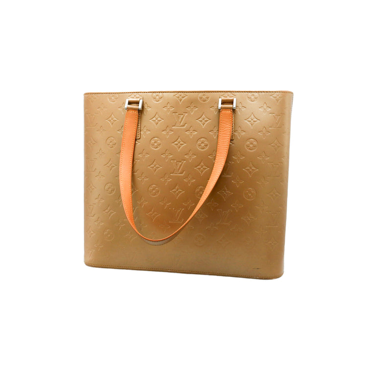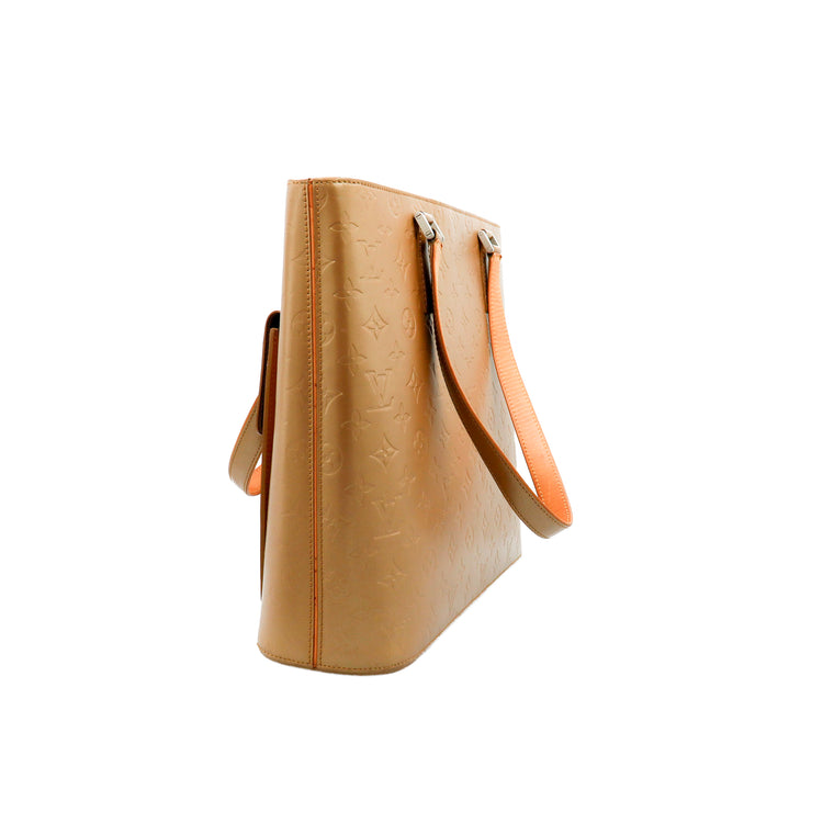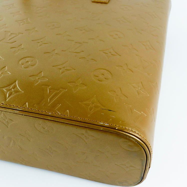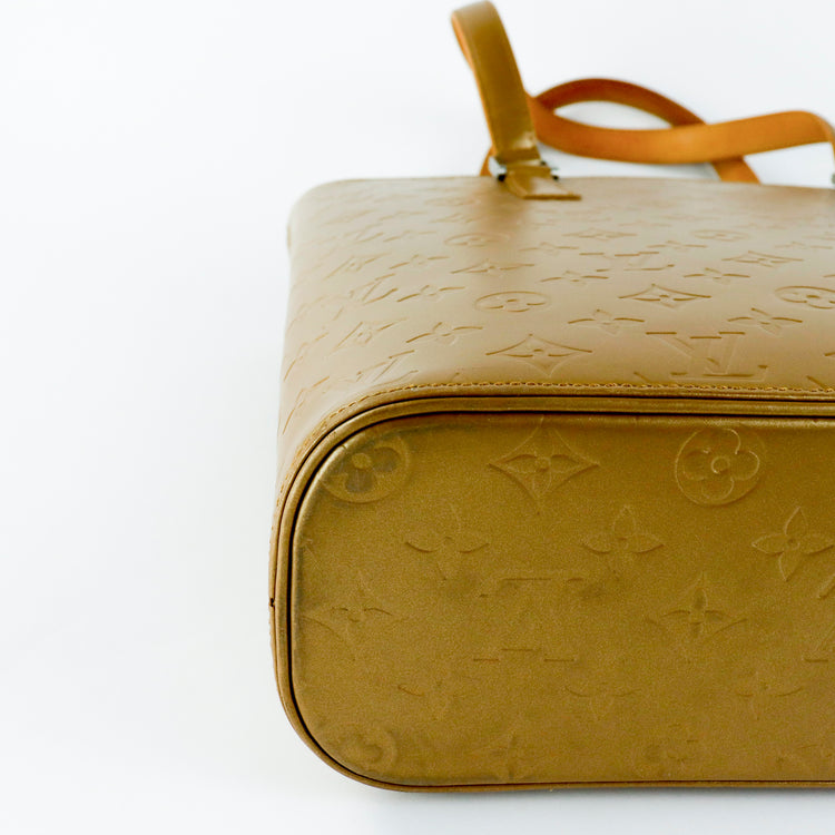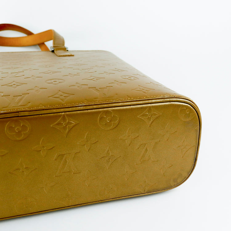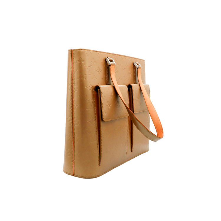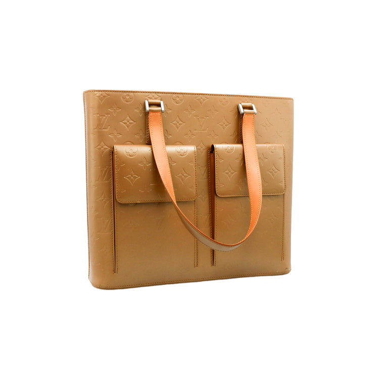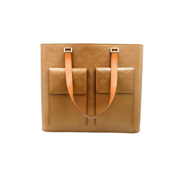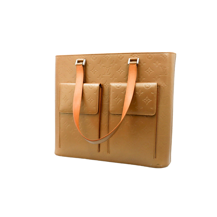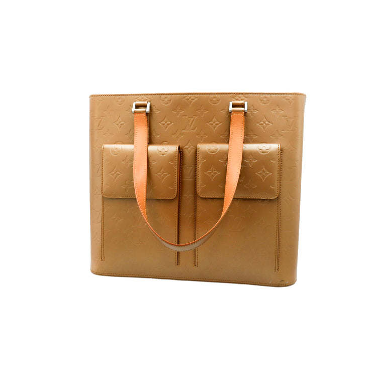 Bolso marca Louis Vuitton de la línea Mat Wilwood en piel vernis color dorado con monograma en acabado mate, forro interno en textil café, cuenta con 2 bolsillos externos con solapa, asas de cuero plana y cierres tipo cremallera.
