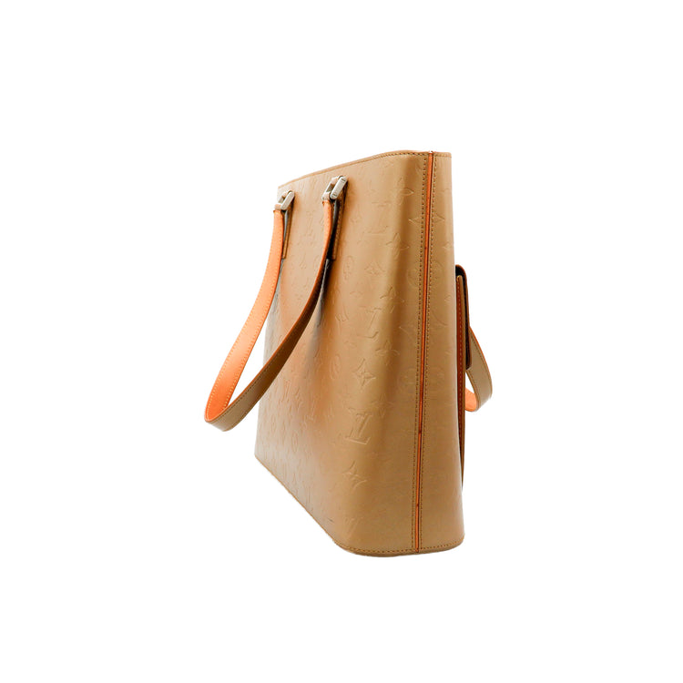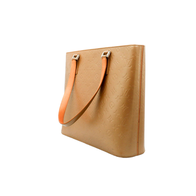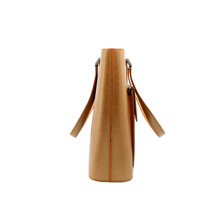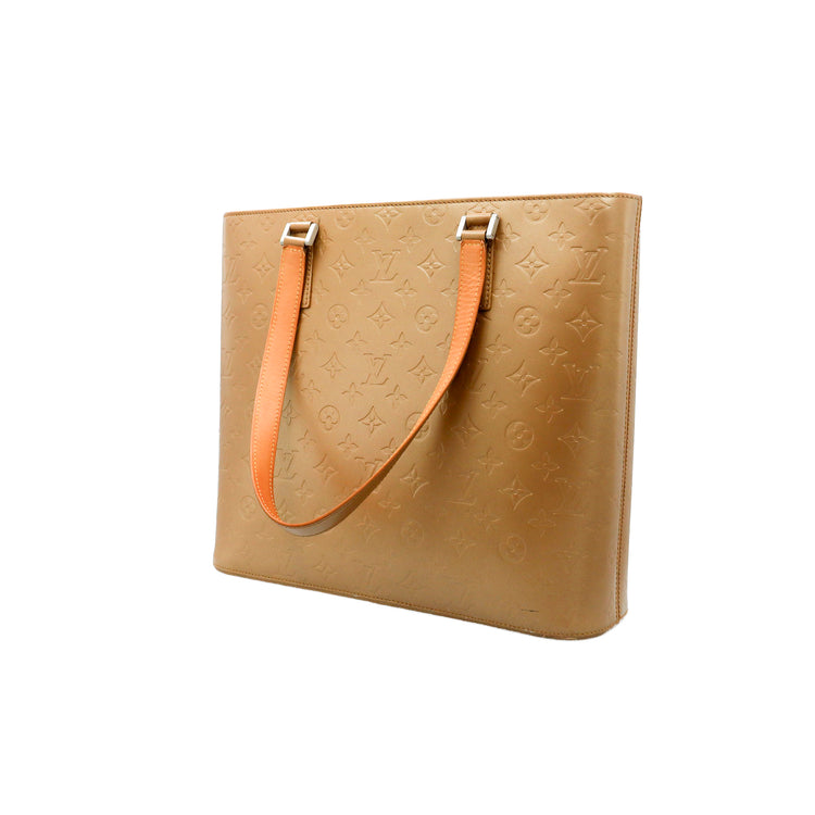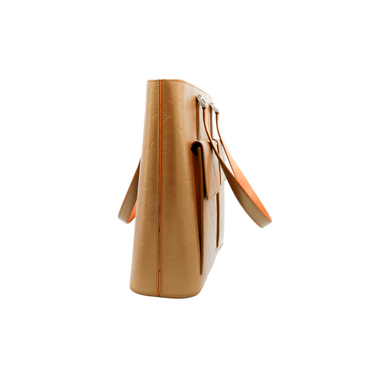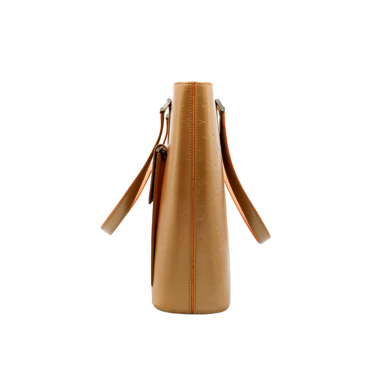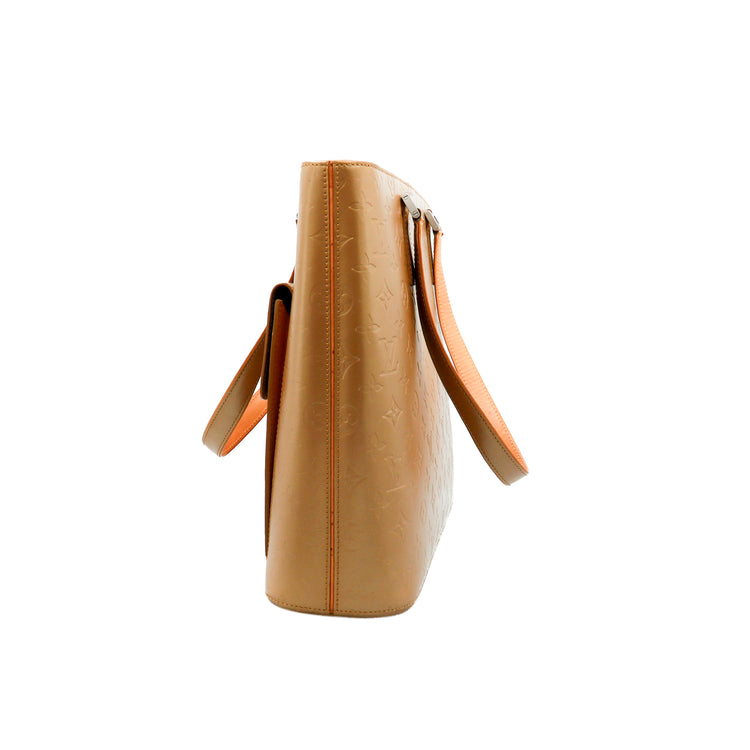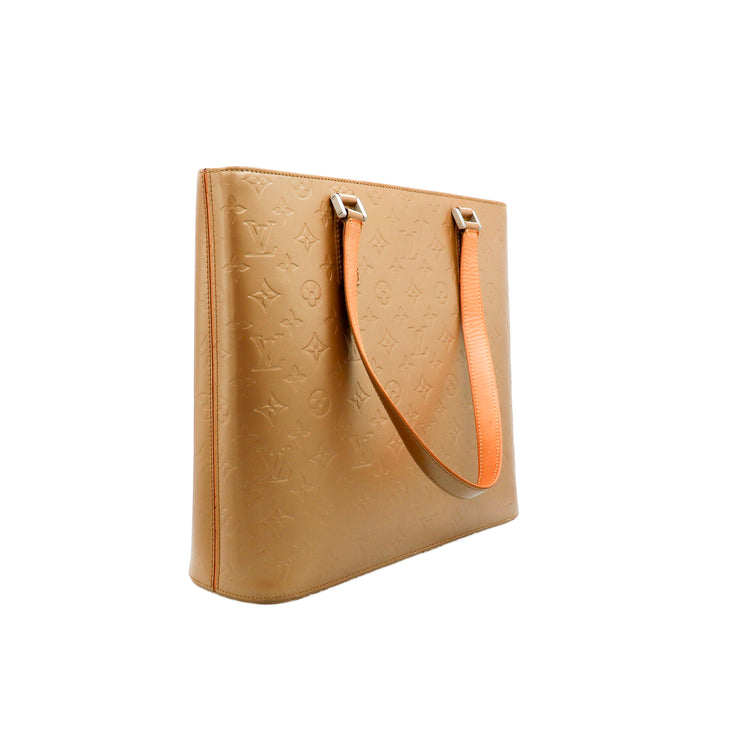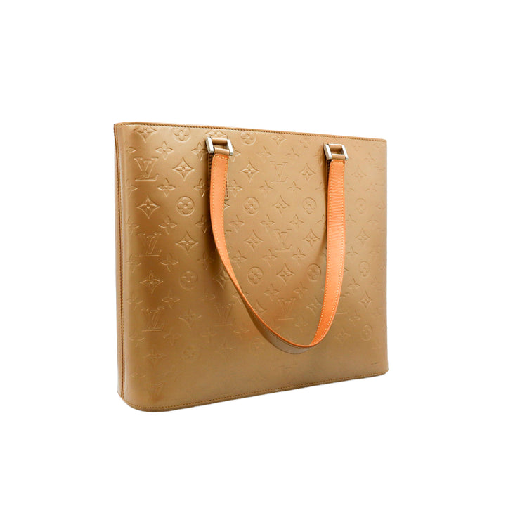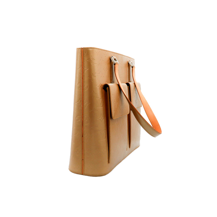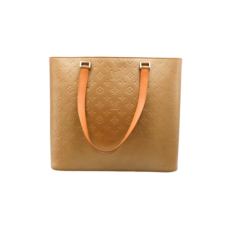 Bolso marca Louis Vuitton de la línea Mat Wilwood en piel vernis color dorado con monograma en acabado mate, forro interno en textil café, cuenta con 2 bolsillos externos con solapa, asas de cuero plana y cierres tipo cremallera.