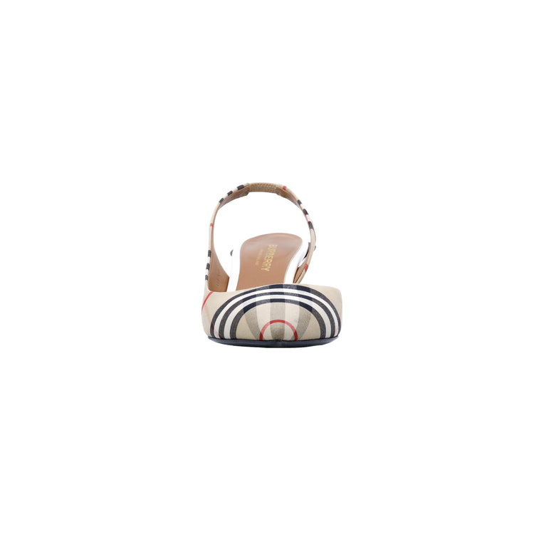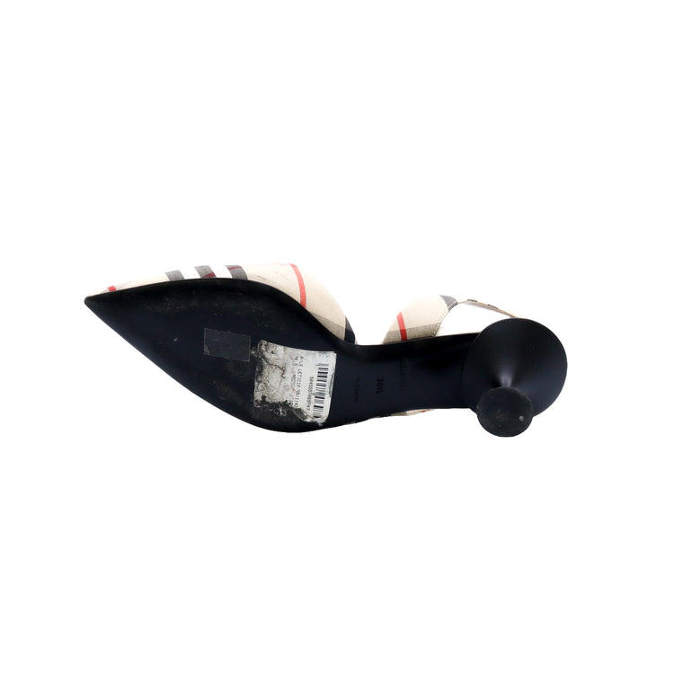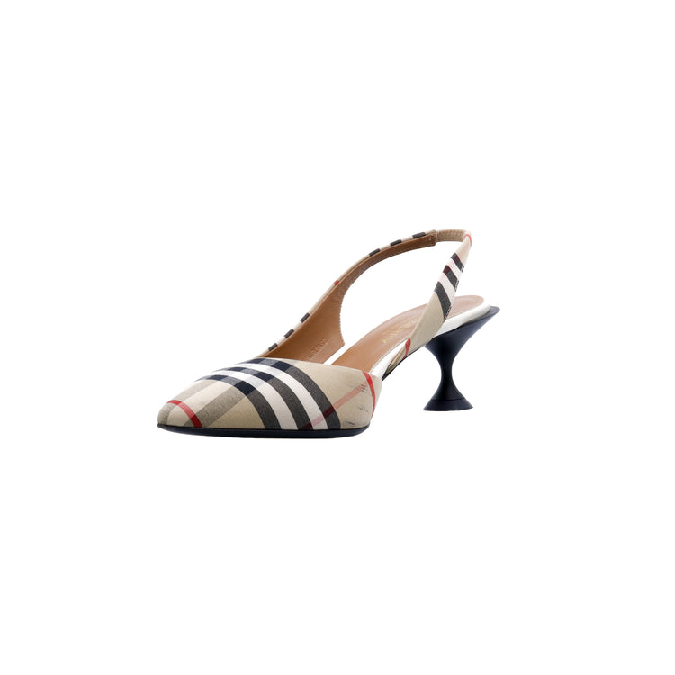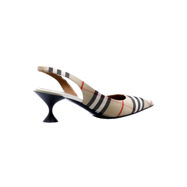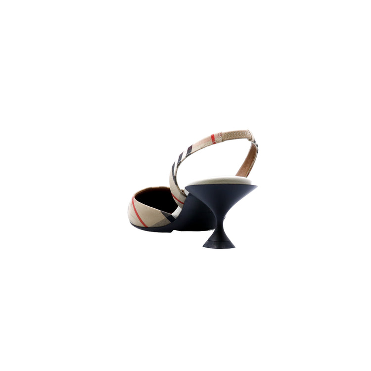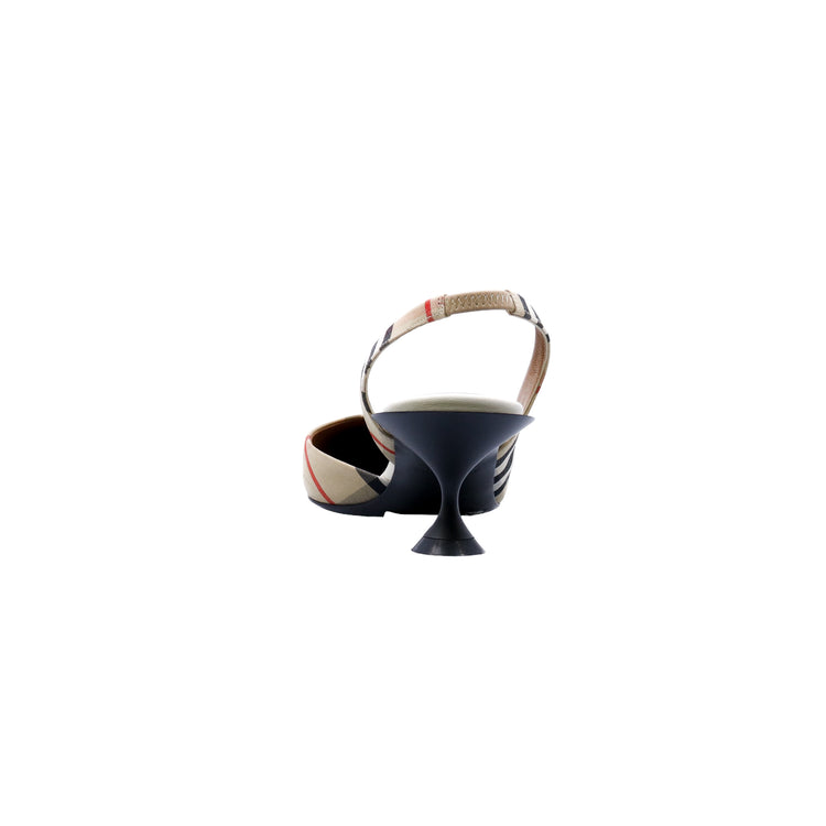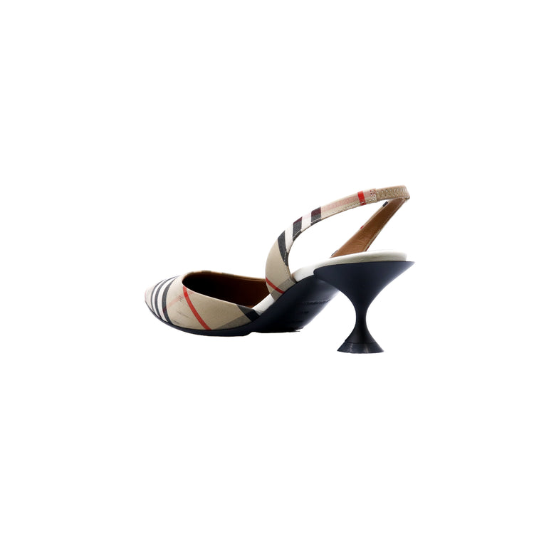 Zapatos de tacón Burberry tipo slingbacks, confeccionados en piel y lona Archive Check Beige, suela con poco desgaste por uso y leves rayas por roce en un costado.