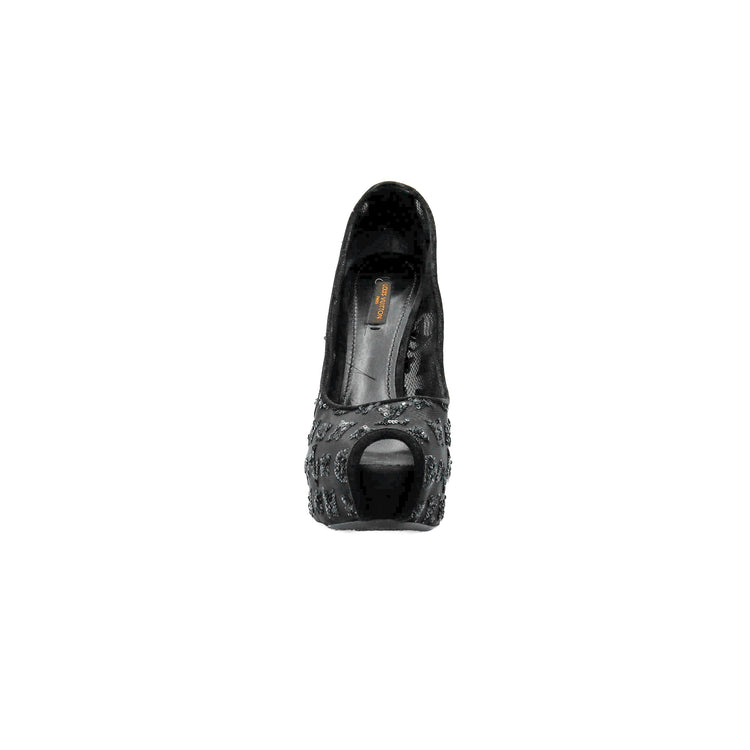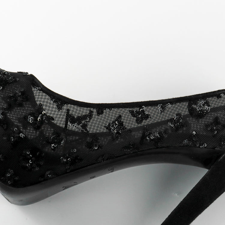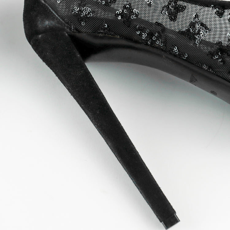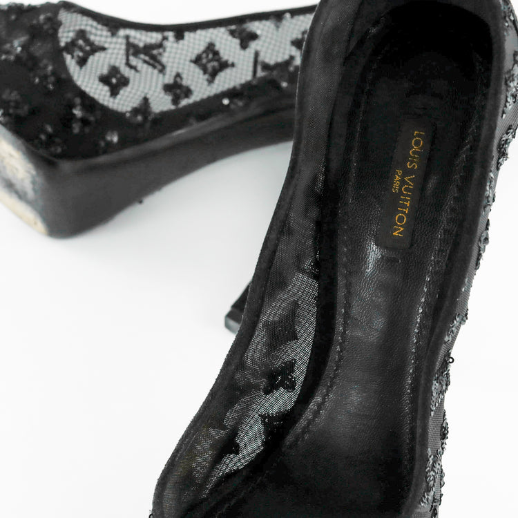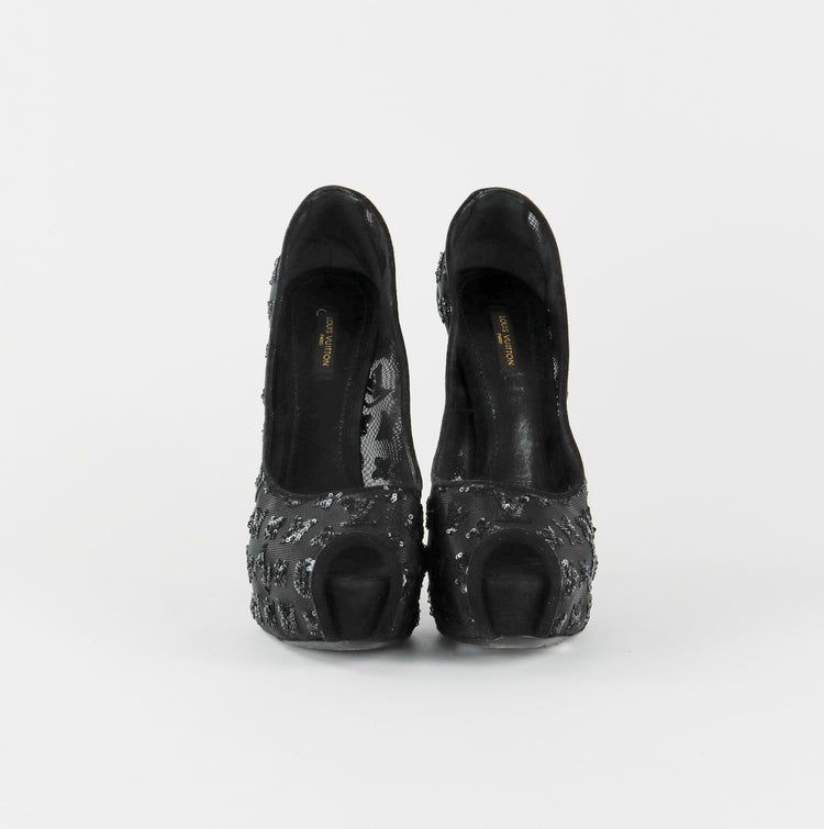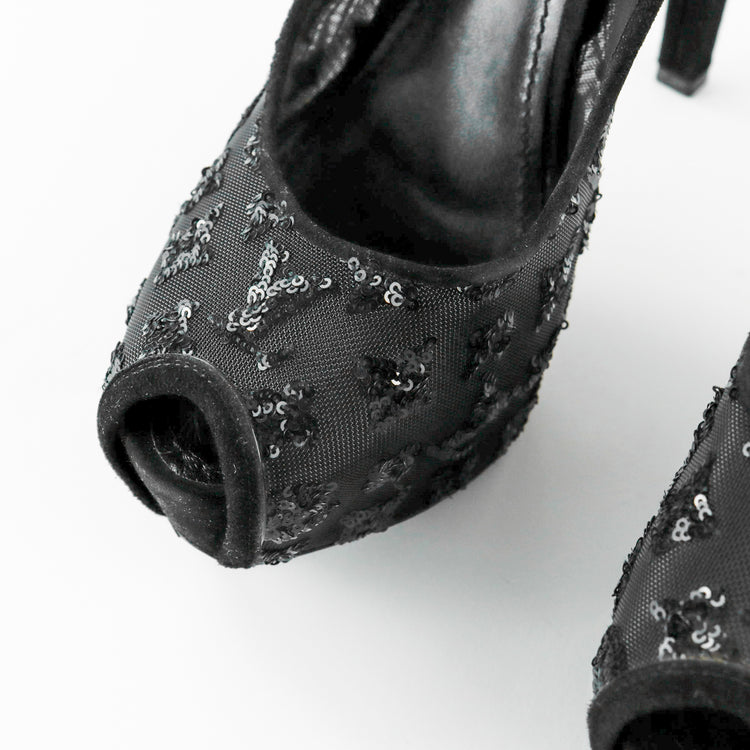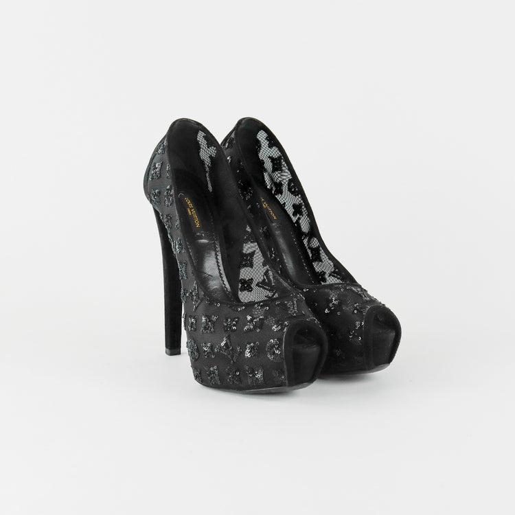 Zapatos de tacón Louis Vuitton, tipo peep toe confeccionados en malla negra con monograma en lentejuelas y suela de cuero, tacones en acabado ante con detalles por uso regular.