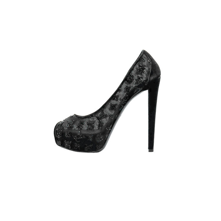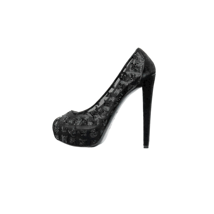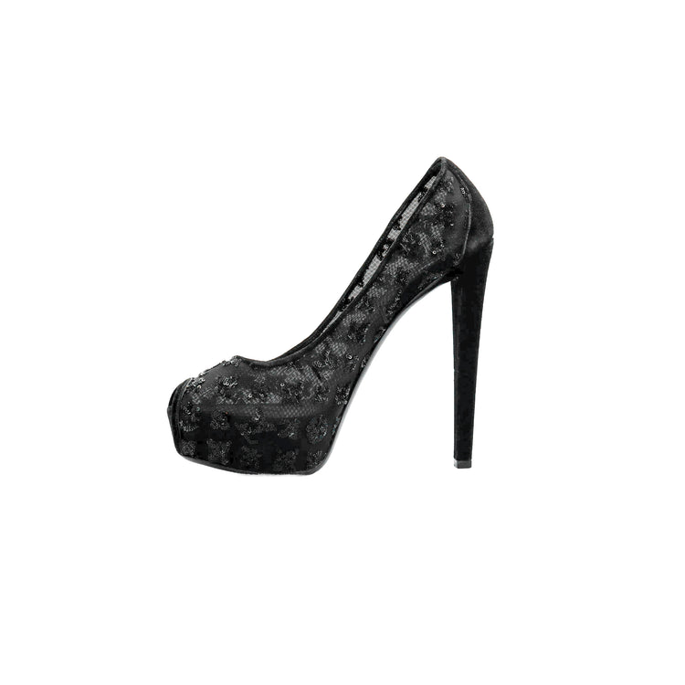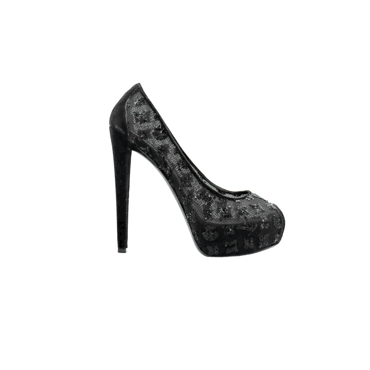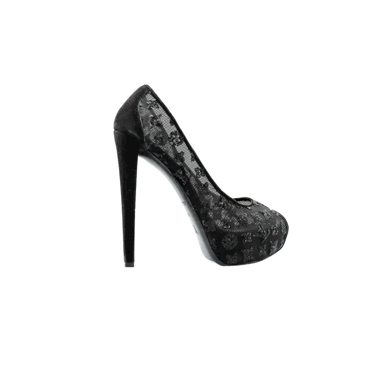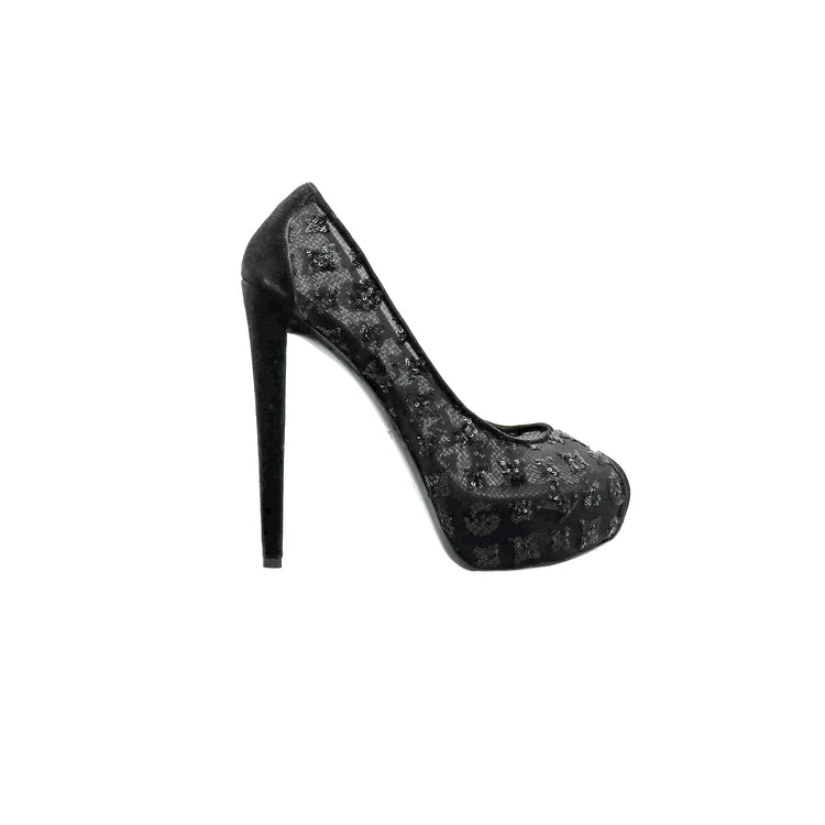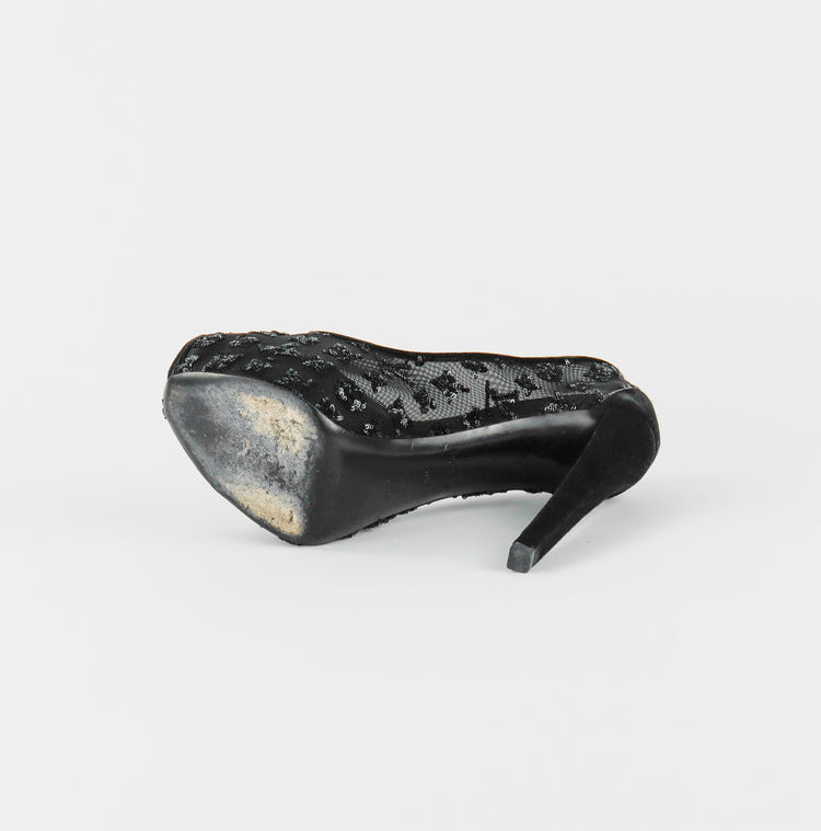 Zapatos de tacón Louis Vuitton, tipo peep toe confeccionados en malla negra con monograma en lentejuelas y suela de cuero, tacones en acabado ante con detalles por uso regular.