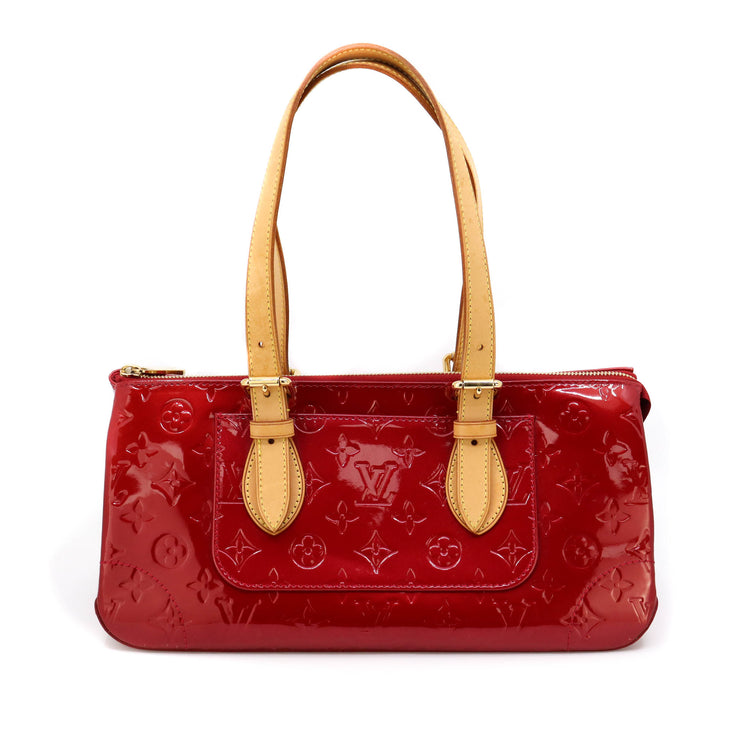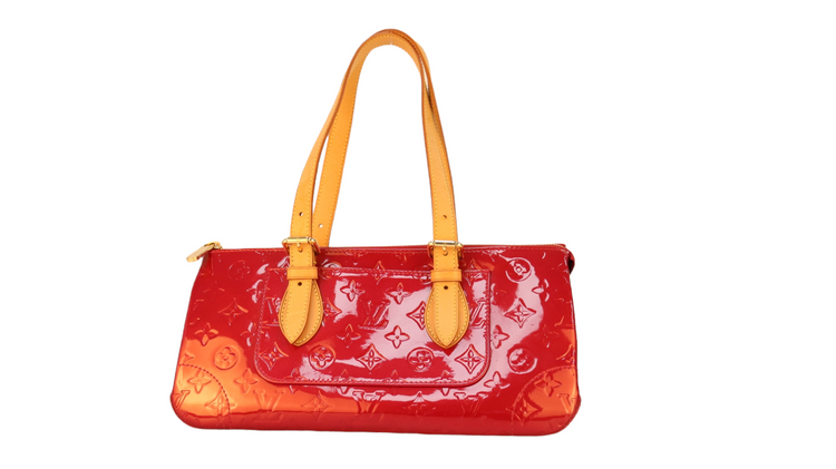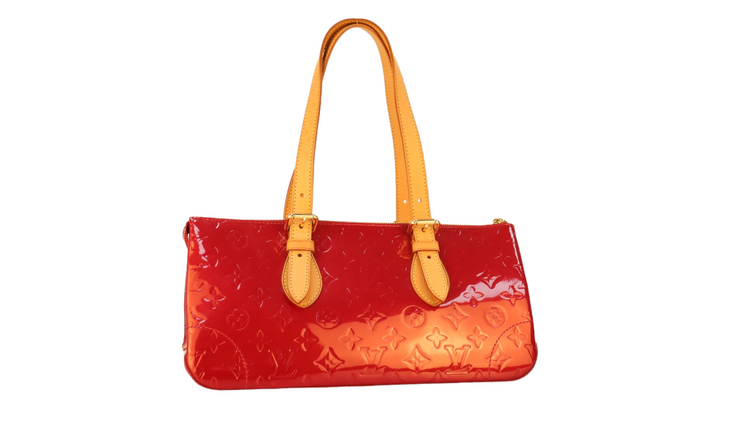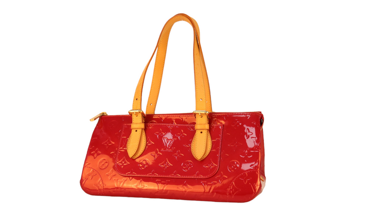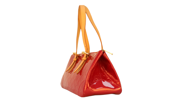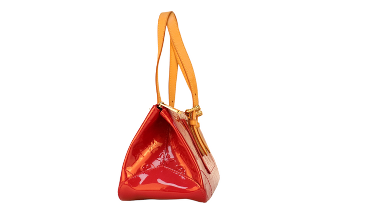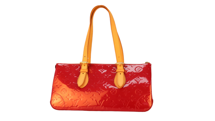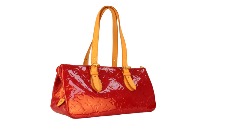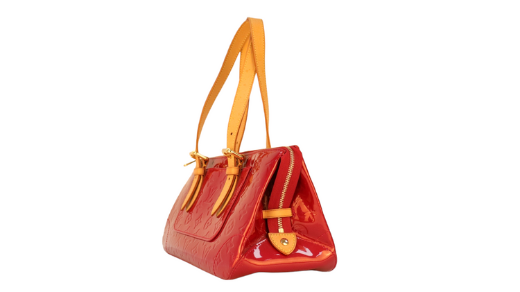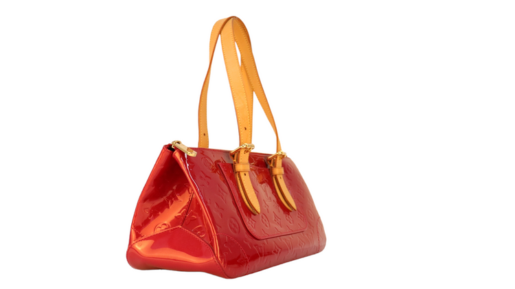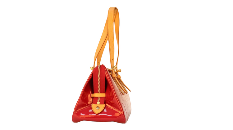 Bolso marca Louis Vuitton, confeccionado en piel Vernis Monogram Pomme D´ Amour, bolsillo plano al frente, dos asas ajustables con hebilla fabricadas en piel natural color marrón. Interior forrado en tela color rojo con un bolsillo plano.