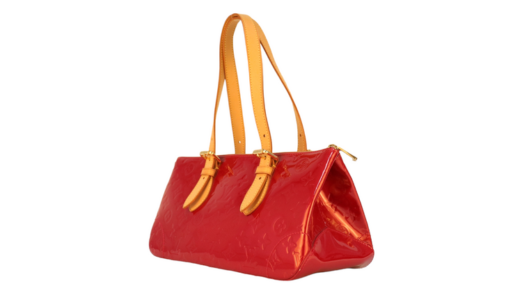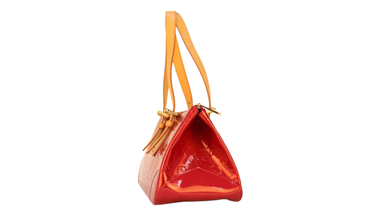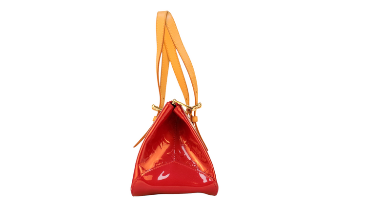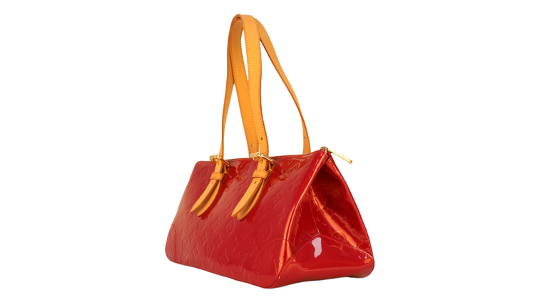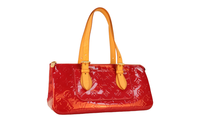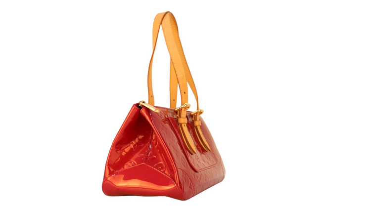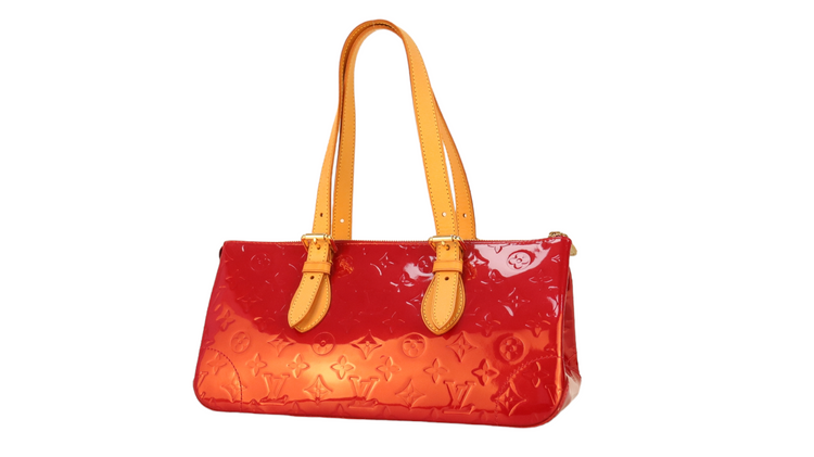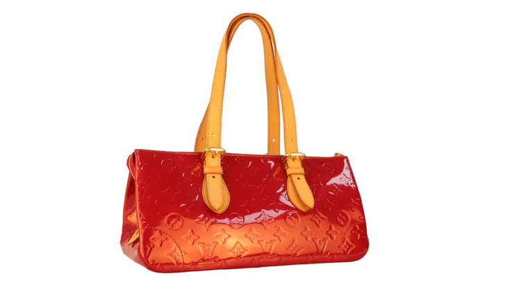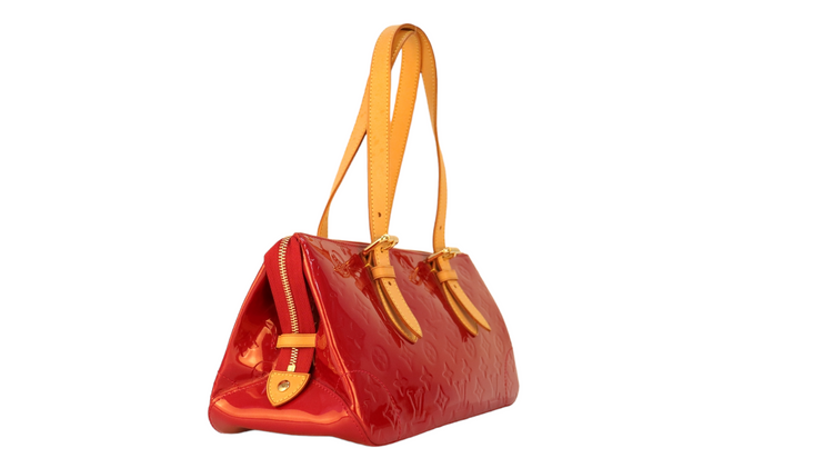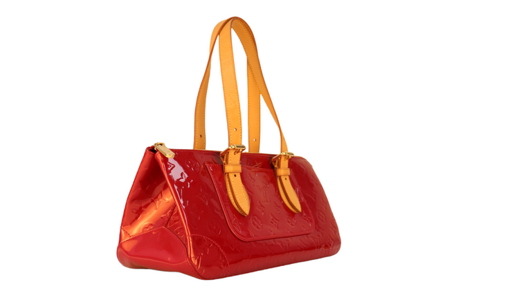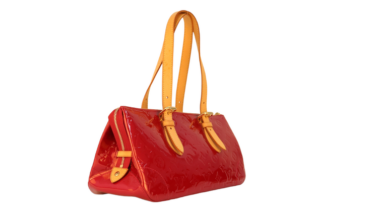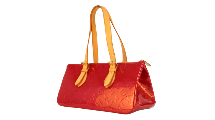Bolso marca Louis Vuitton, confeccionado en piel Vernis Monogram Pomme D´ Amour, bolsillo plano al frente, dos asas ajustables con hebilla fabricadas en piel natural color marrón. Interior forrado en tela color rojo con un bolsillo plano.