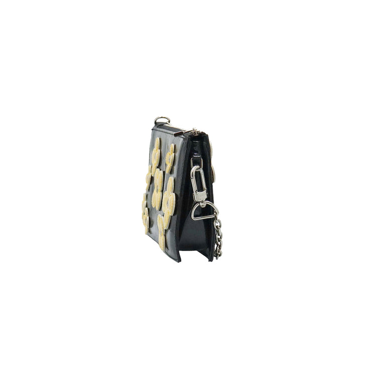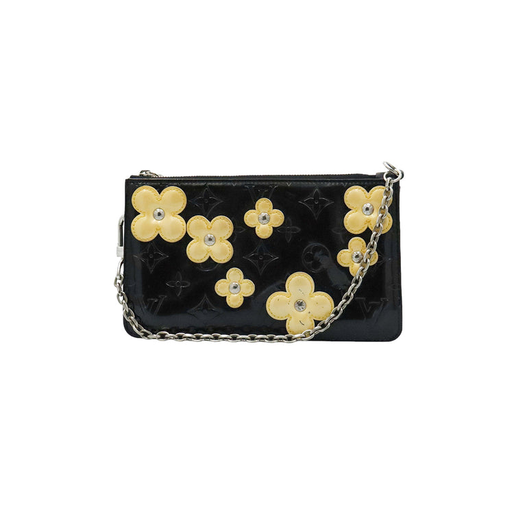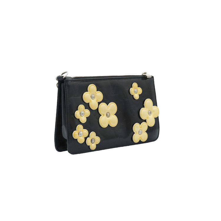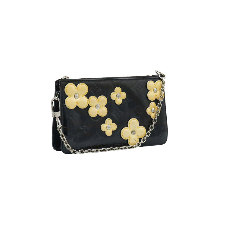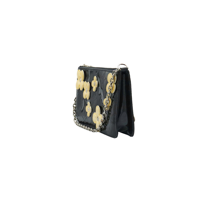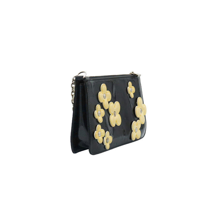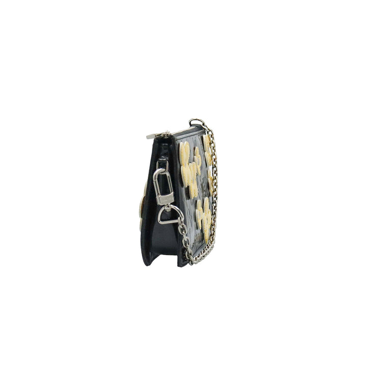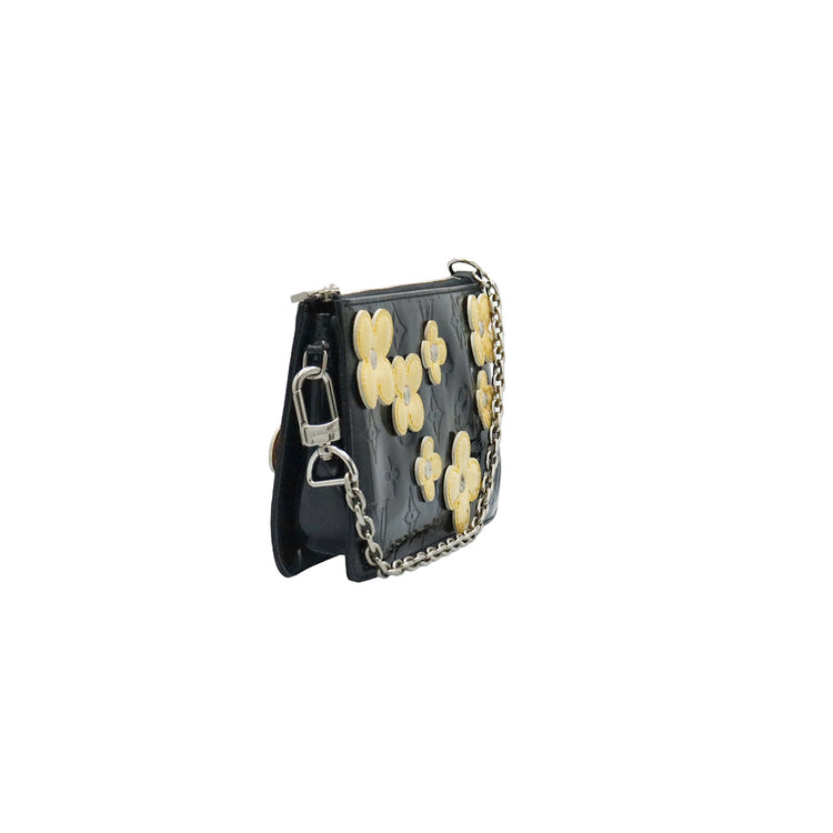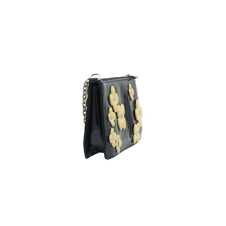 Mini Pochette Fleurs Lexington Louis Vuitton, confeccionado en piel vernis color negro con flores en color beige, manchada por dentro y fuer, herrajes en color plateado.