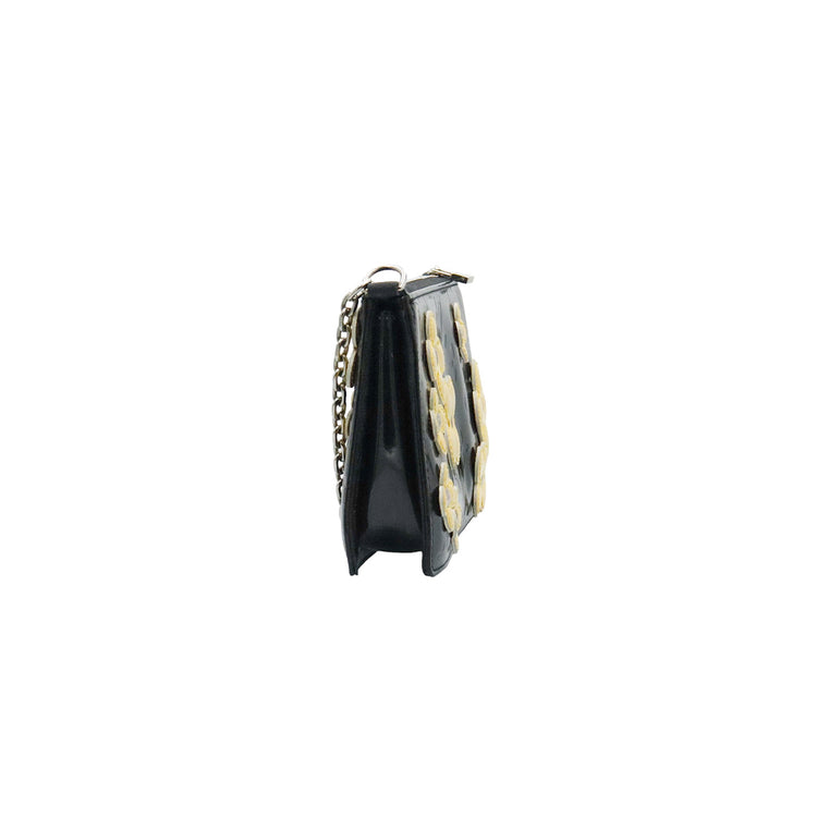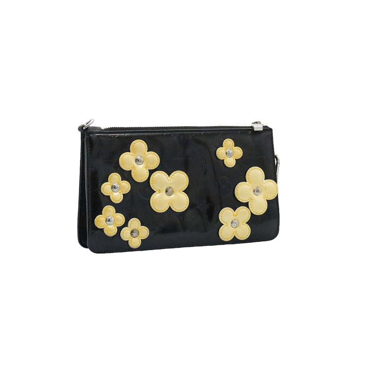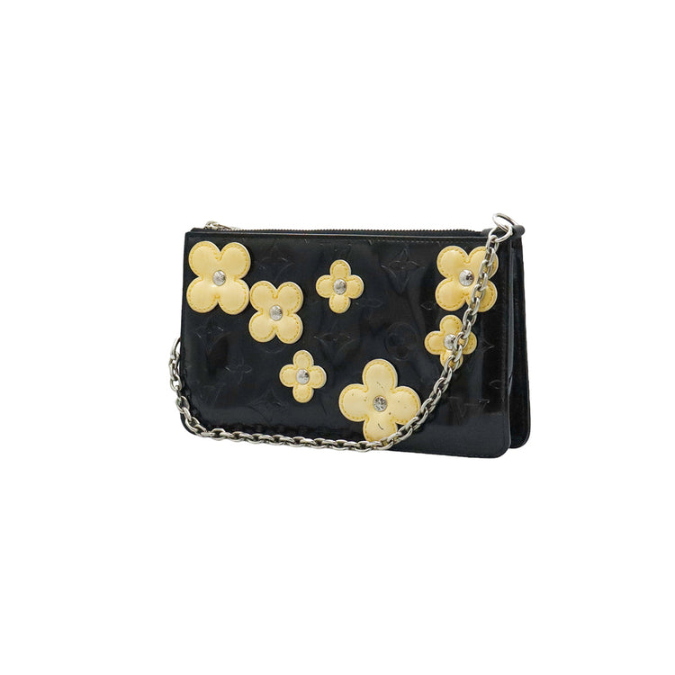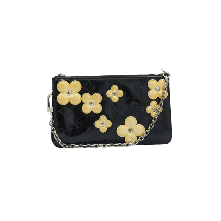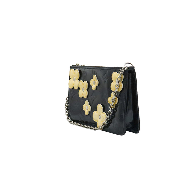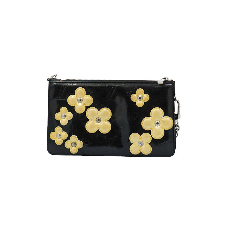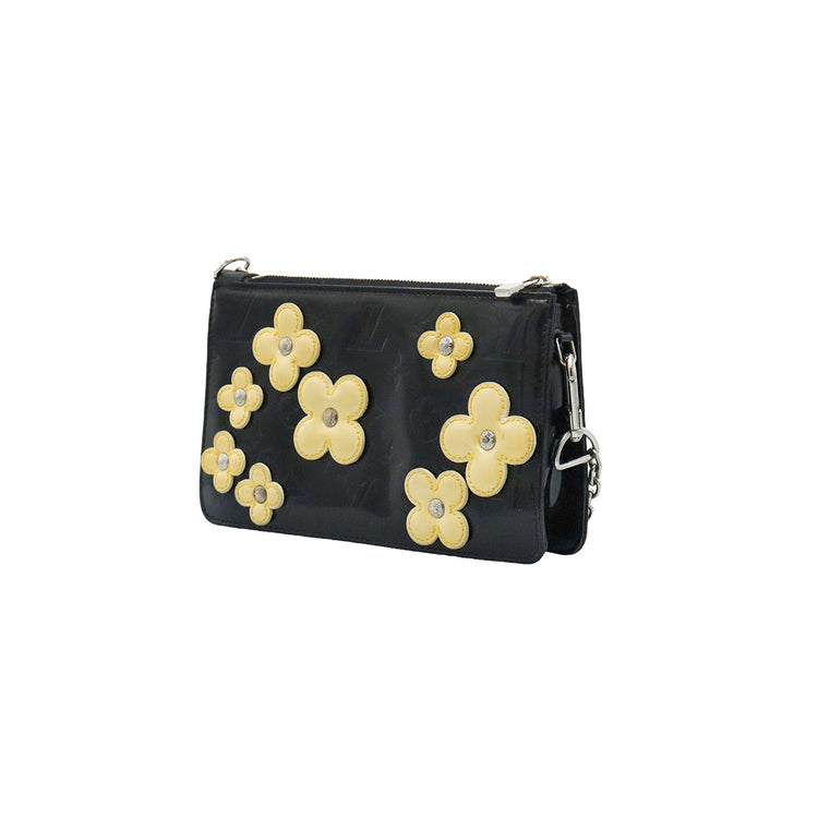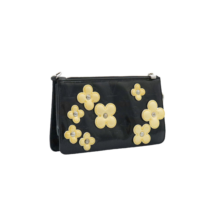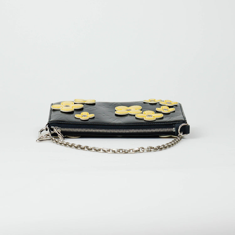 Mini Pochette Fleurs Lexington Louis Vuitton, confeccionado en piel vernis color negro con flores en color beige, manchada por dentro y fuer, herrajes en color plateado.