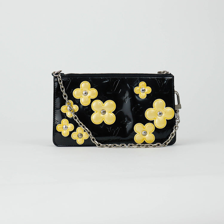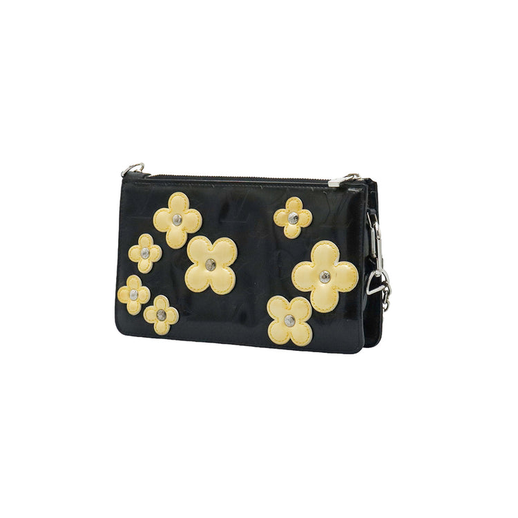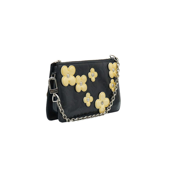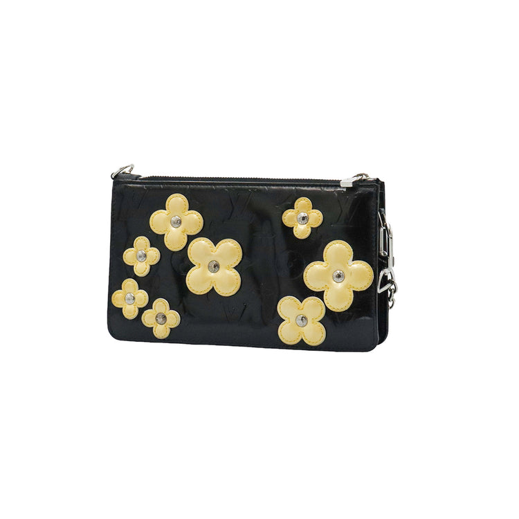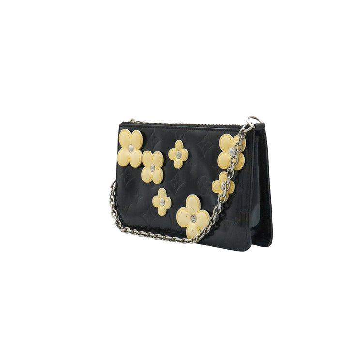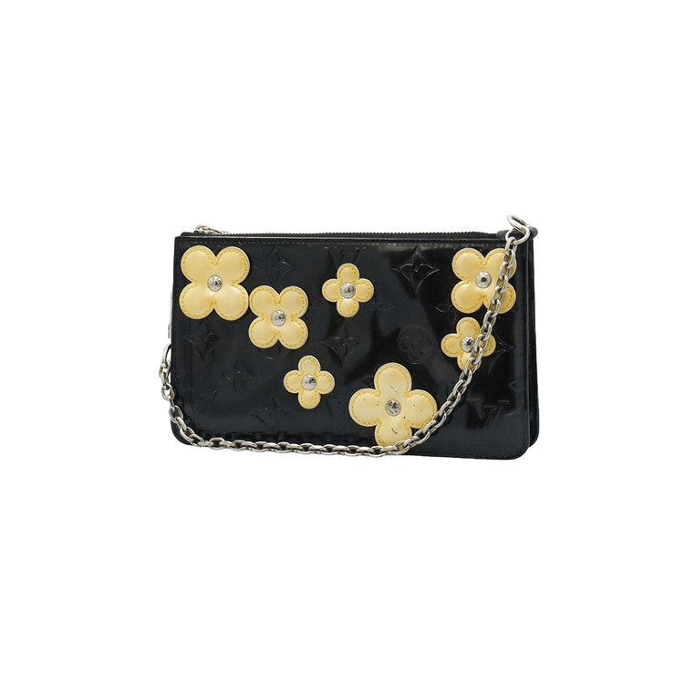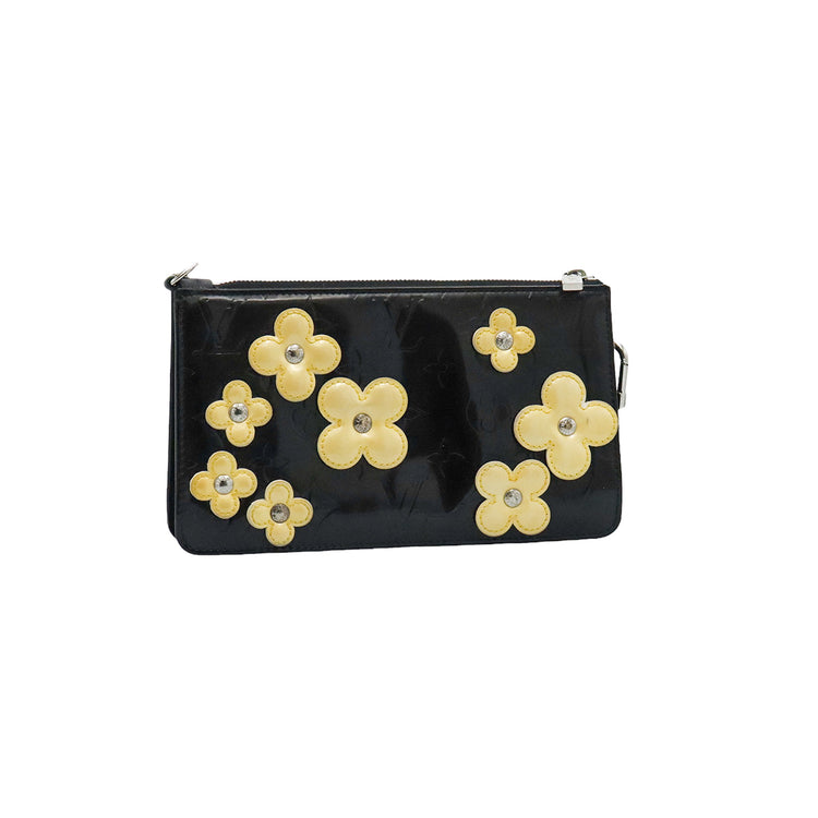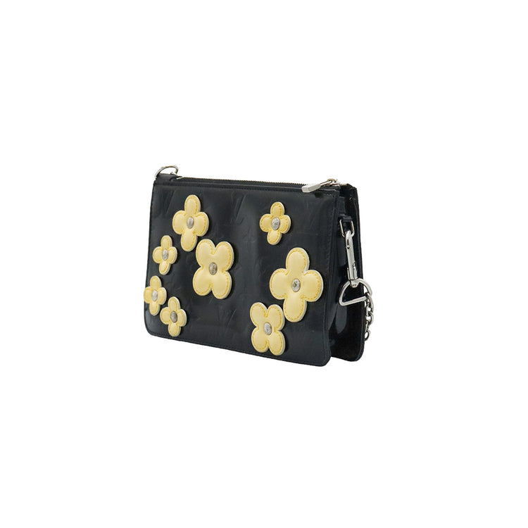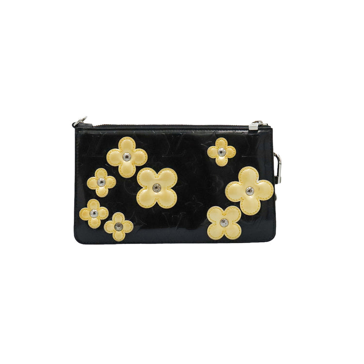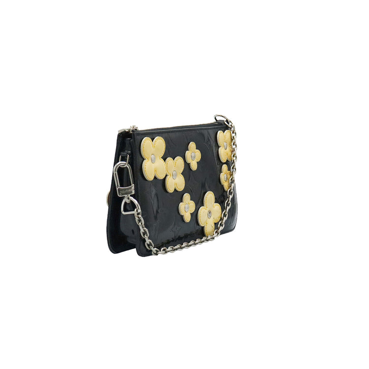 Mini Pochette Fleurs Lexington Louis Vuitton, confeccionado en piel vernis color negro con flores en color beige, manchada por dentro y fuer, herrajes en color plateado.